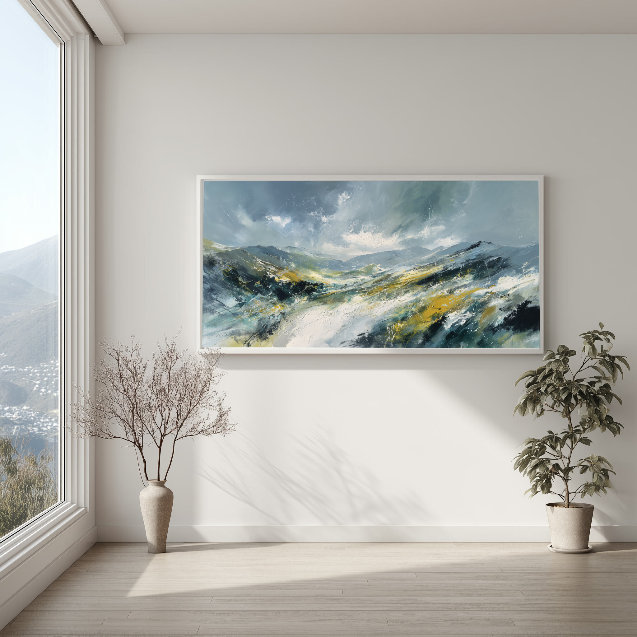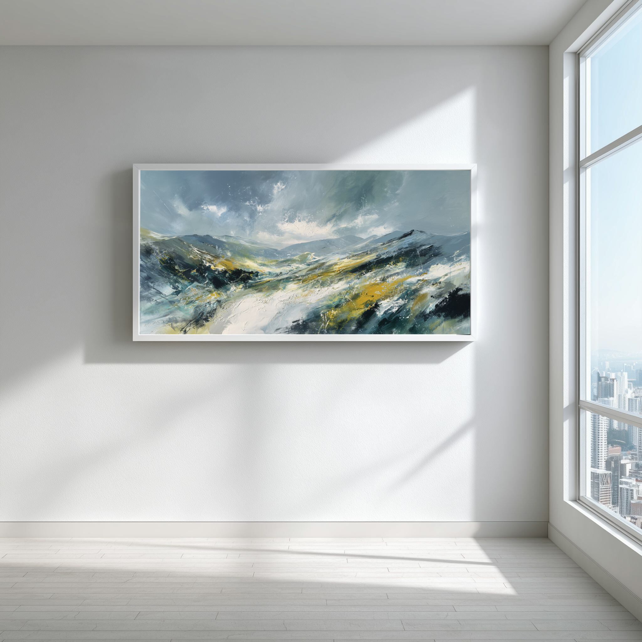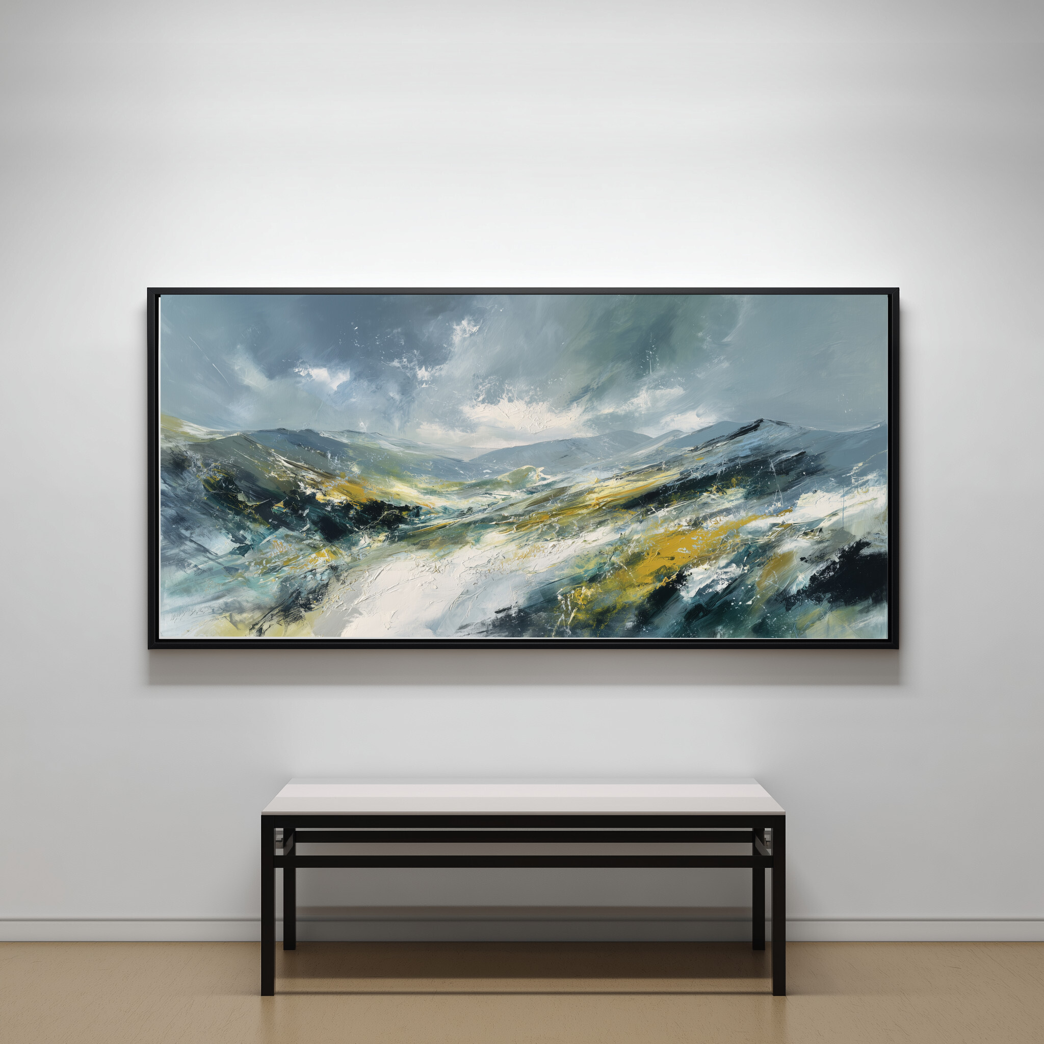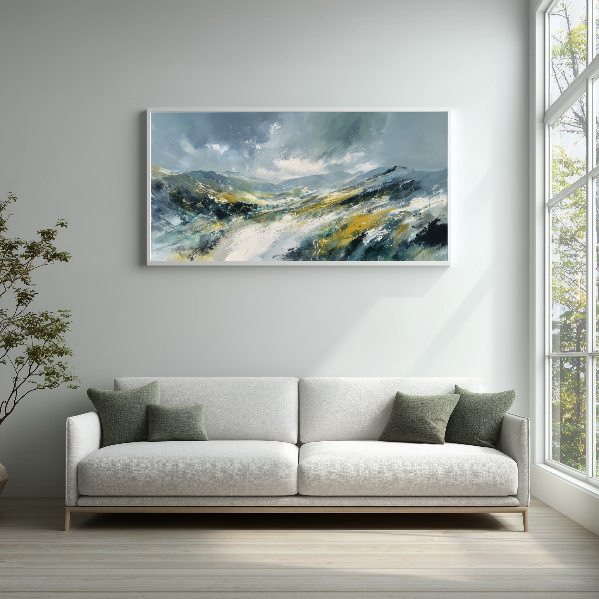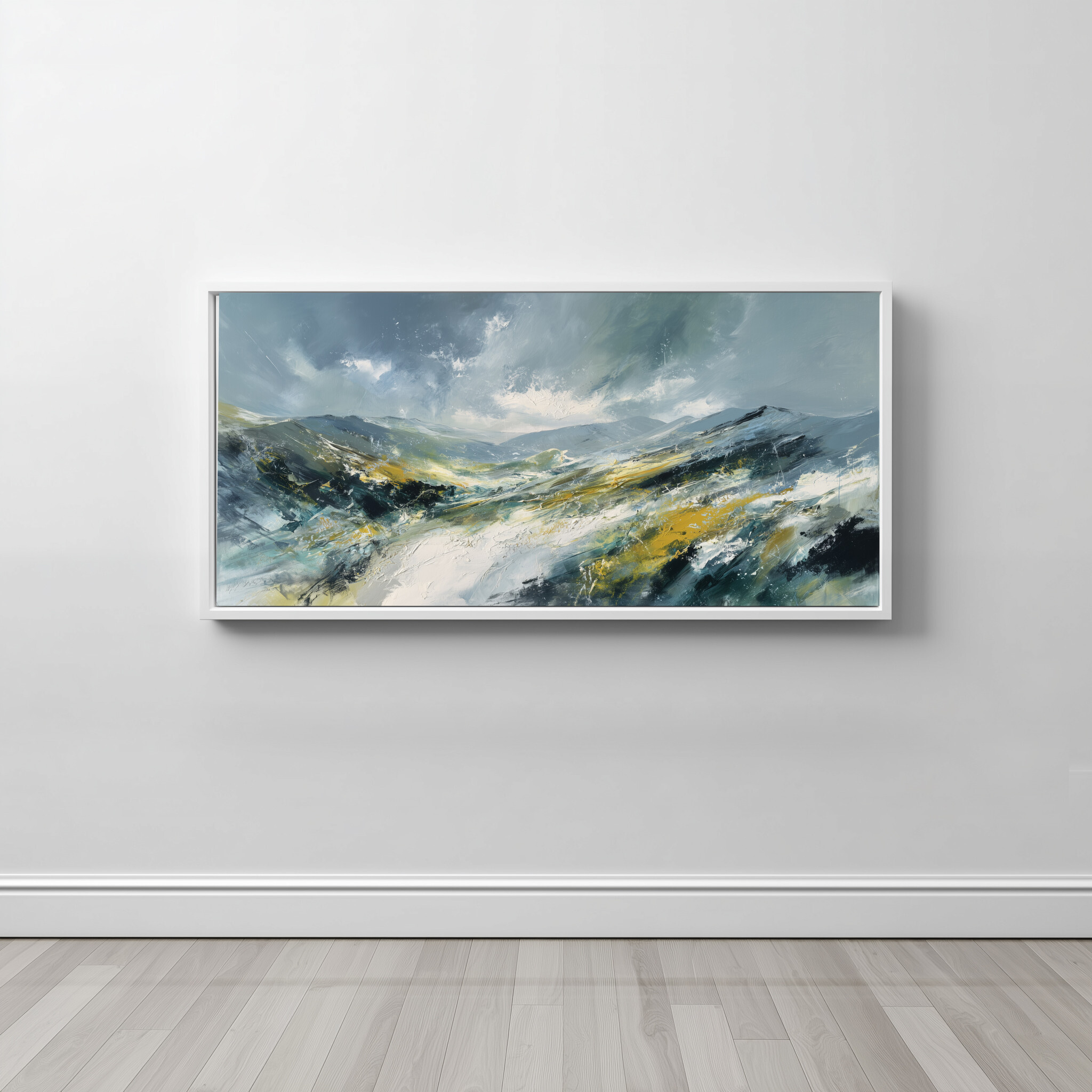Immerse yourself in the abstract beauty of the Scottish Highlands with this stunning piece. Dominated by soothing blue hues, the artwork captures the essence of highland landscapes in a modern style. The interplay of colour and form invites you to explore the depth of the scene with each glance.