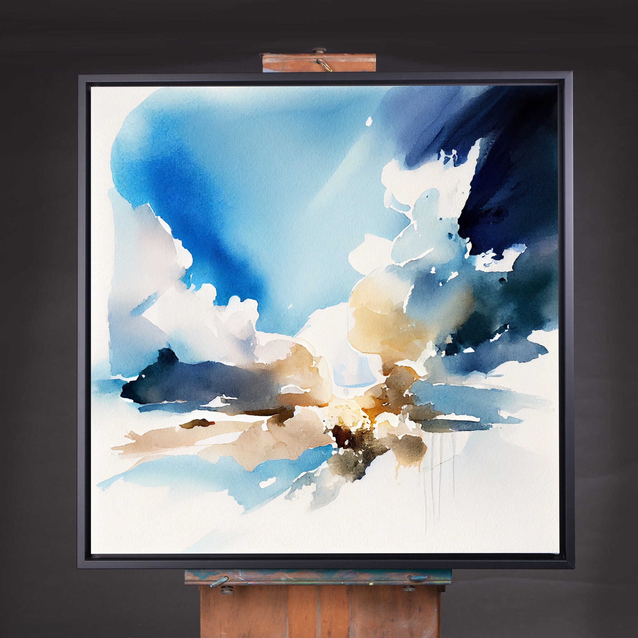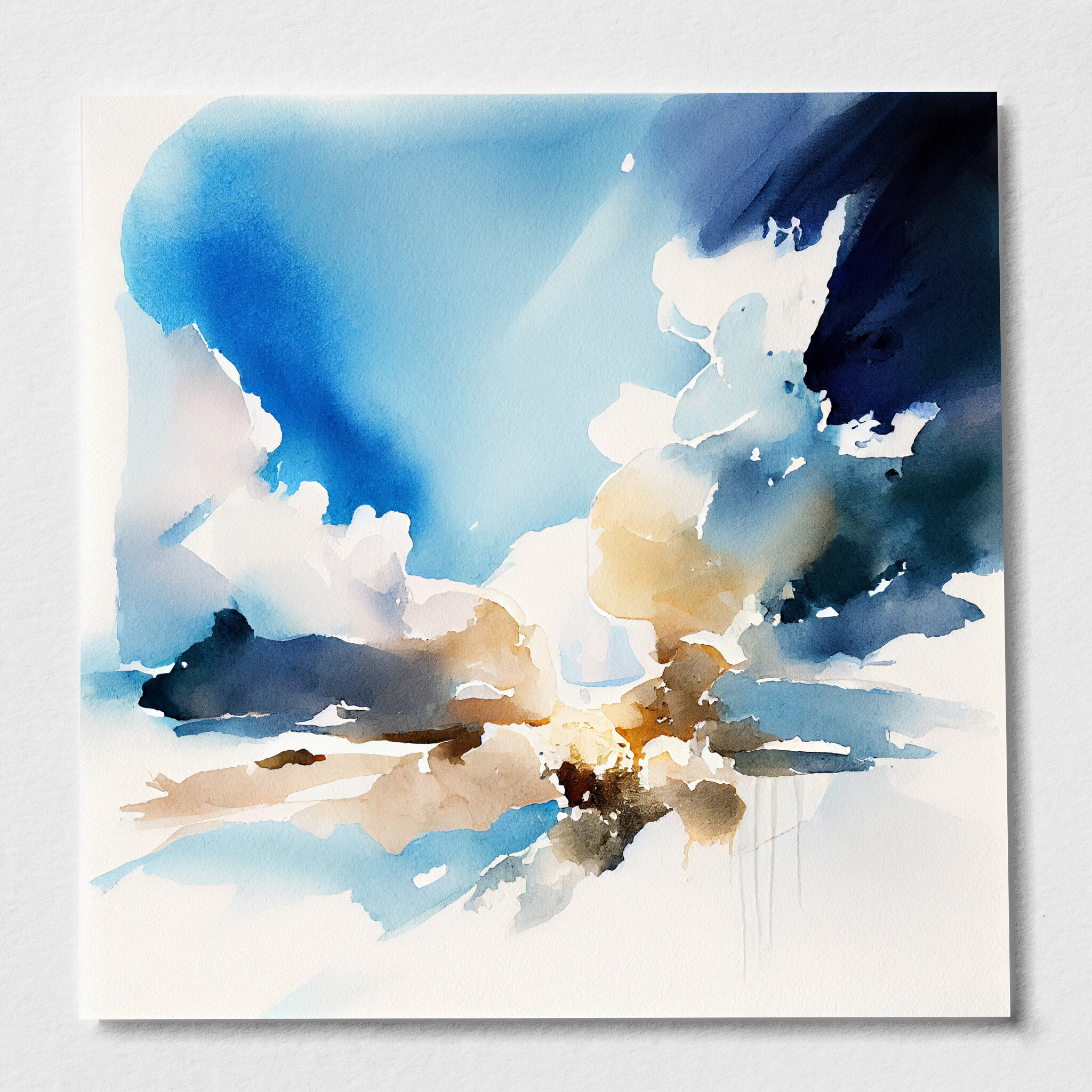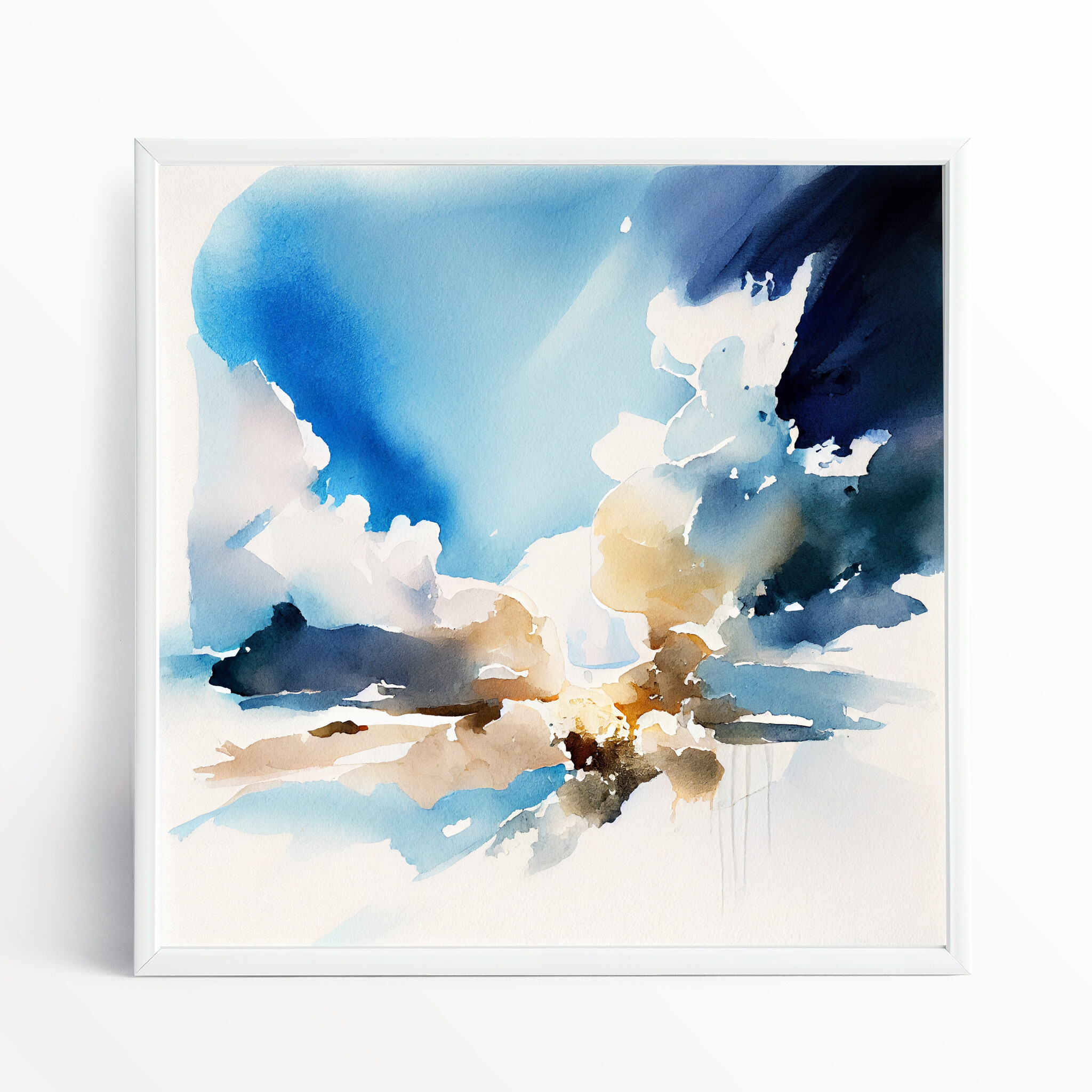 This captivating abstract skyscape features calming blue art intertwined with warm tones, creating a harmonious balance. The modern style and fluid brushstrokes bring the skyscape to life, making it an exquisite piece of wall art. Perfect for those who appreciate abstract landscapes, the artwork captures the serene beauty of the sky.