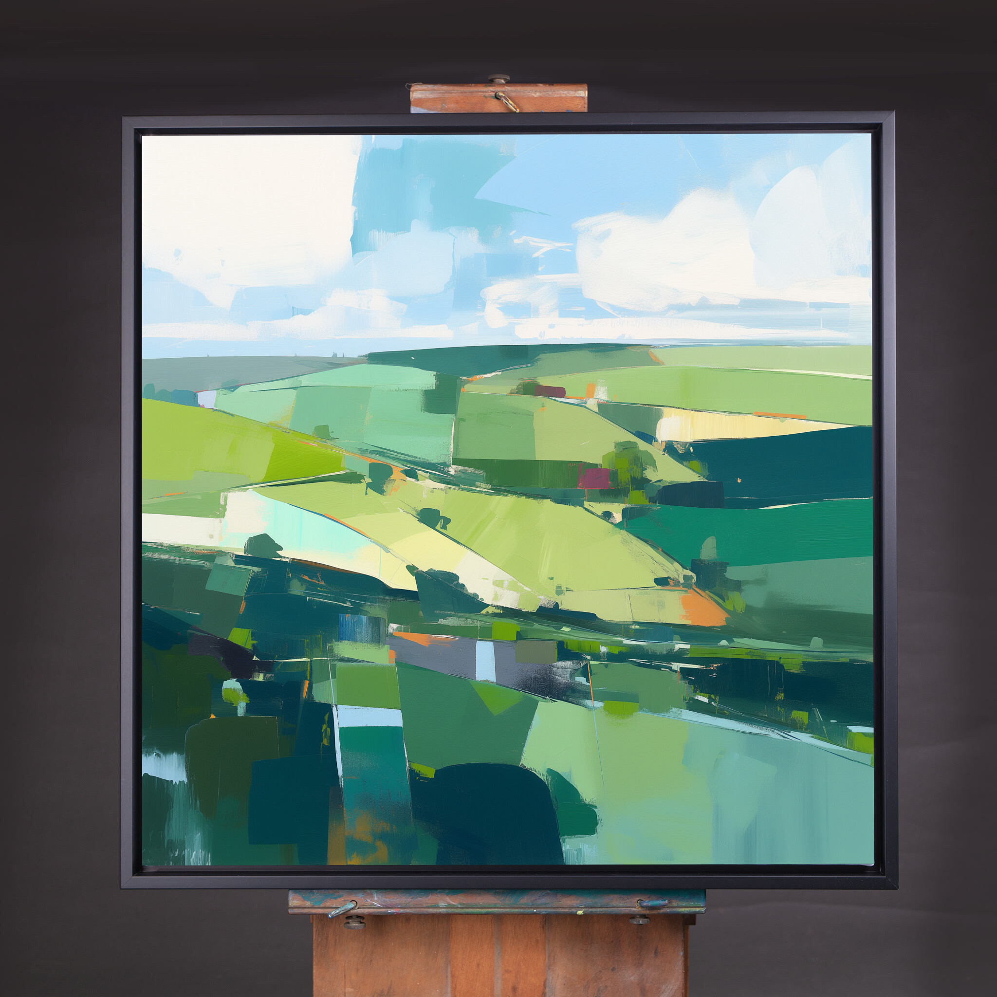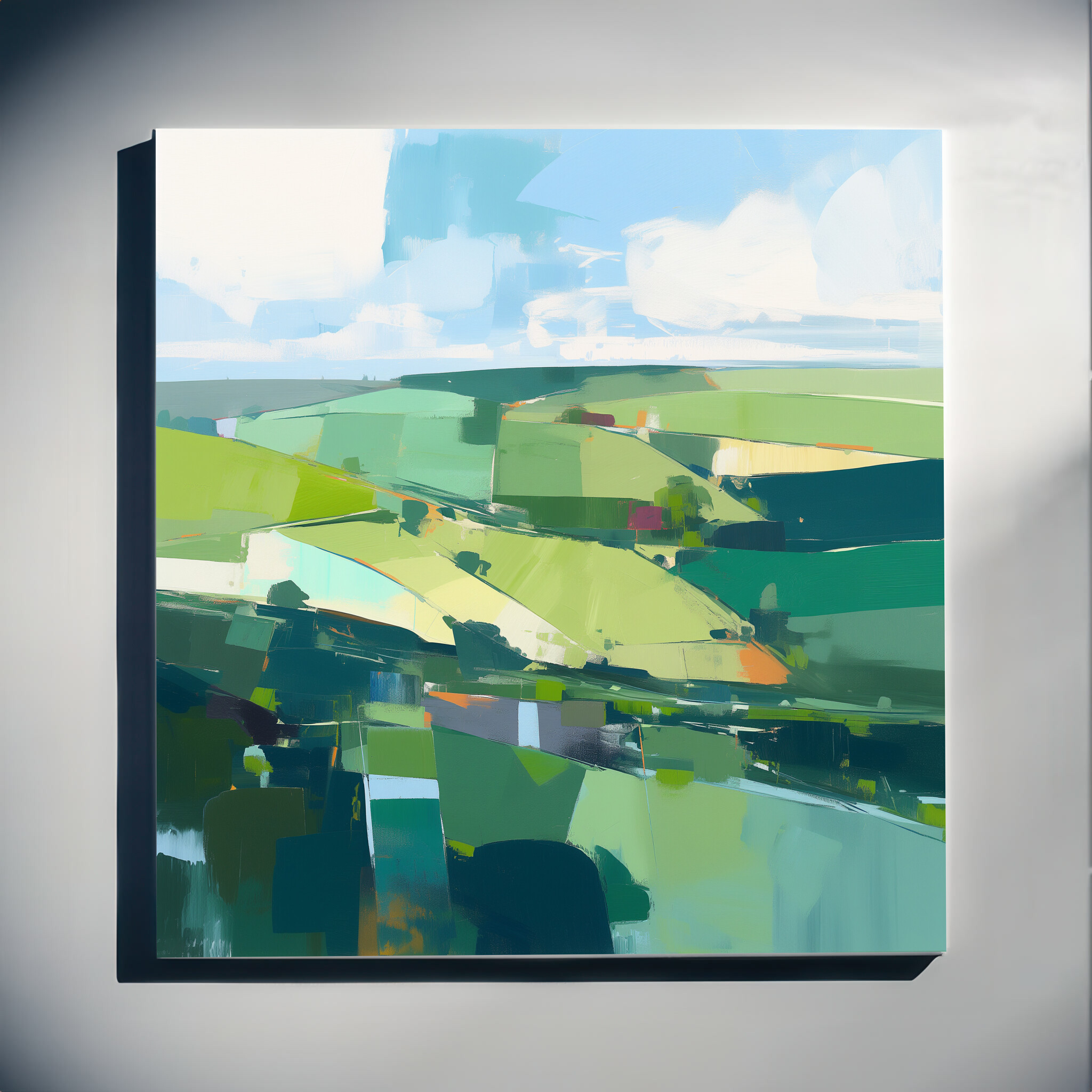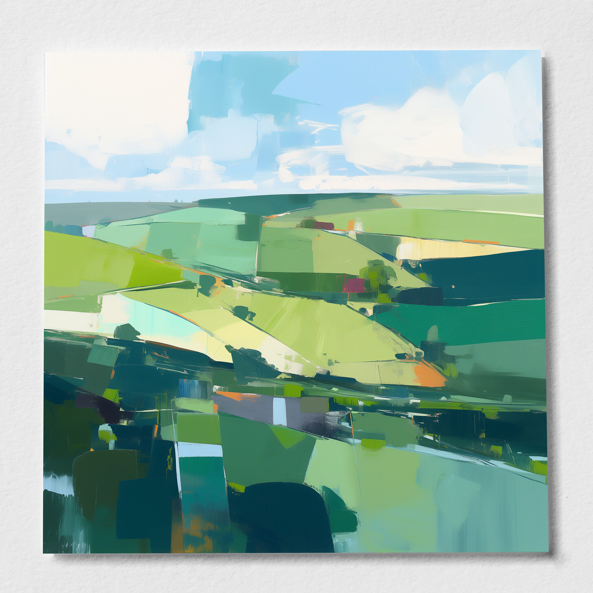 Immerse yourself in the serene beauty of Southdowns with this stunning abstract landscape. Dominated by verdant green hues, the artwork captures the rolling fields and open skies with a modern flair. The abstract style creates a dynamic composition that is both peaceful and invigorating, making it an ideal addition to any home decor.