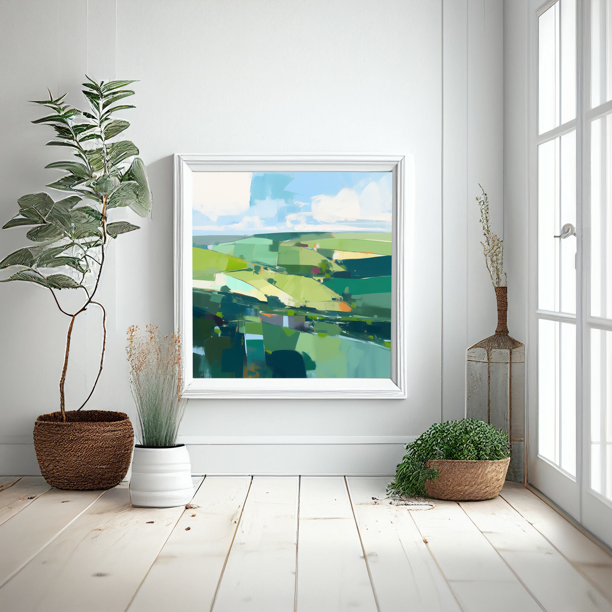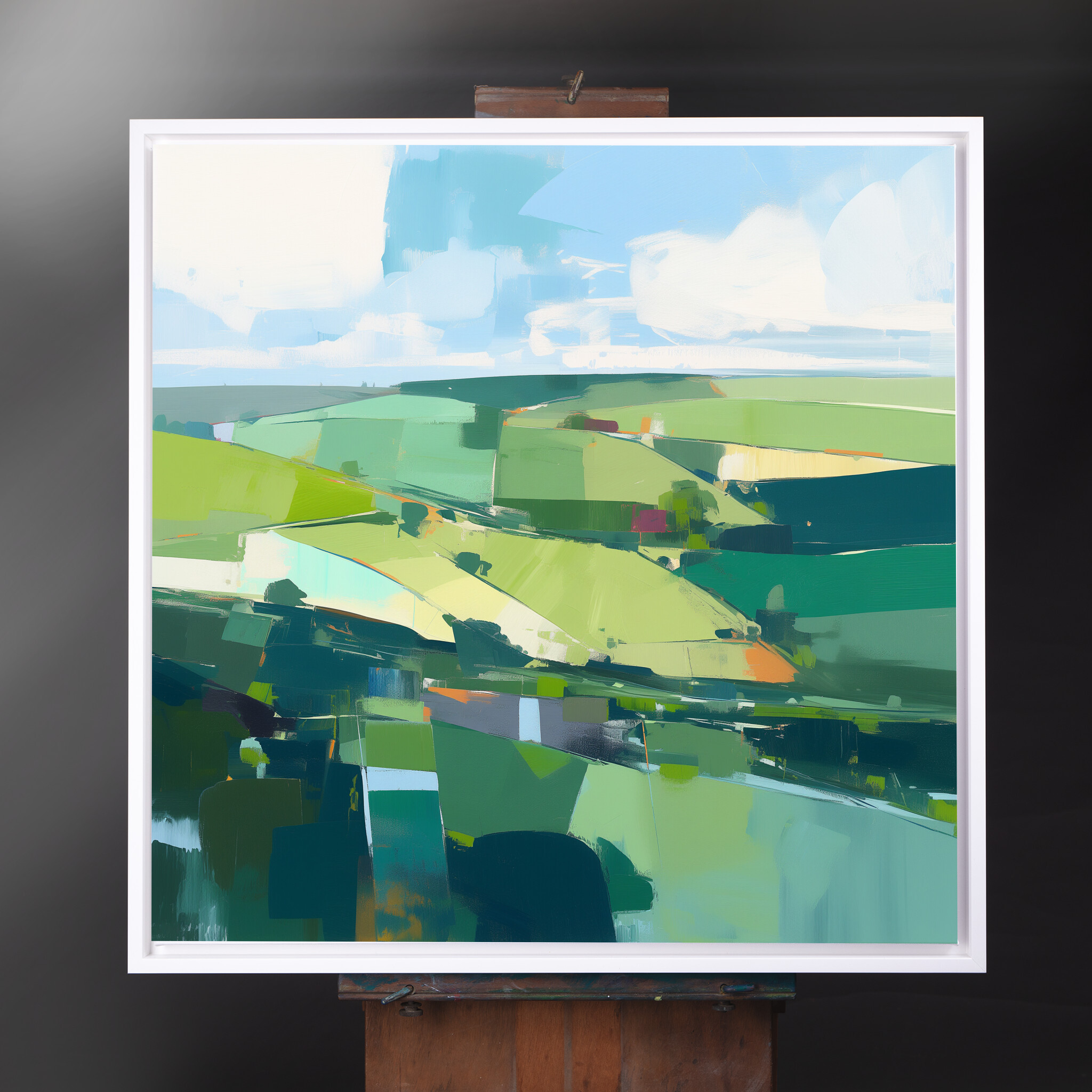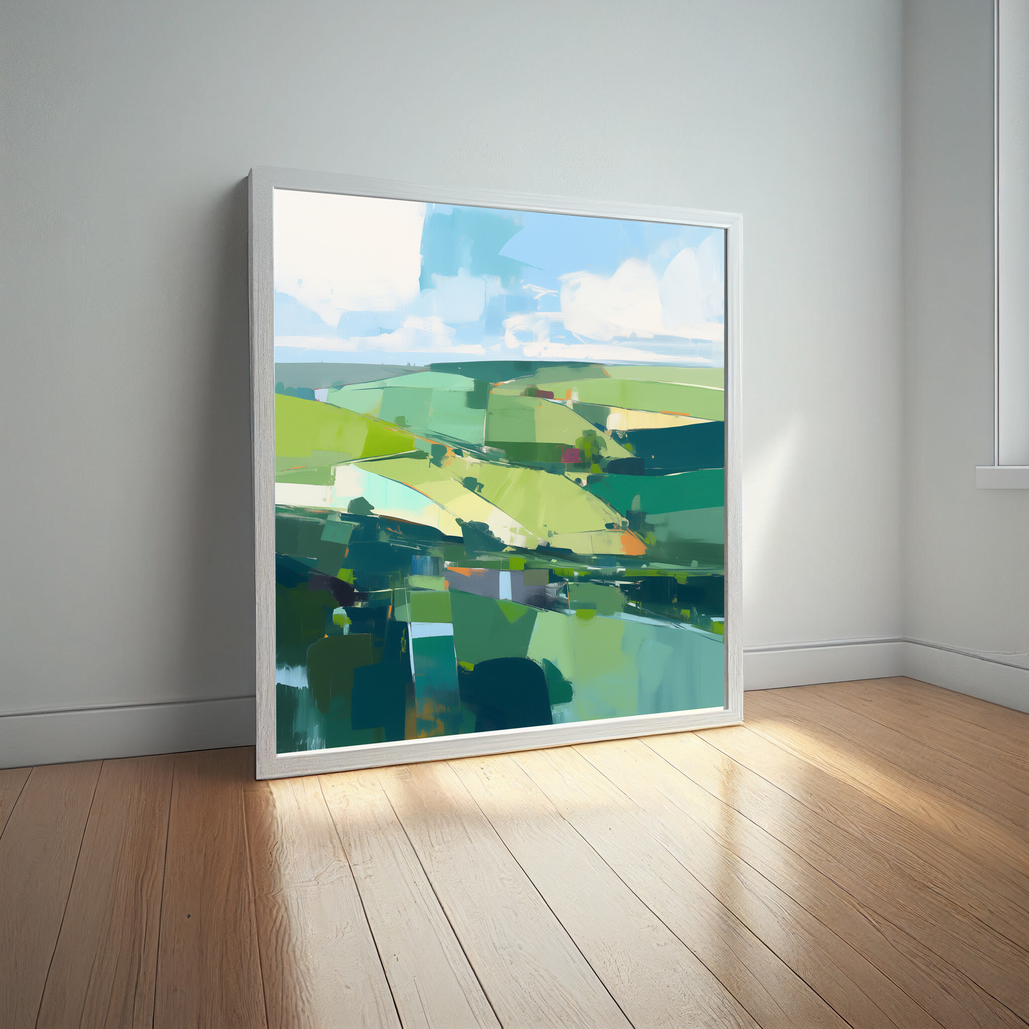 Immerse yourself in the serene beauty of Southdowns with this stunning abstract landscape. Dominated by verdant green hues, the artwork captures the rolling fields and open skies with a modern flair. The abstract style creates a dynamic composition that is both peaceful and invigorating, making it an ideal addition to any home decor.