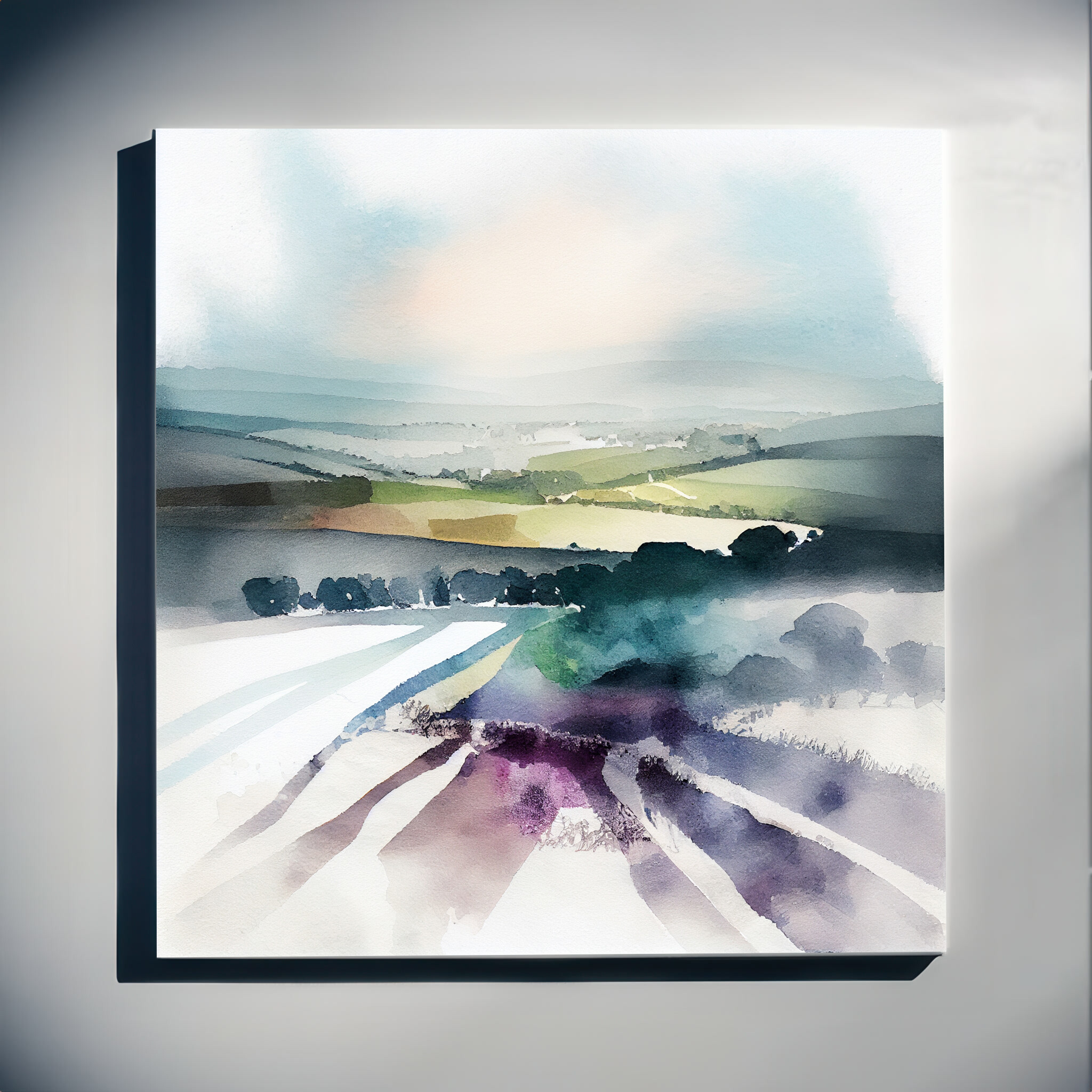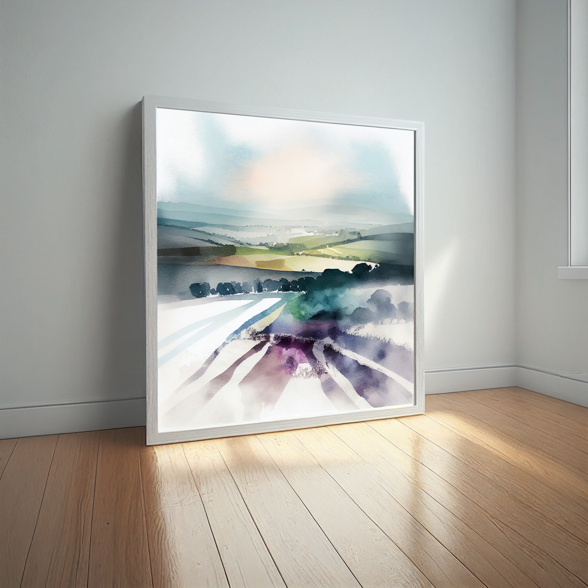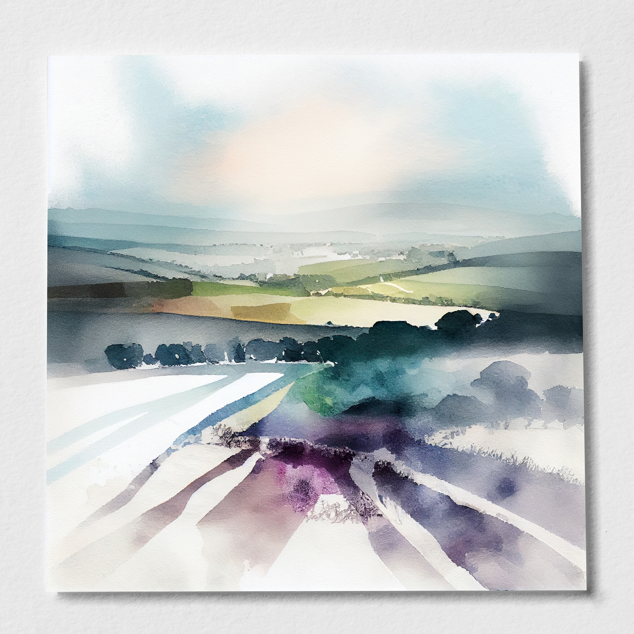 Experience the serene beauty of the Southdowns with this abstract landscape artwork. The piece captures the rolling hills and expansive vistas with soft earth tones and green hues, providing a tranquil and modern aesthetic perfect for your living space.