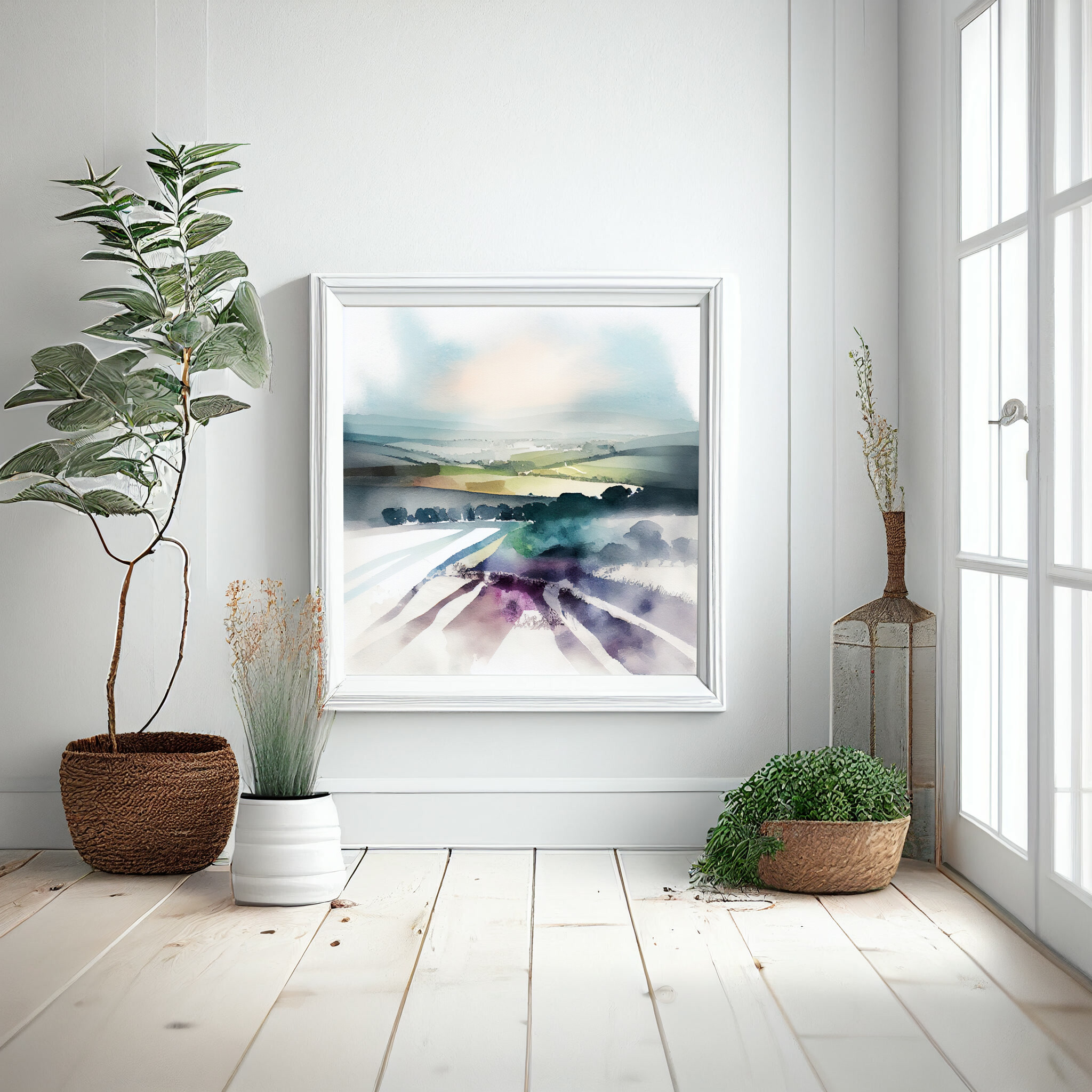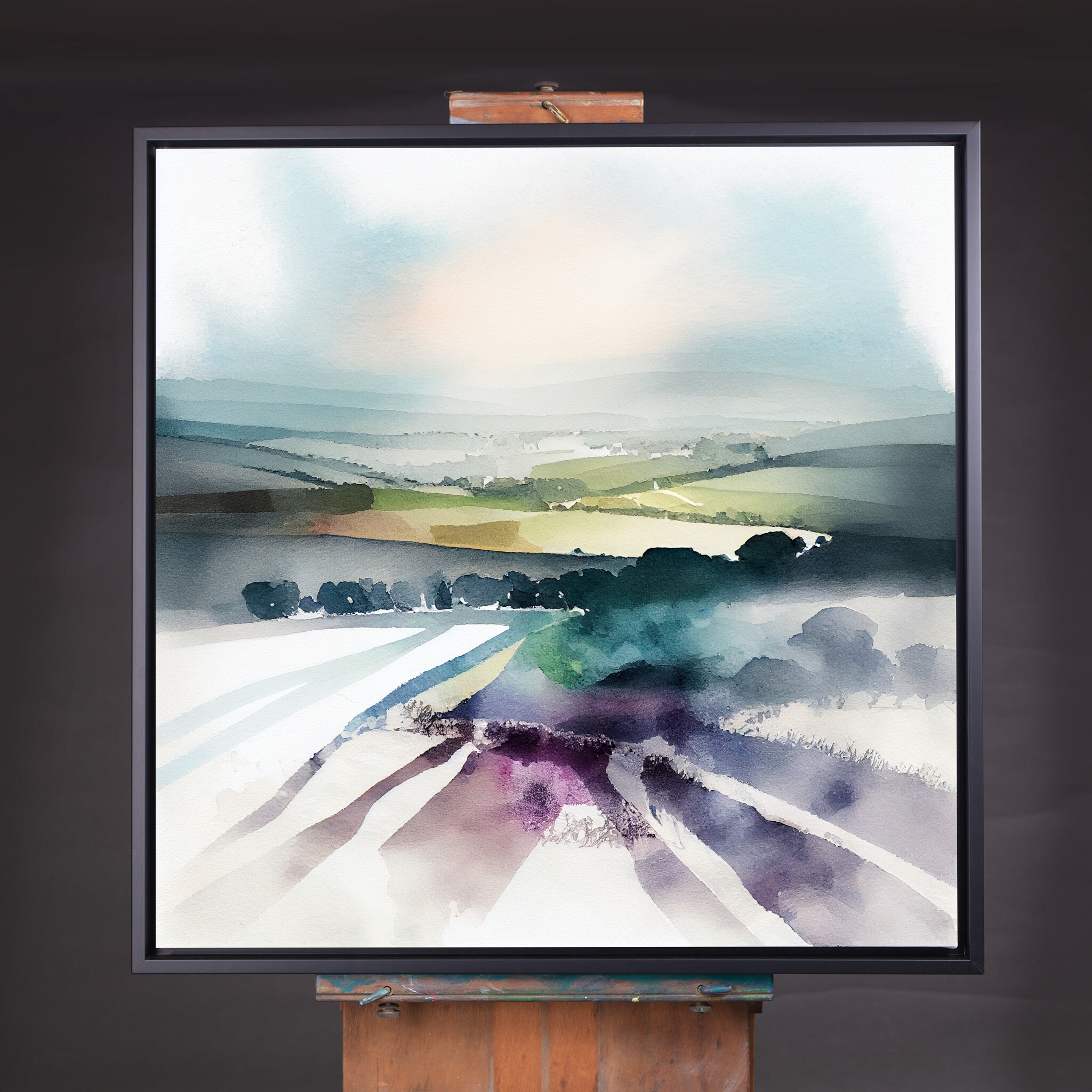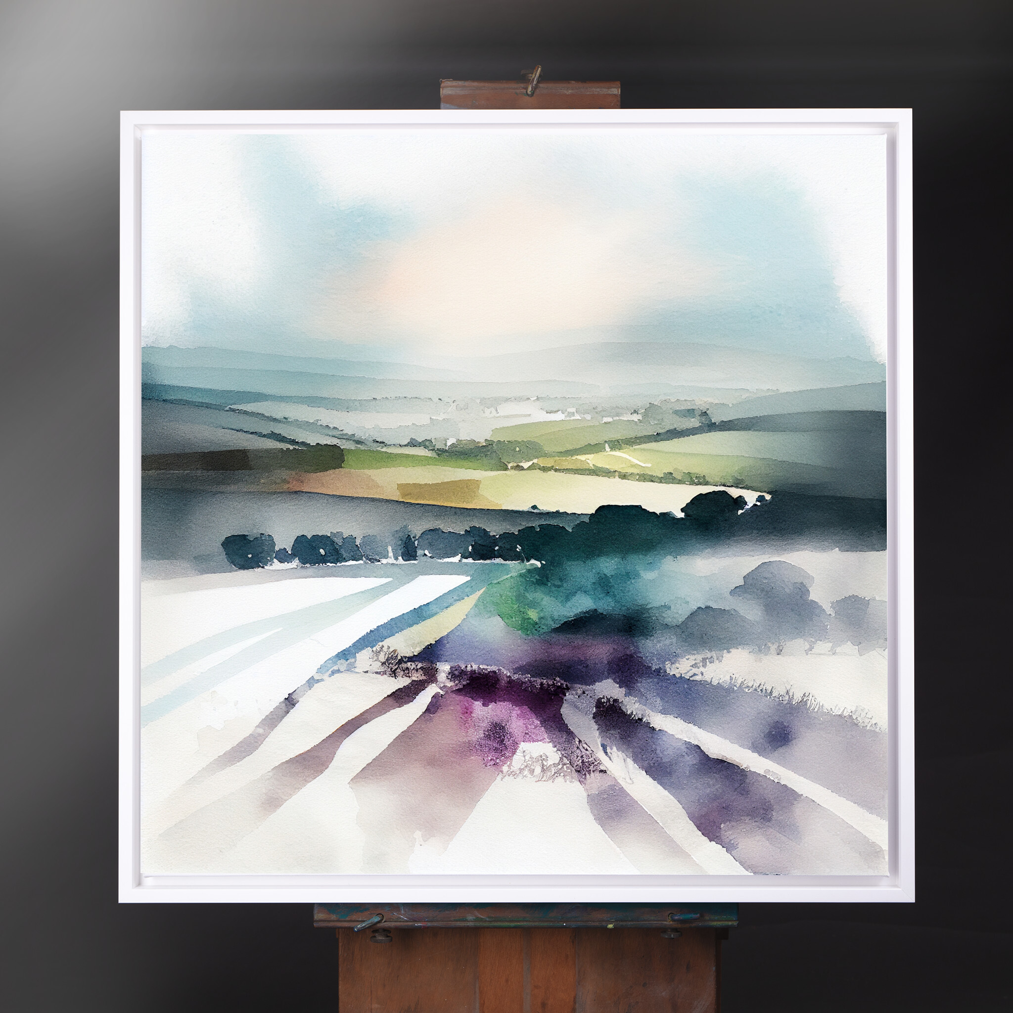 Experience the serene beauty of the Southdowns with this abstract landscape artwork. The piece captures the rolling hills and expansive vistas with soft earth tones and green hues, providing a tranquil and modern aesthetic perfect for your living space.