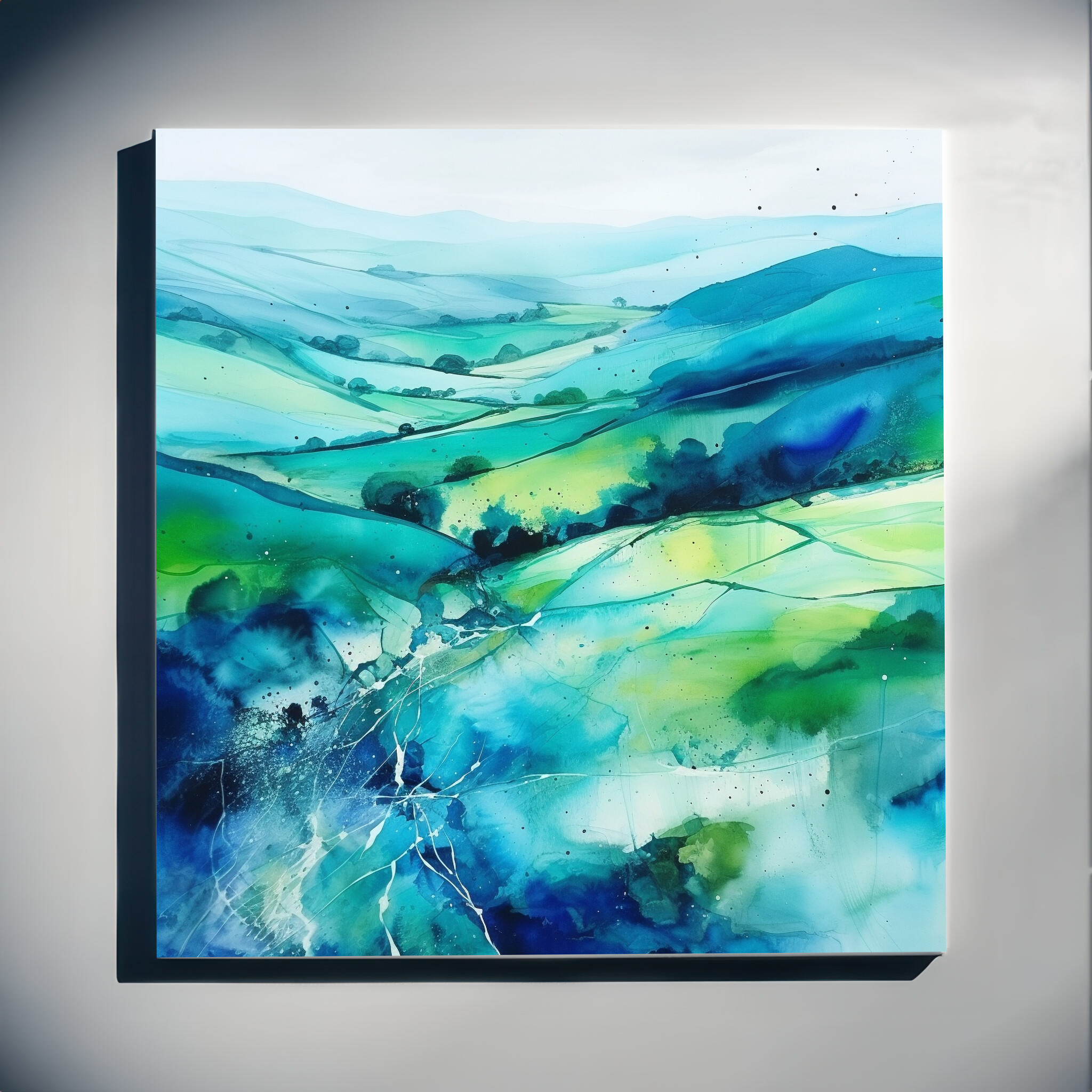 This abstract landscape captures the serene beauty of the Southdowns, rendered in calming blues and vibrant greens. With shades that suggest rolling fields and open skies, this piece exhibits a modern style that evokes tranquility and depth — perfect as a striking focal point in any space.