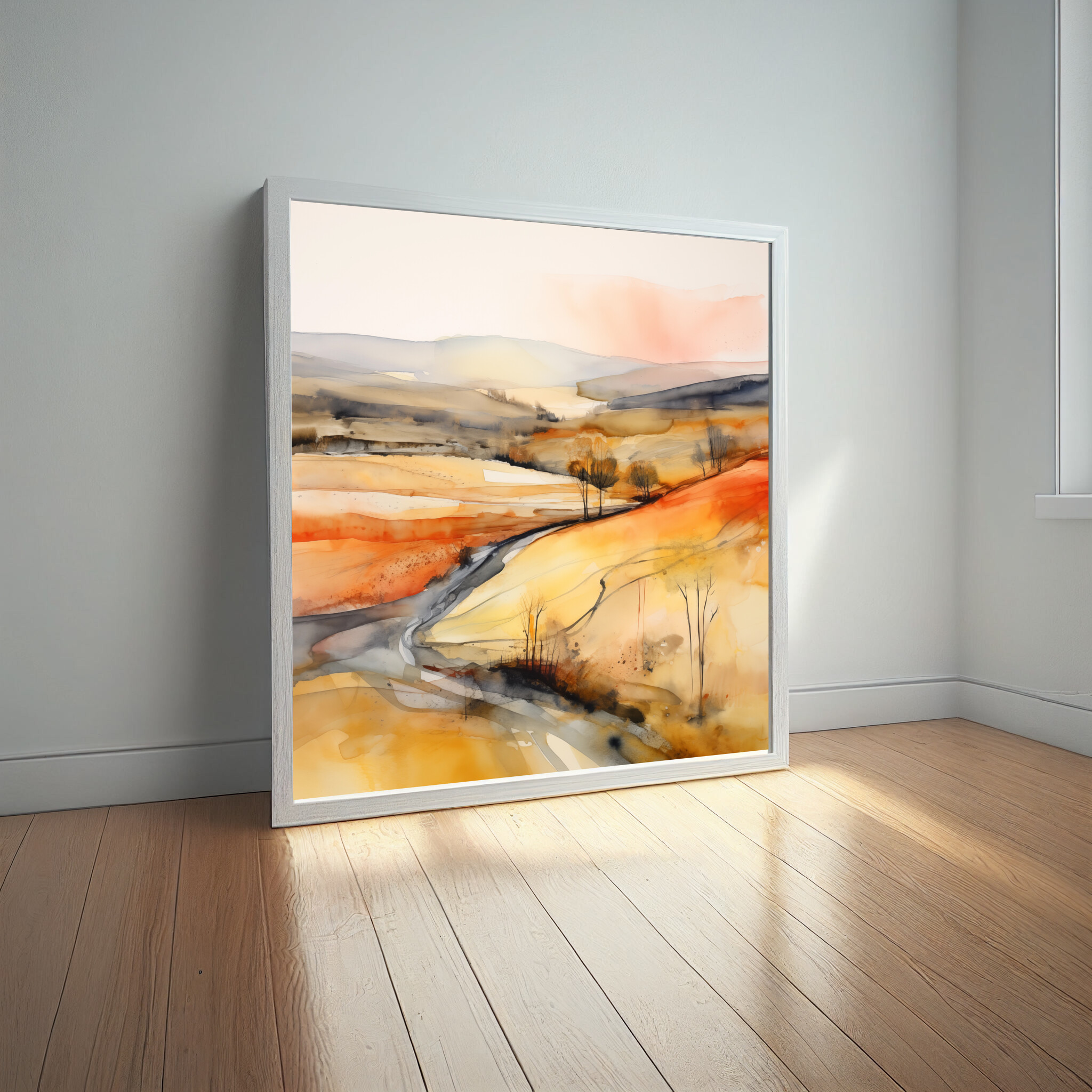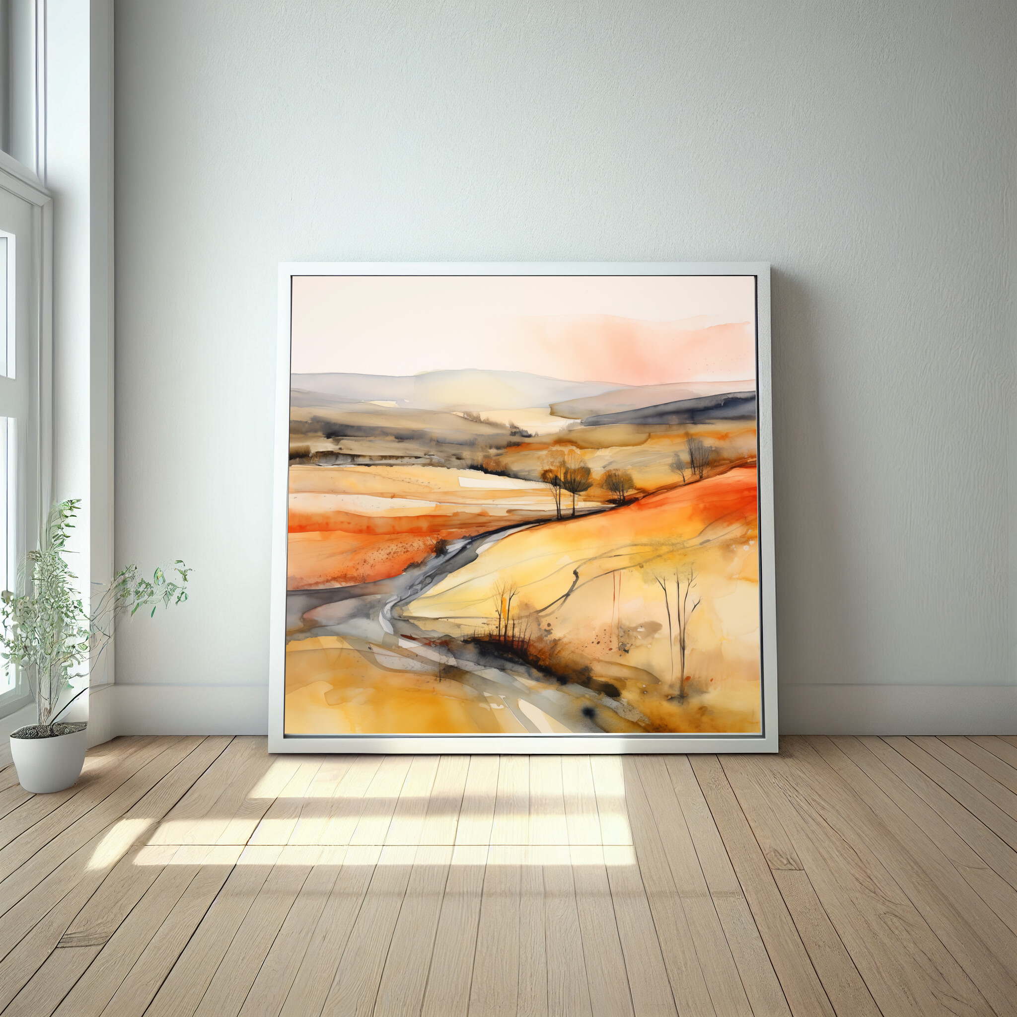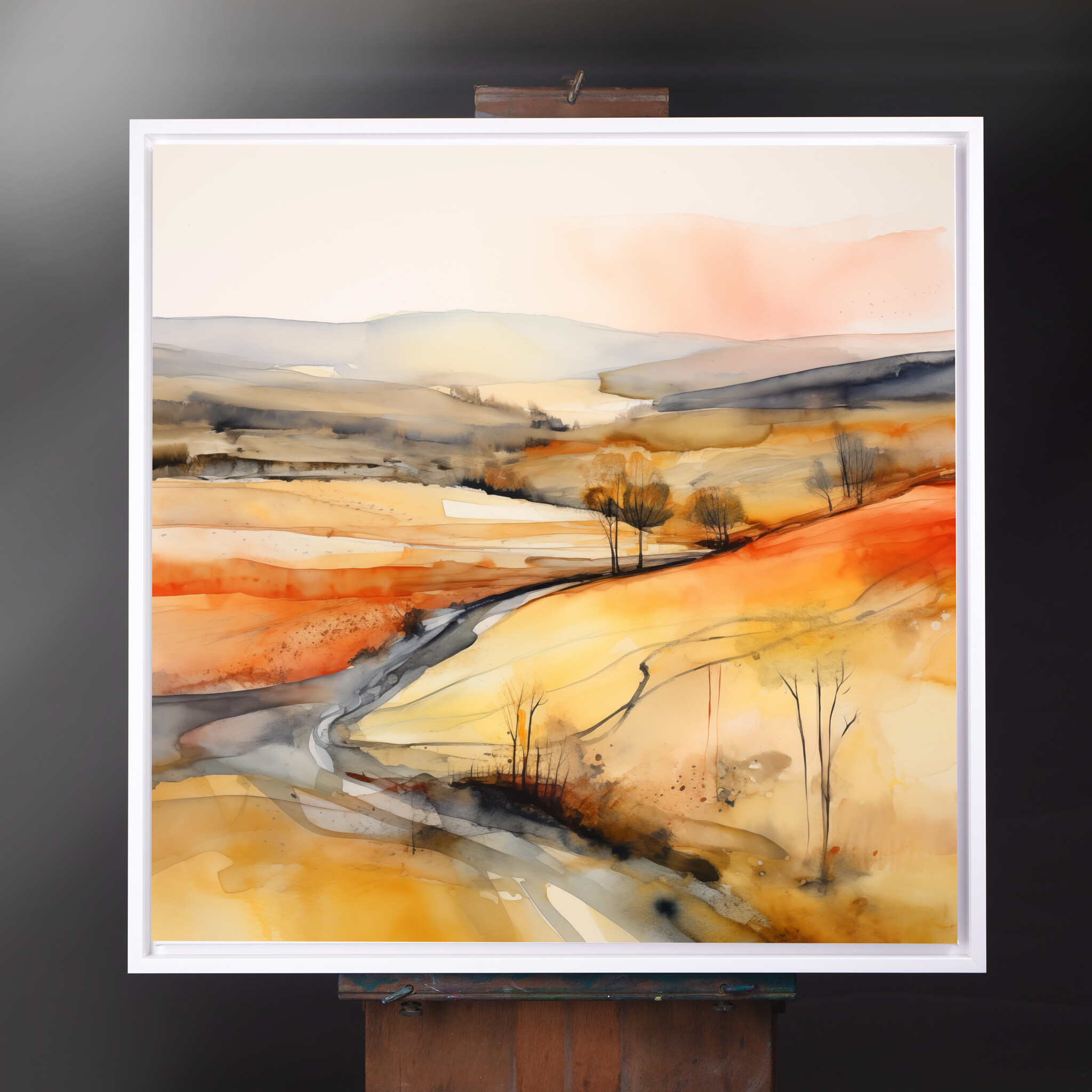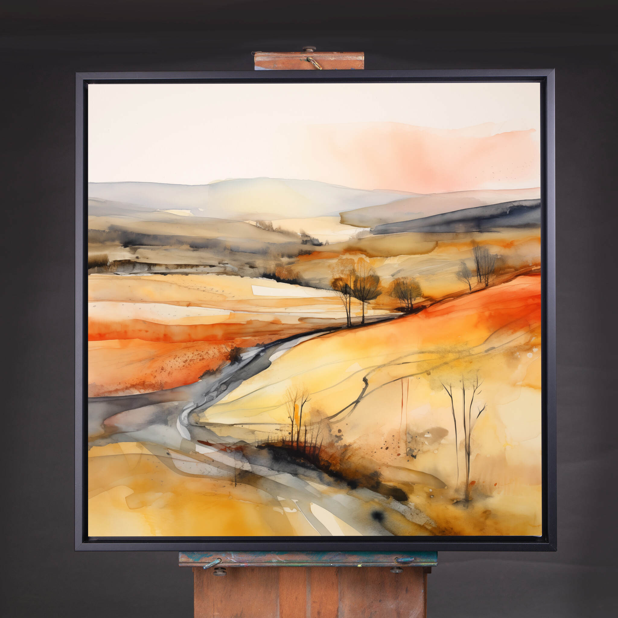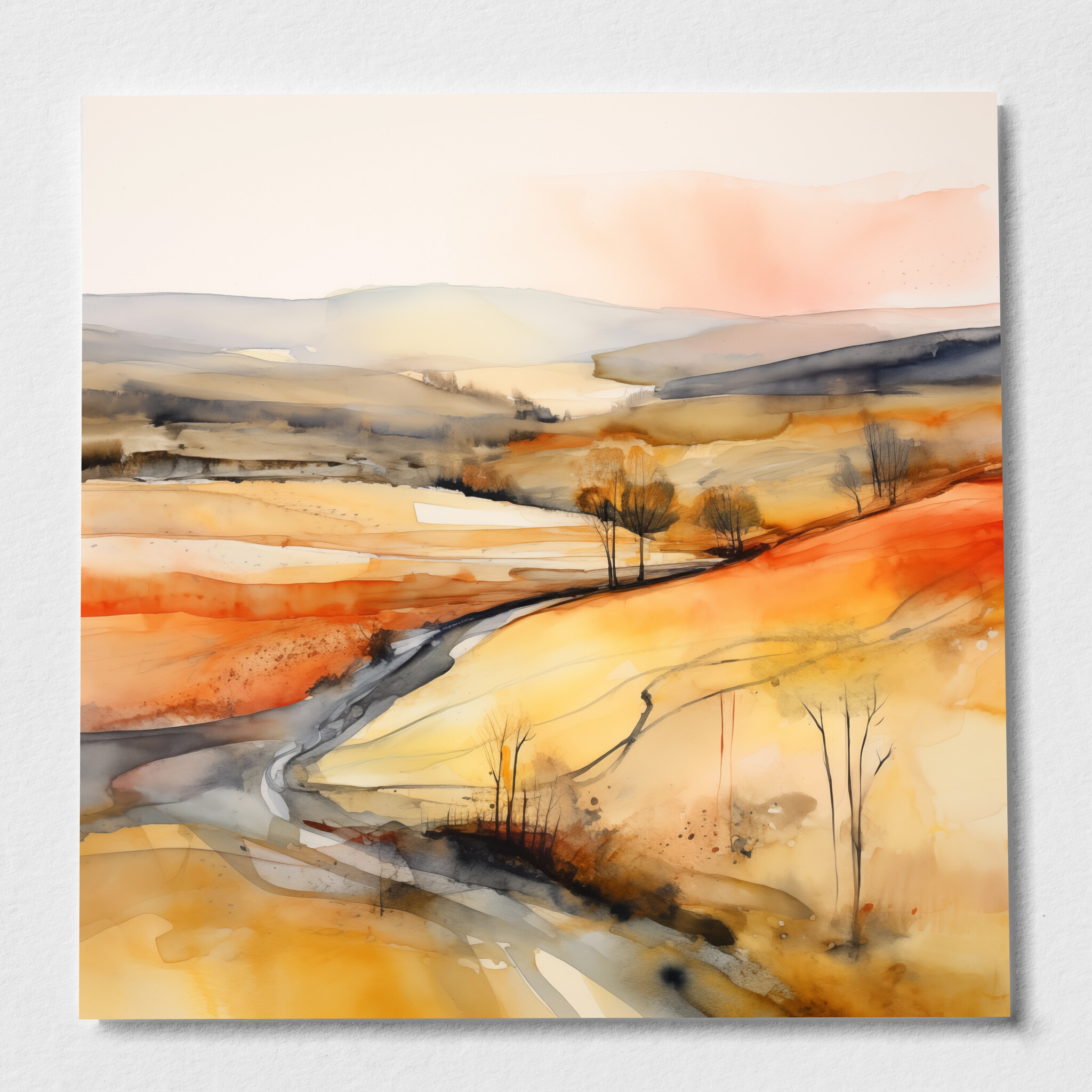 This abstract depiction of the Southdowns captures a vividly warm and inviting landscape. The use of orange_yellow tones, accented by gold, evokes the beauty and serenity of this iconic region. With an elegant flow of colours, the canvas invites the eye to explore every nuanced detail.