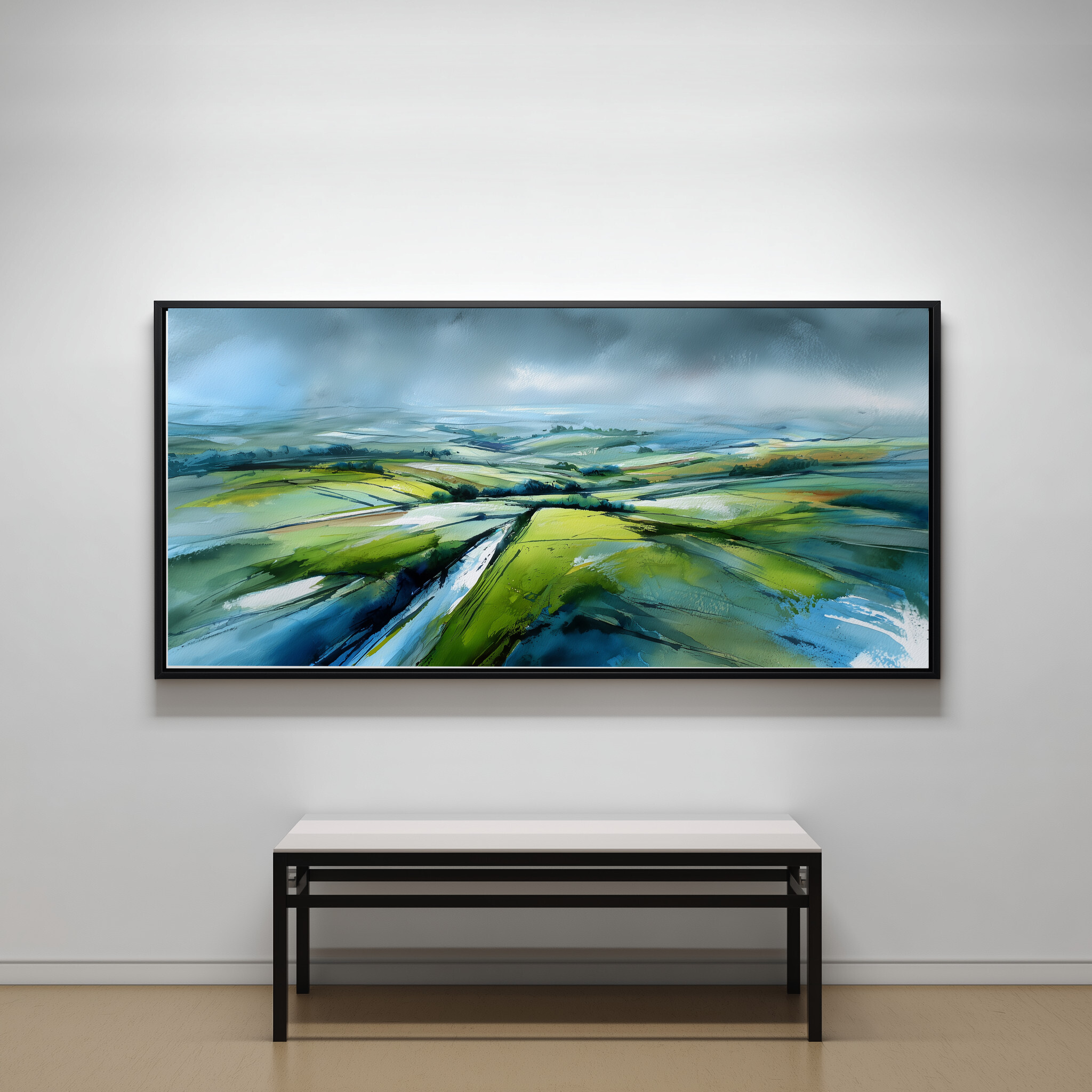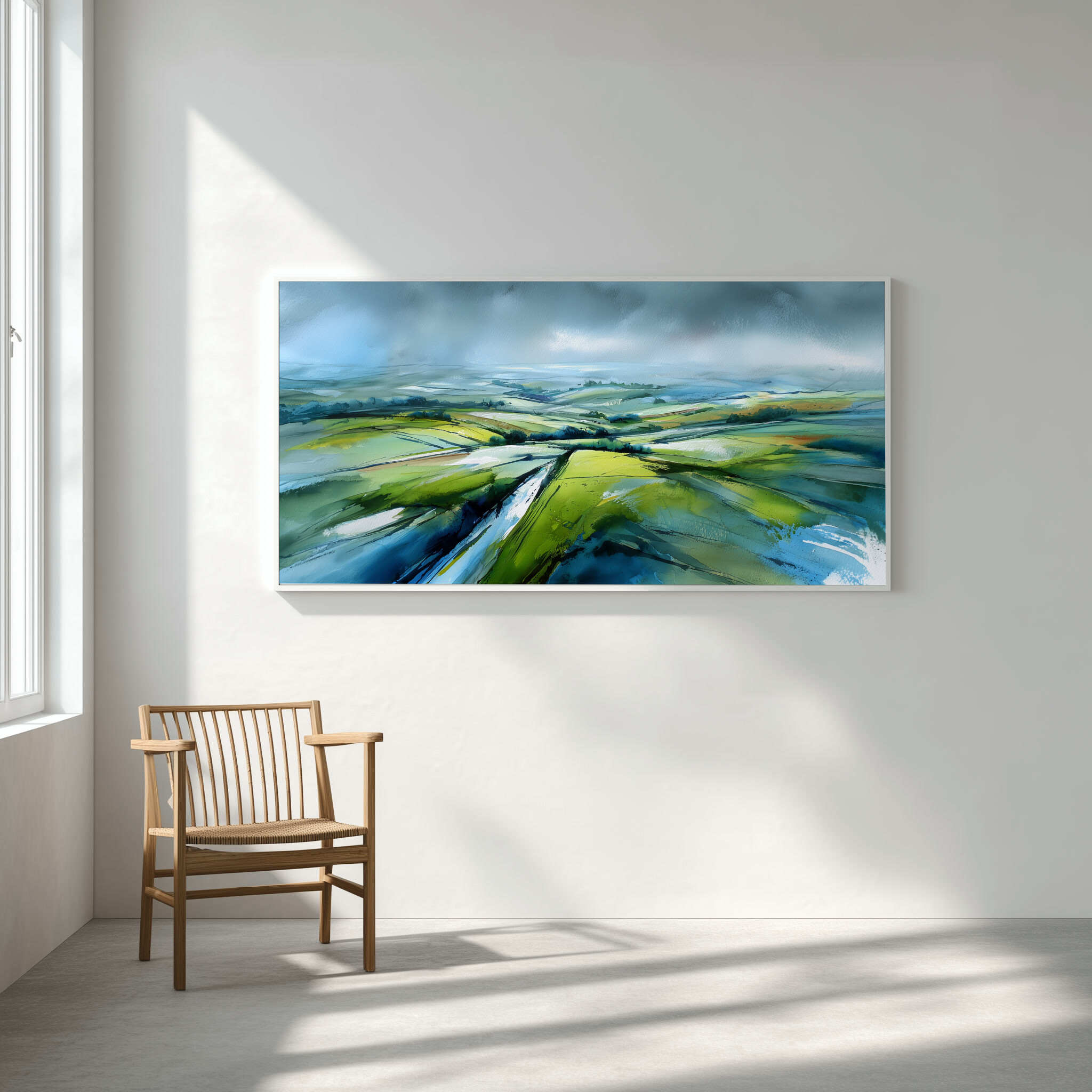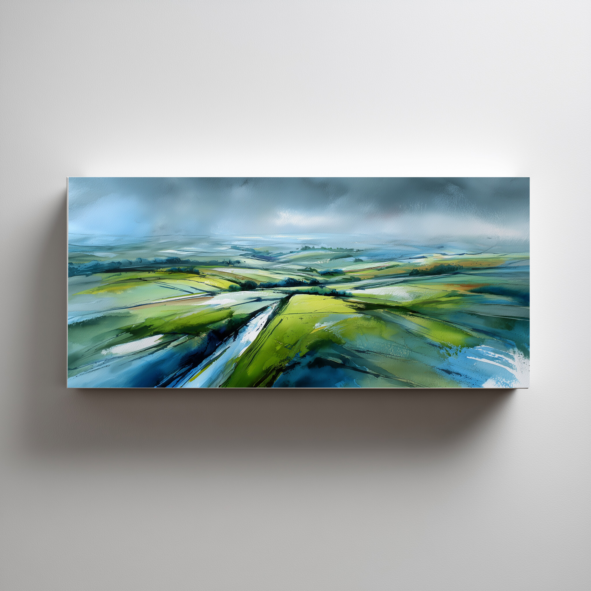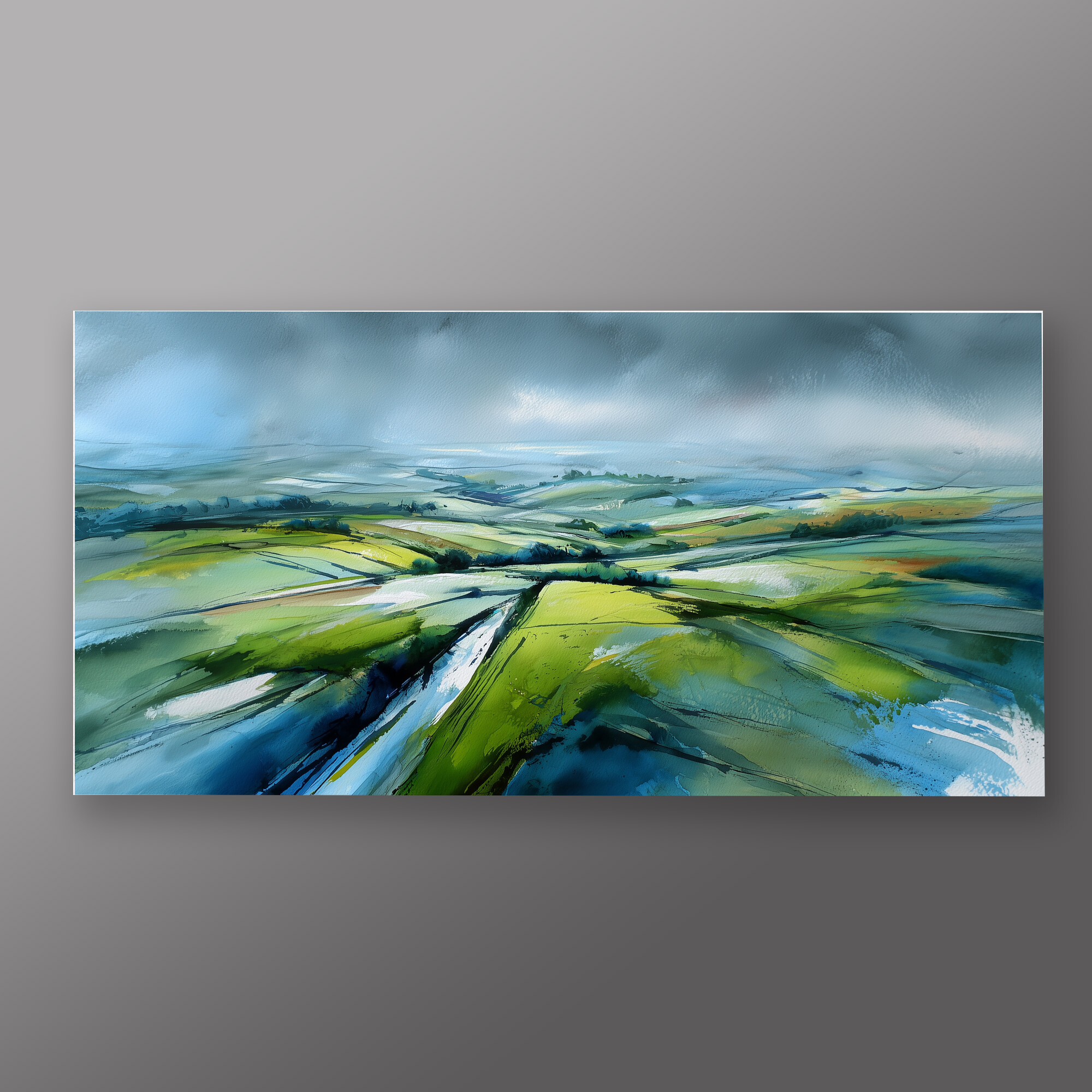 This stunning abstract artwork vividly captures the rolling fields of the Southdowns, blending soothing greens with striking blue accents. The sweeping brushstrokes and impressionistic style imbue a sense of tranquillity and vast space, making it an exquisite piece of wall art for any home decor enthusiast.