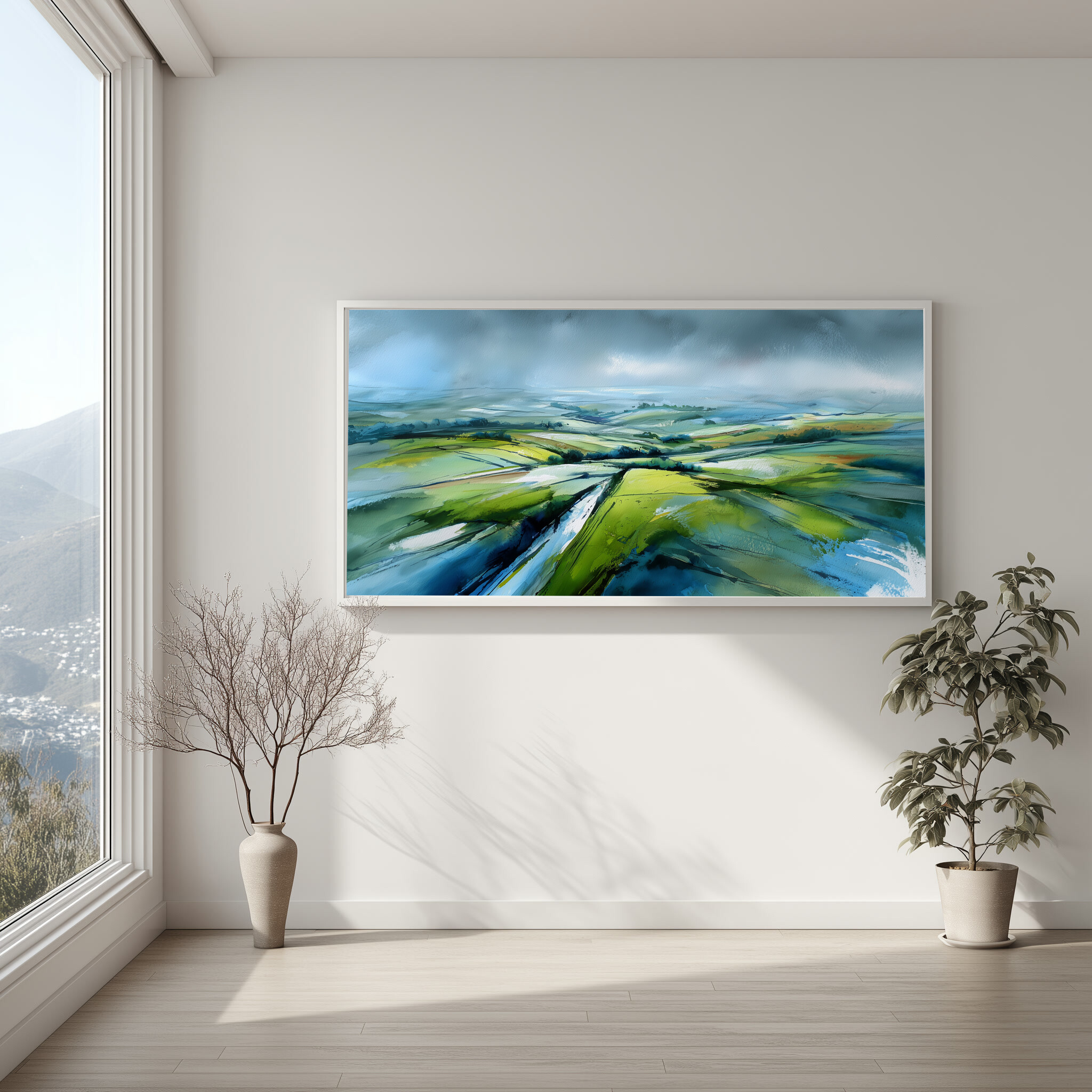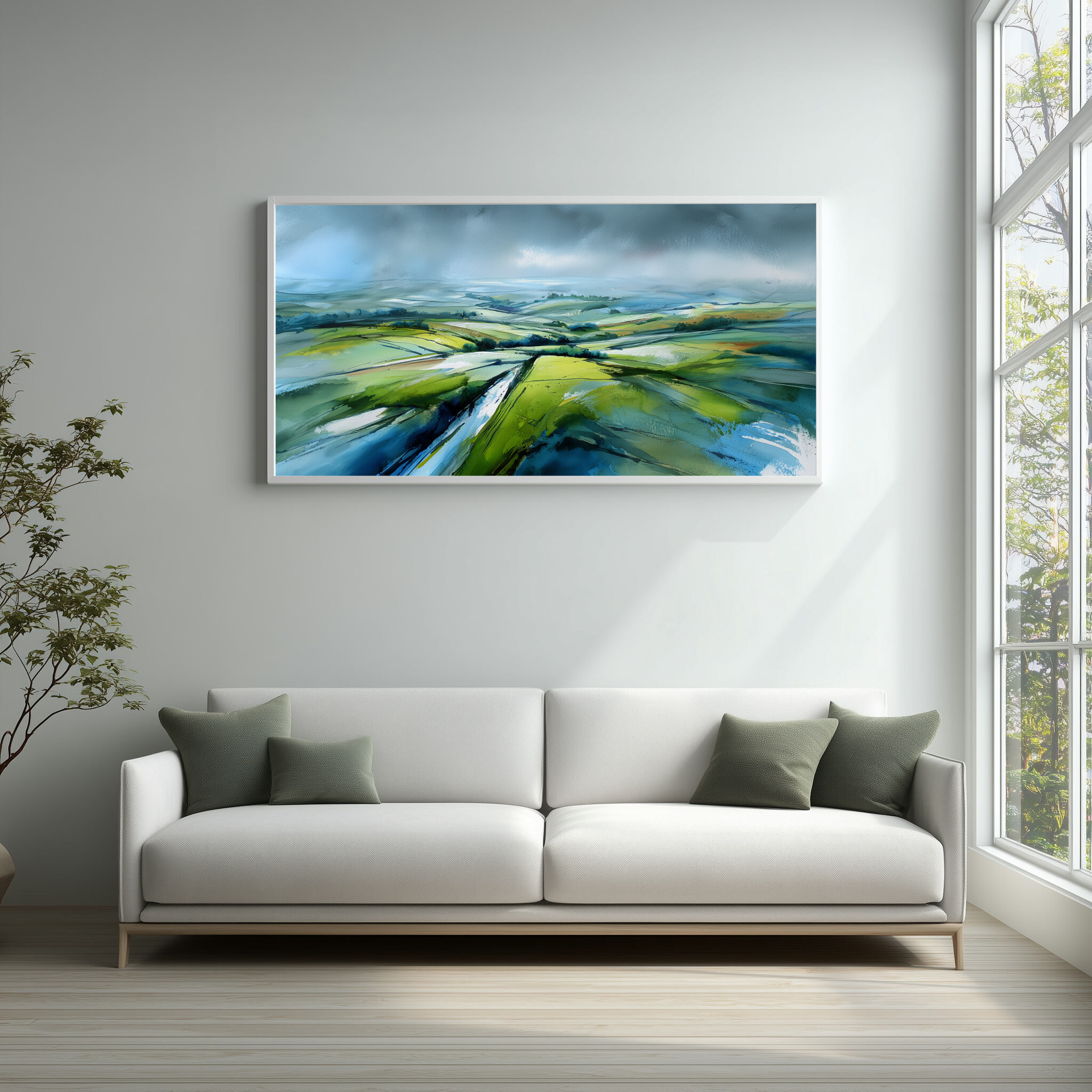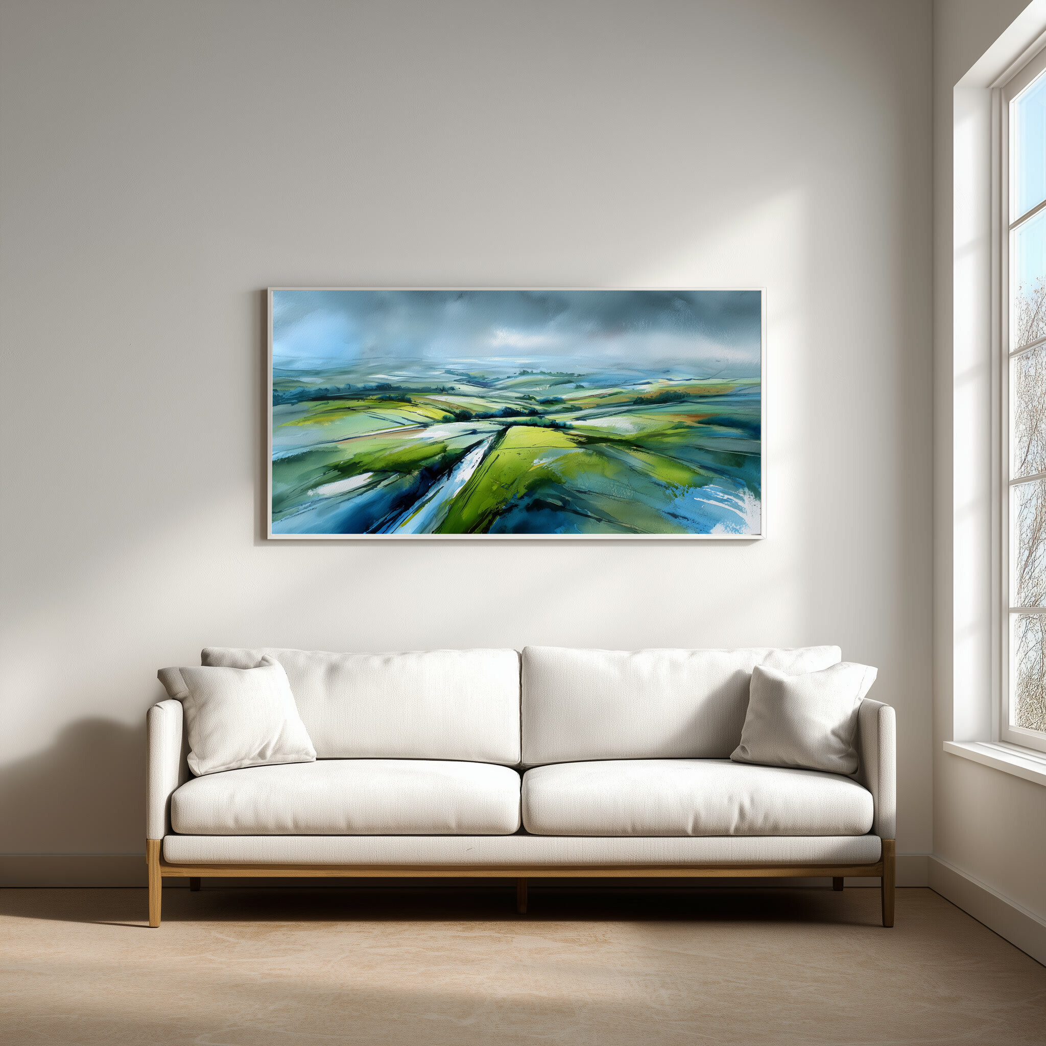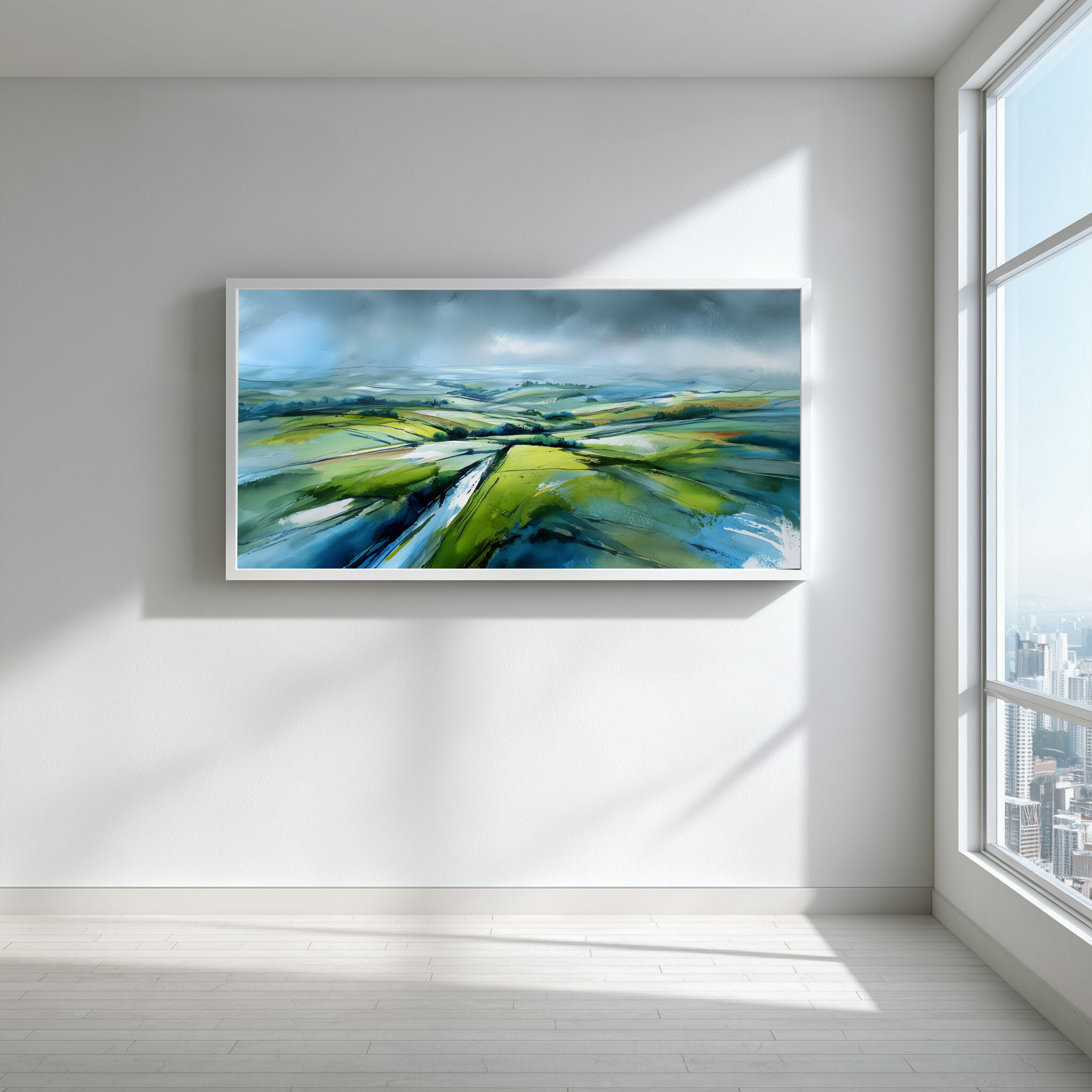 This stunning abstract artwork vividly captures the rolling fields of the Southdowns, blending soothing greens with striking blue accents. The sweeping brushstrokes and impressionistic style imbue a sense of tranquillity and vast space, making it an exquisite piece of wall art for any home decor enthusiast.