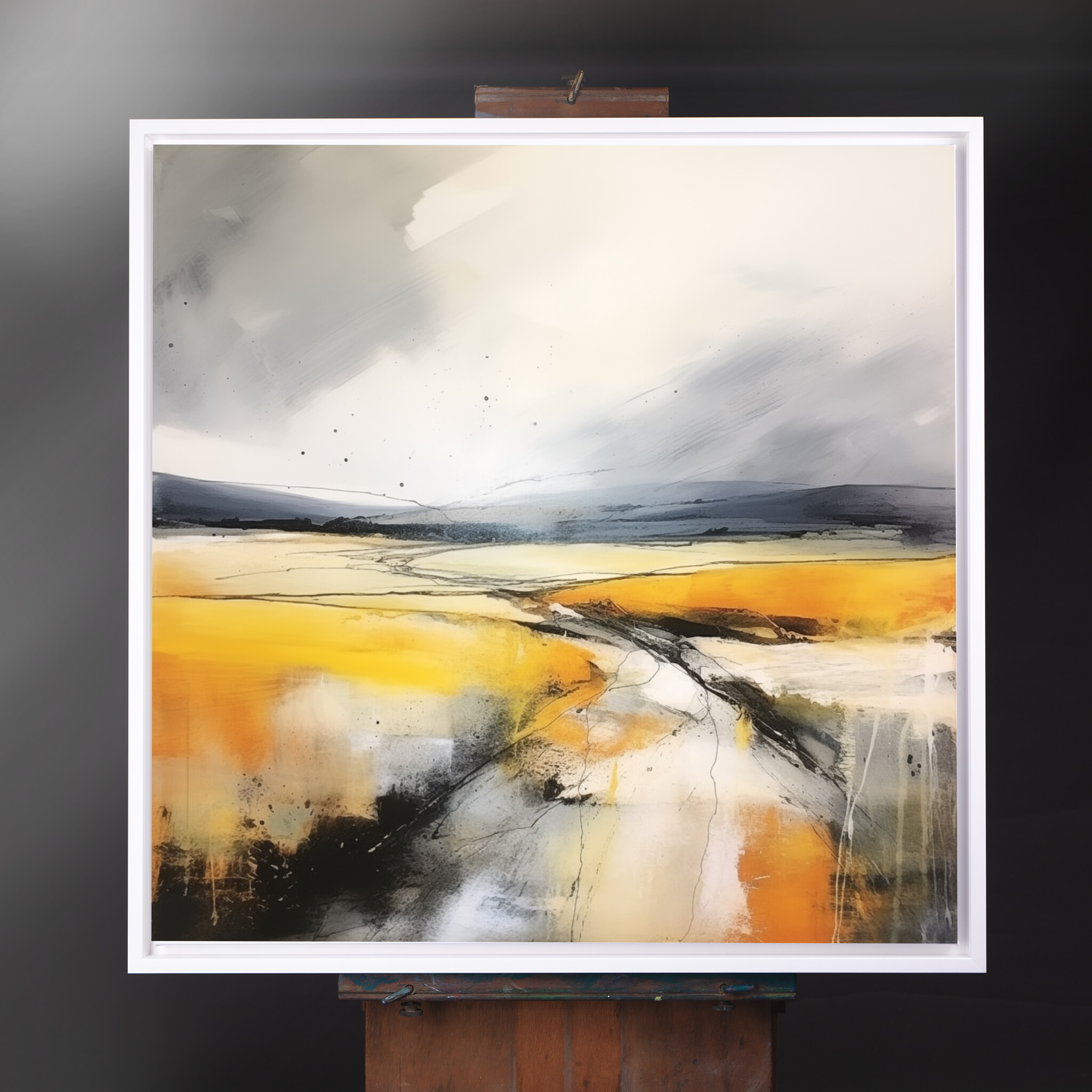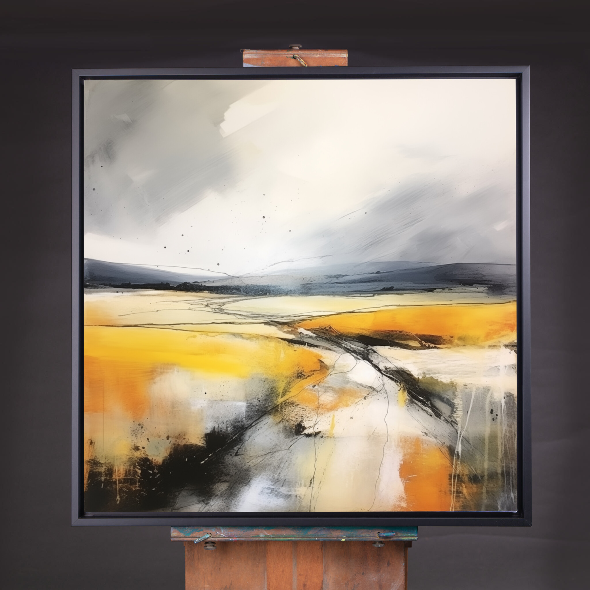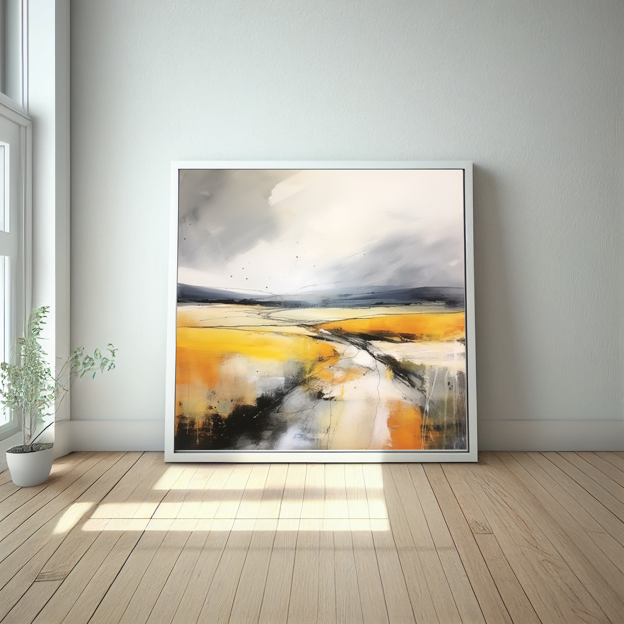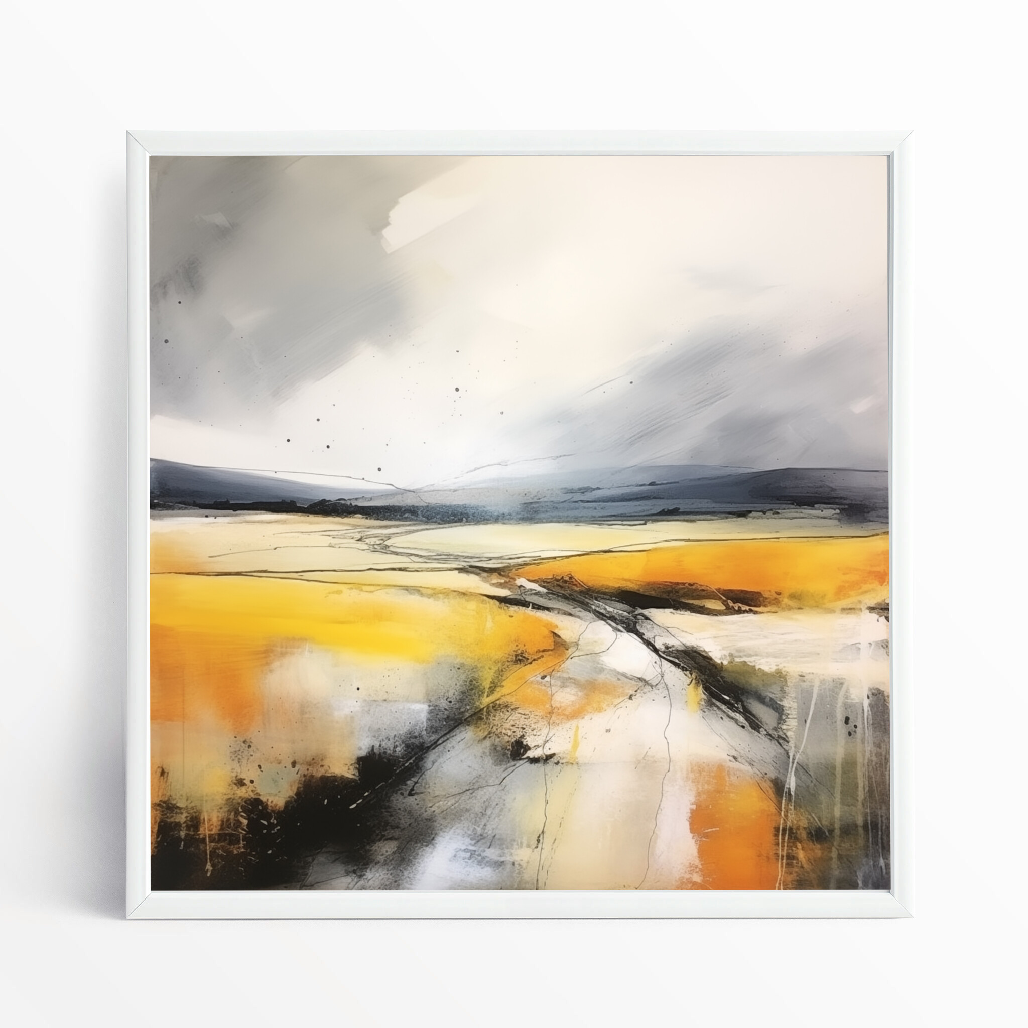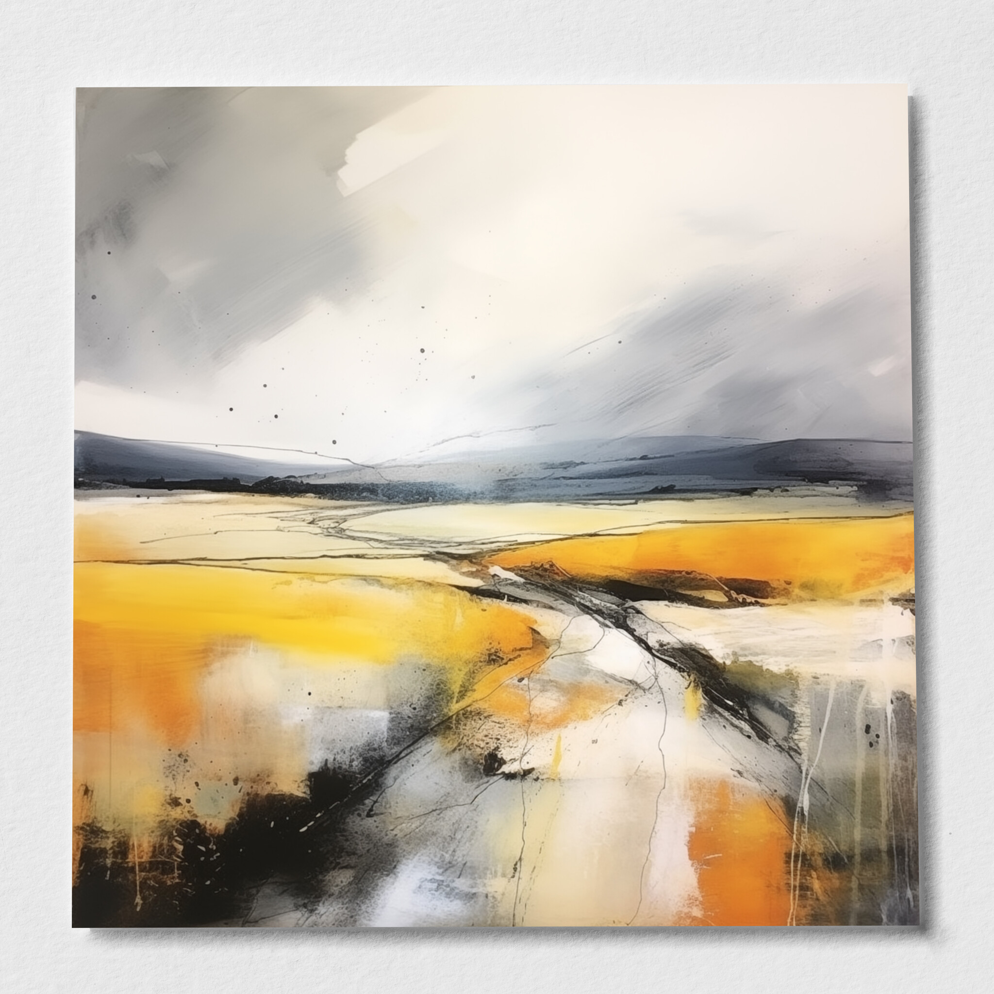 This captivating abstract landscape brings the Southdowns to life with vibrant yellow and grey tones. The sweeping fields and dynamic brushstrokes create a sense of movement and depth, evoking the serenity of a gentle breeze across open plains.