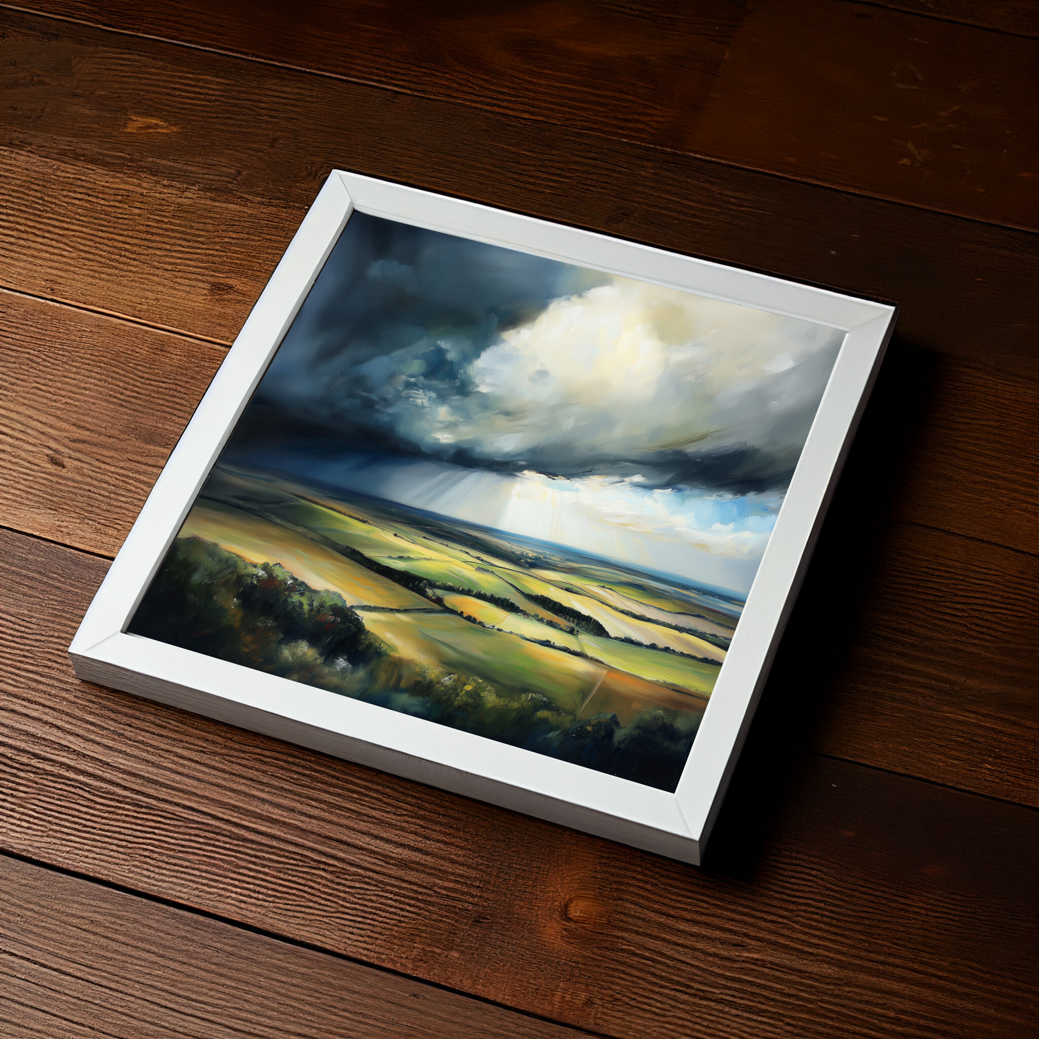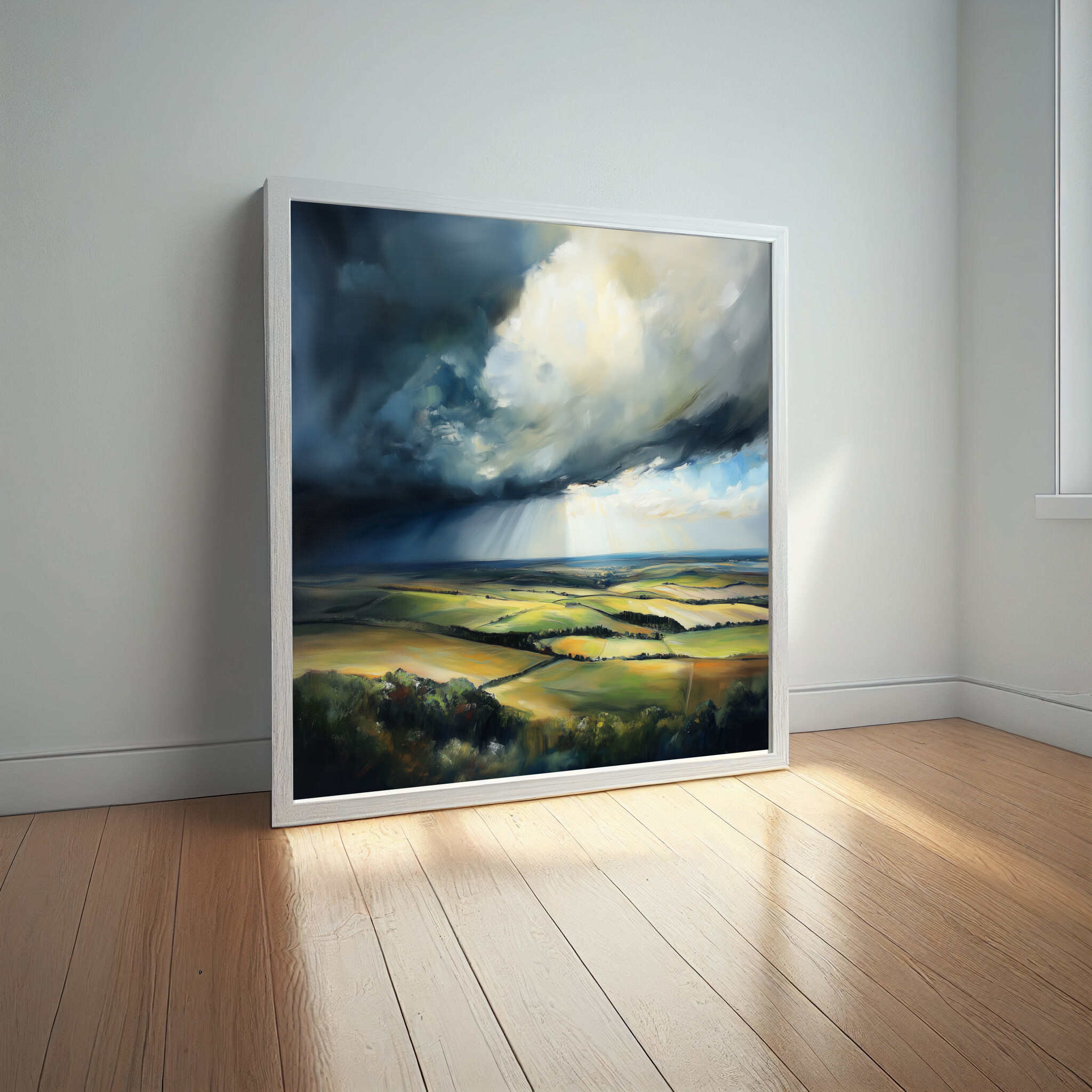 The emotive contrast between the stormy sky and verdant landscape creates a scene that evokes tranquility and drama simultaneously. This piece is perfect for adding a touch of elegance to your living room or as inspiring office decor.