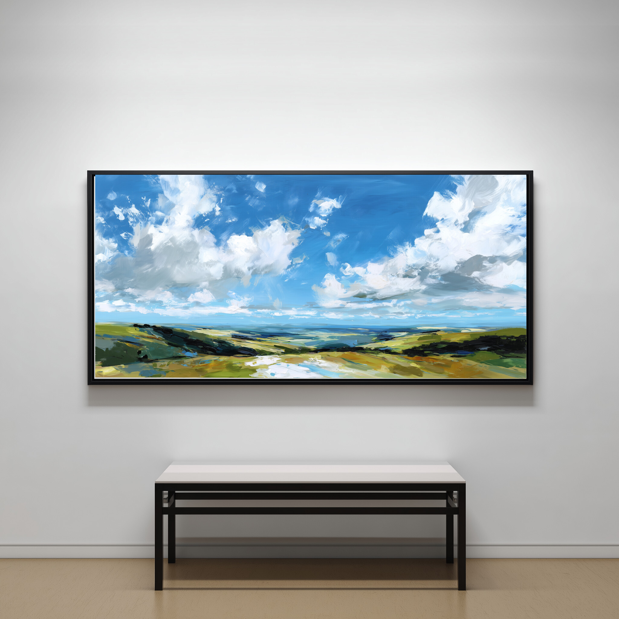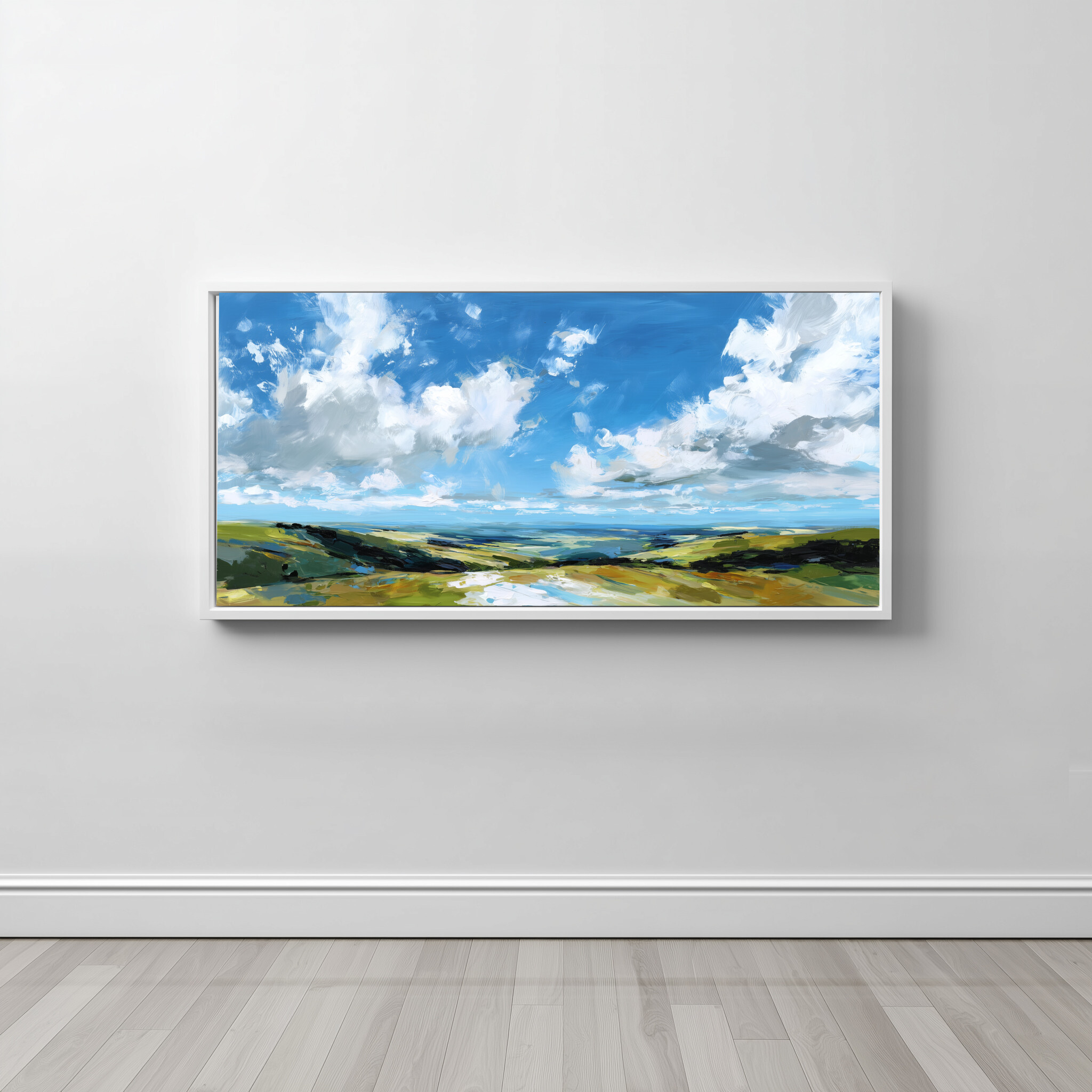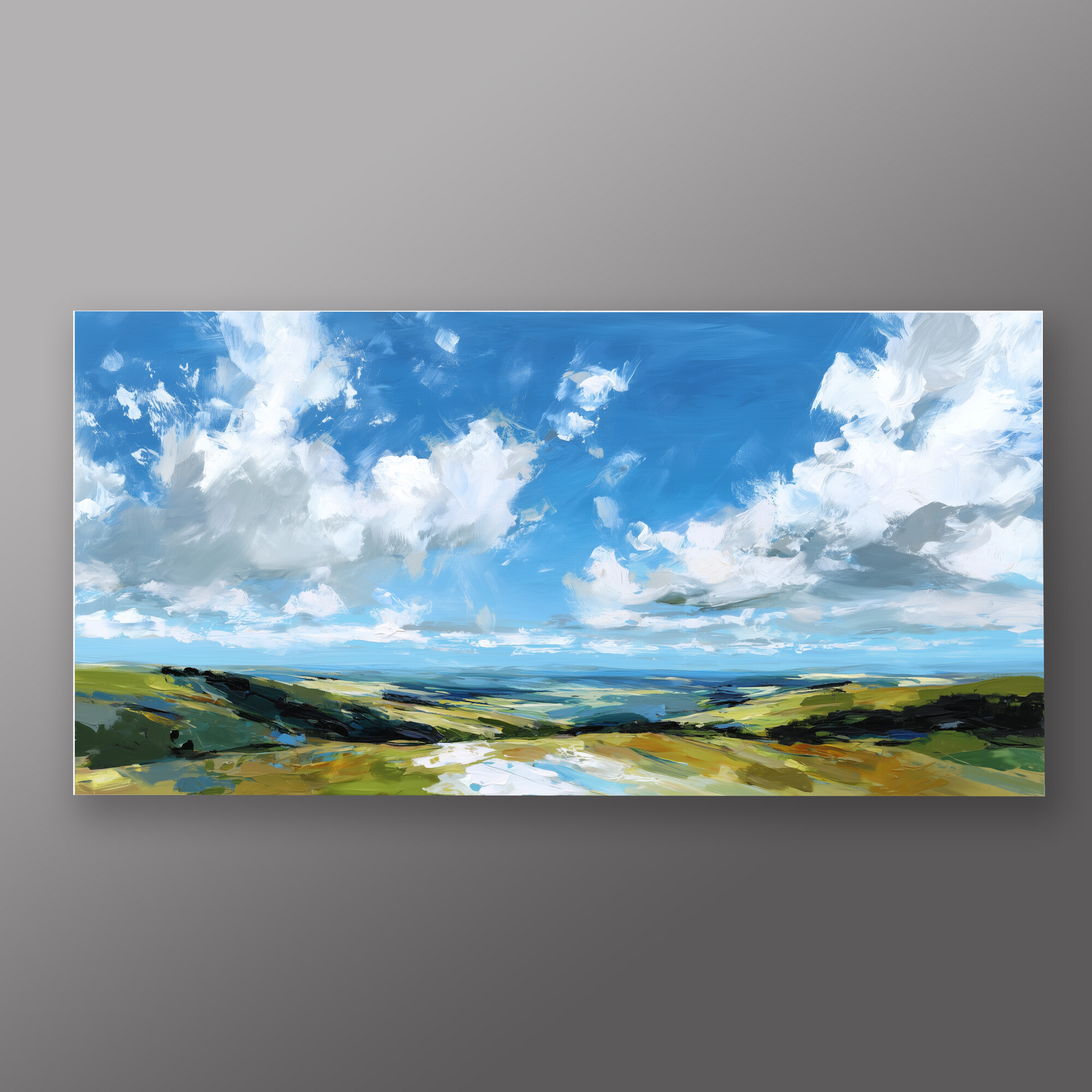 This stunning impressionist artwork beautifully captures the sweeping vistas of Southdowns, featuring a serene blend of blue and green tones. The expansive sky and lush fields evoke a sense of calm and freedom, inviting you to lose yourself in the tranquil beauty of the landscape.