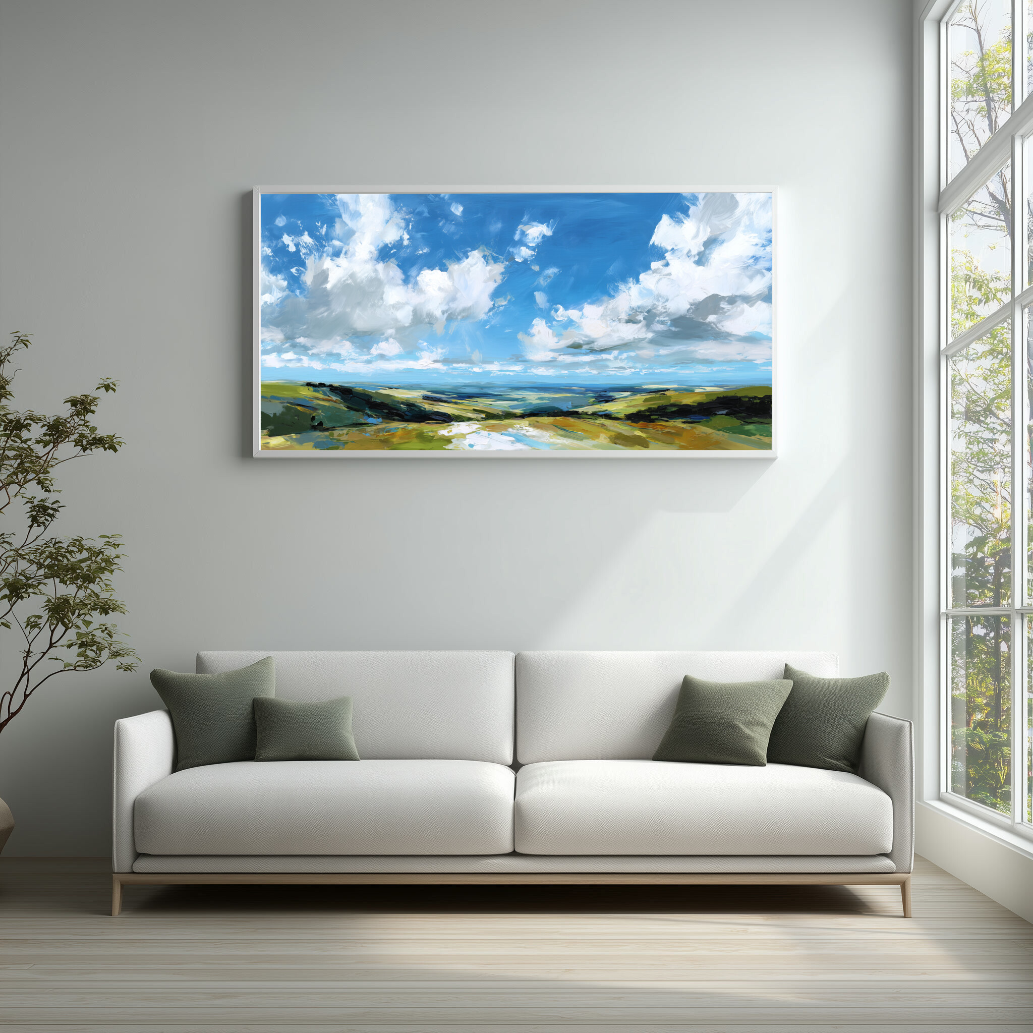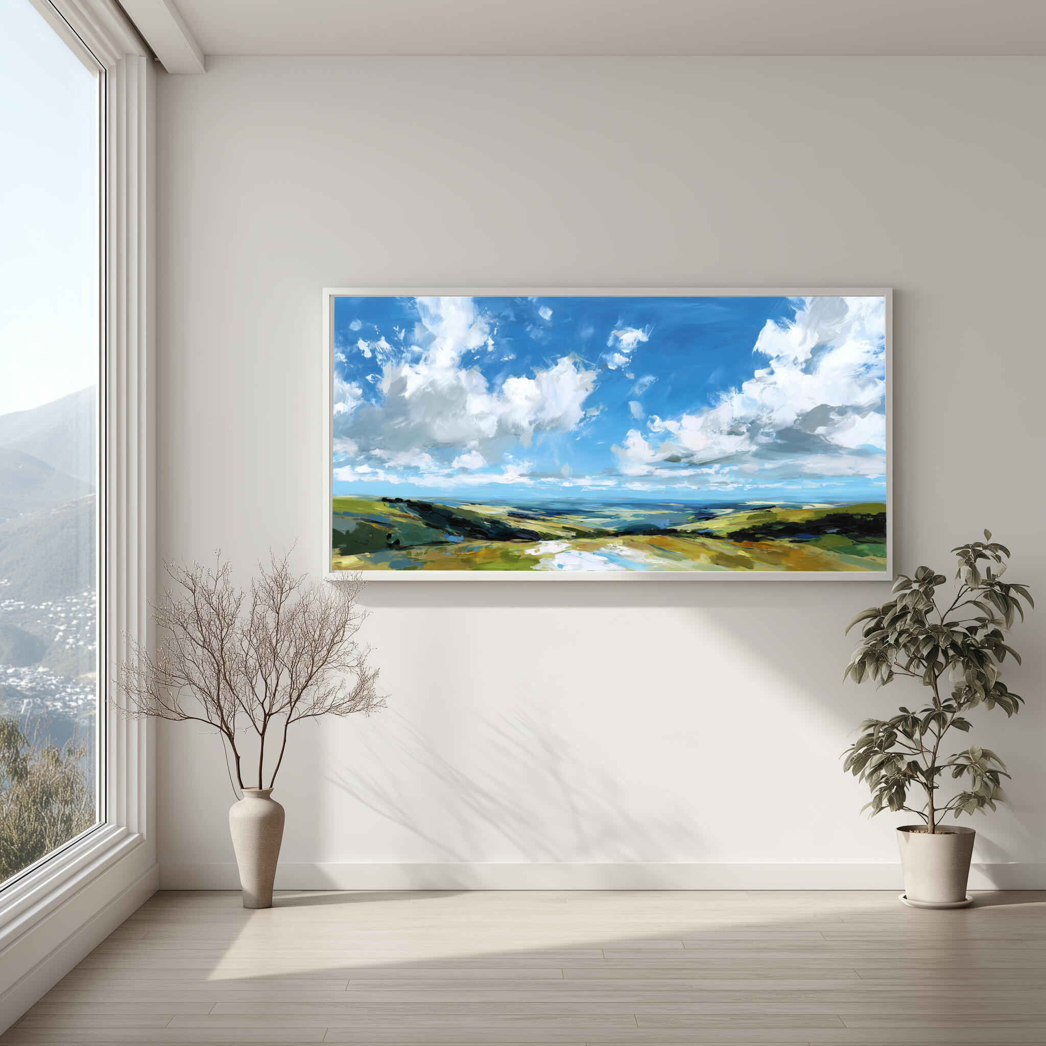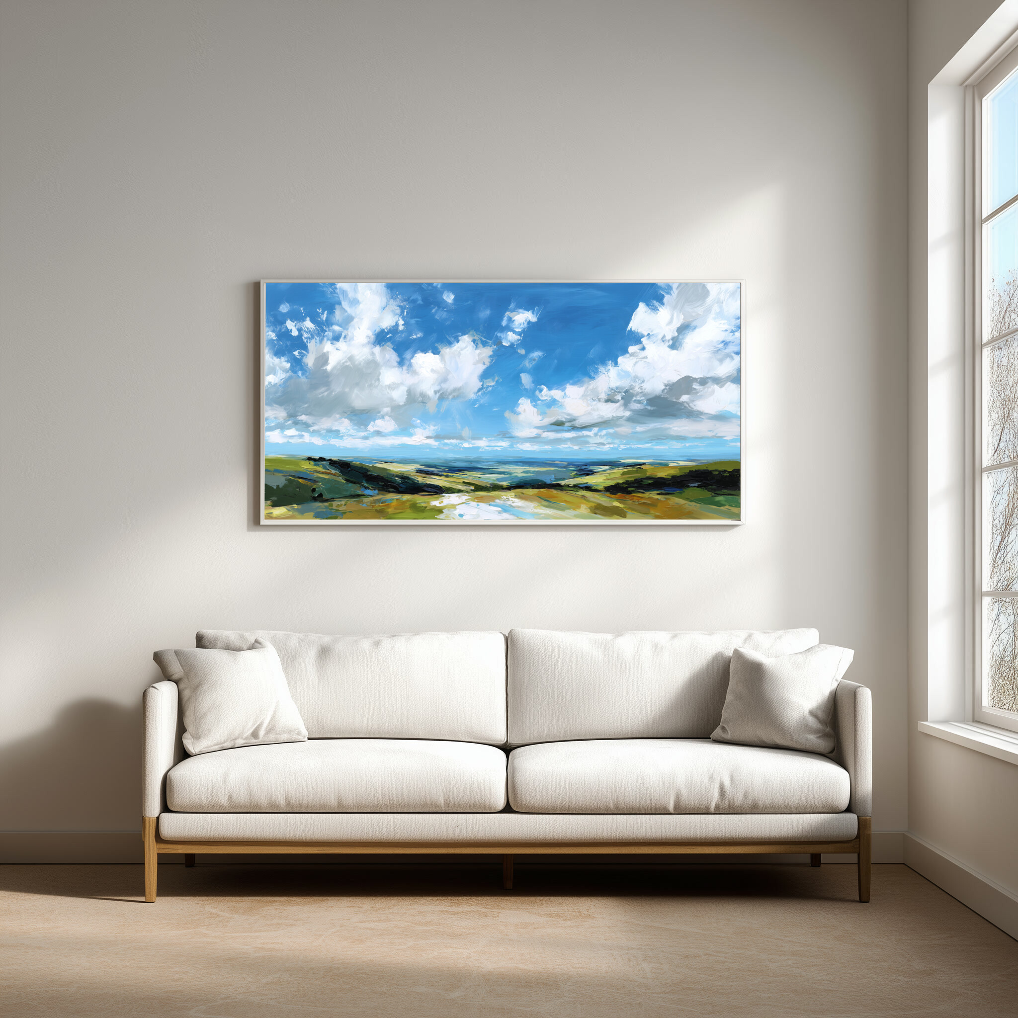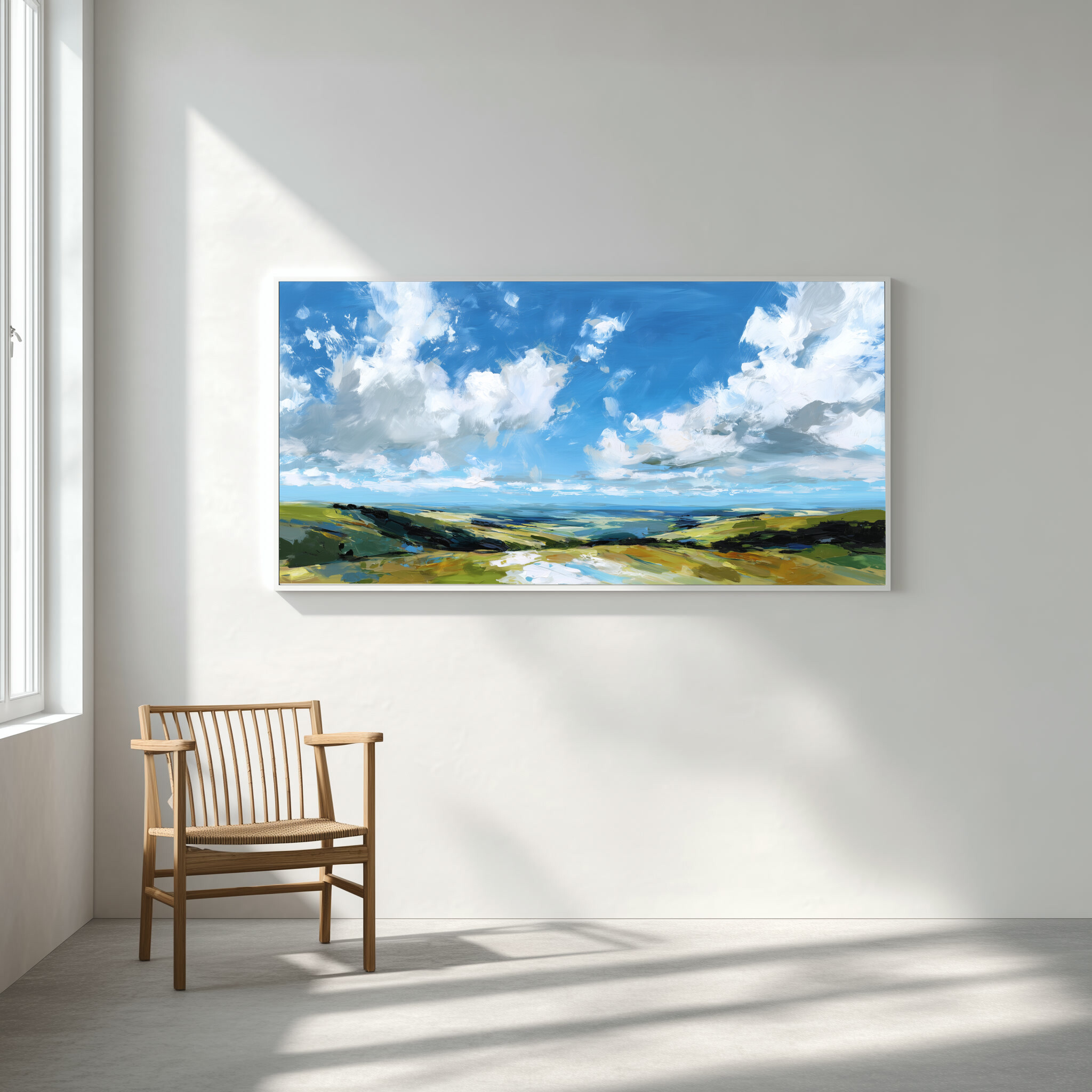This stunning impressionist artwork beautifully captures the sweeping vistas of Southdowns, featuring a serene blend of blue and green tones. The expansive sky and lush fields evoke a sense of calm and freedom, inviting you to lose yourself in the tranquil beauty of the landscape.