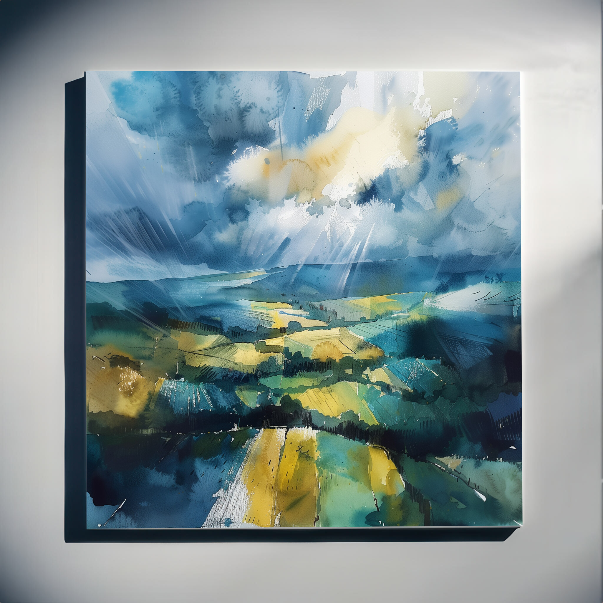 This captivating watercolor artwork captures the tranquil beauty of the Southdowns, bathed in vivid blue tones and lush green fields. The modern art style adds a fresh and dynamic touch to the classic landscape, making it a standout piece of wall art for any space. Whether displayed as living room art, office decor, or a serene addition to your bedroom, this piece evokes a sense of calm and natural beauty.