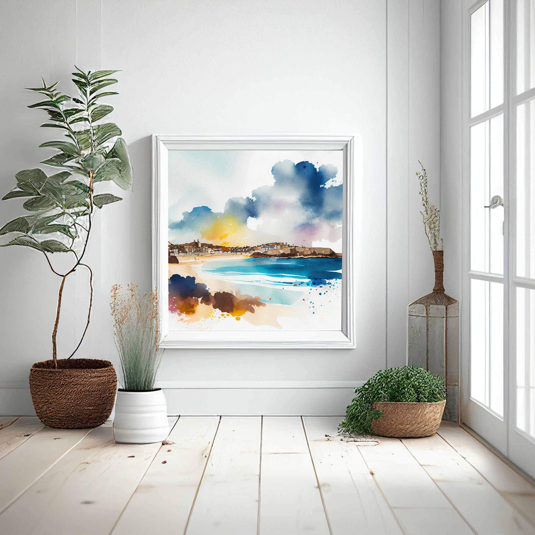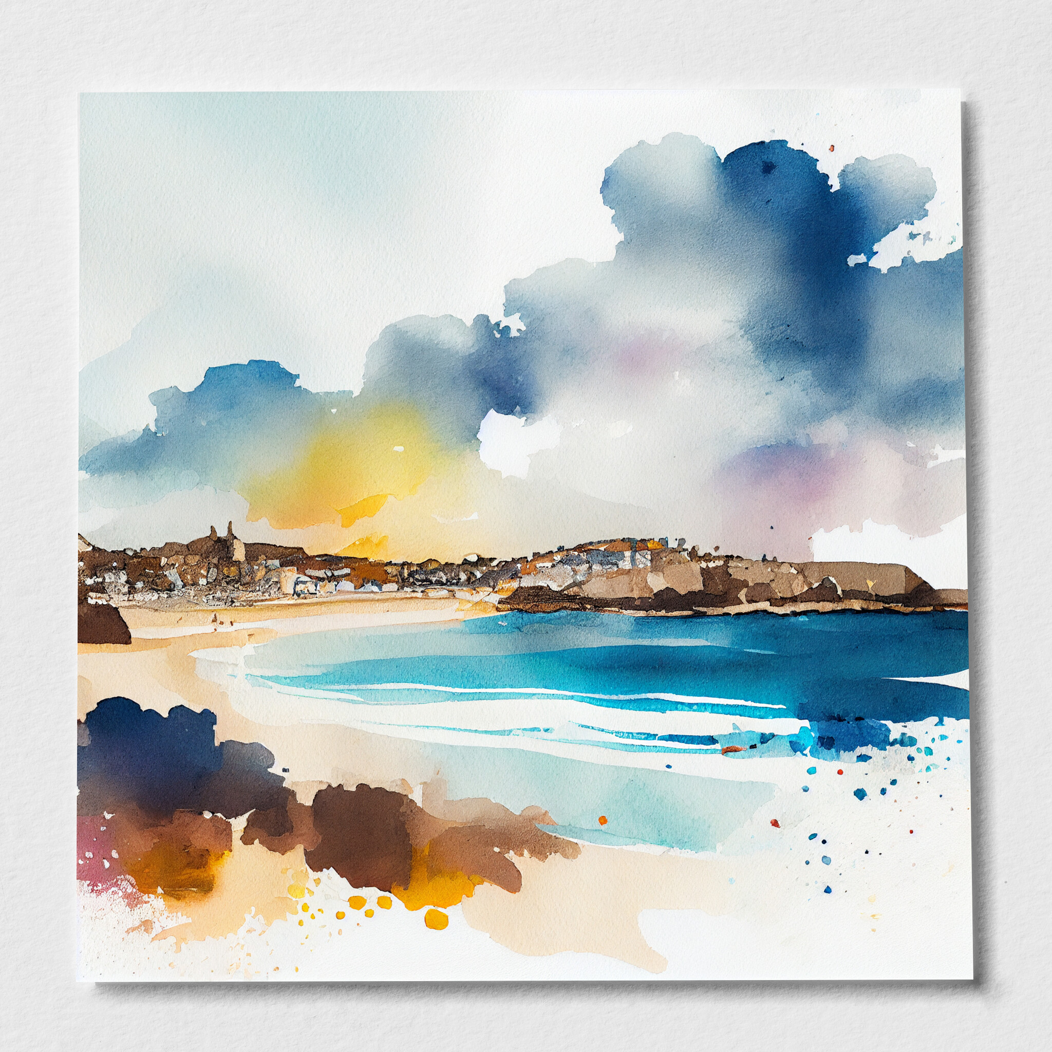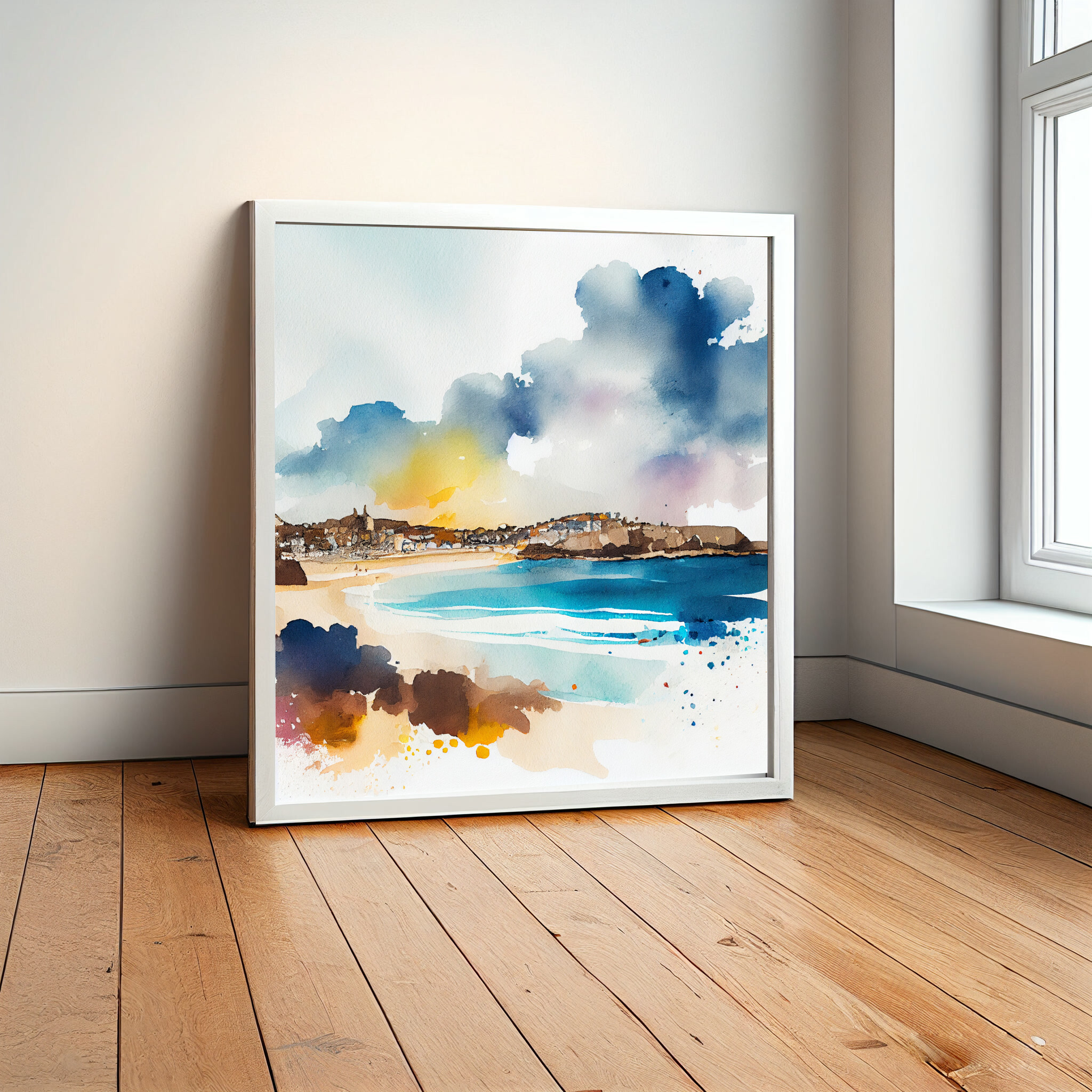 This stunning watercolor artwork captures the essence of St Ives, a picturesque coastal town in Cornwall. The bold blues of the ocean meld beautifully with warm, earthy tones, creating a captivating contrast and an impressionistic style that exudes tranquility. Perfect as living room art or a striking piece of home decor, this beach art will evoke the serene beauty of the Cornish coastline.