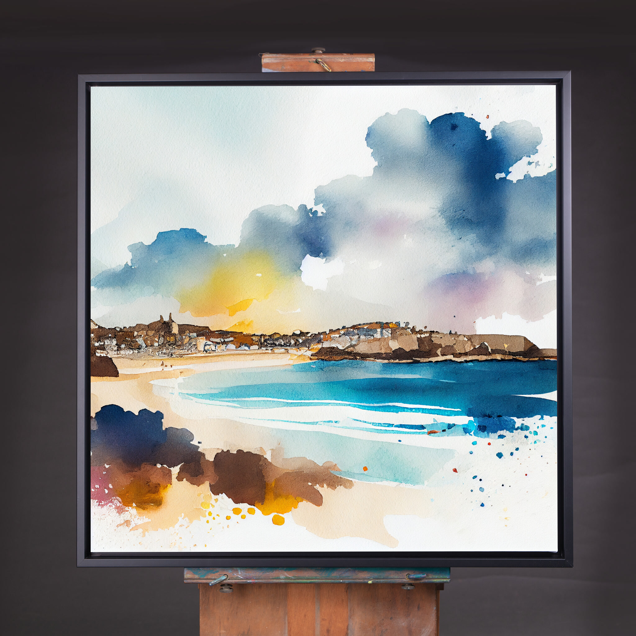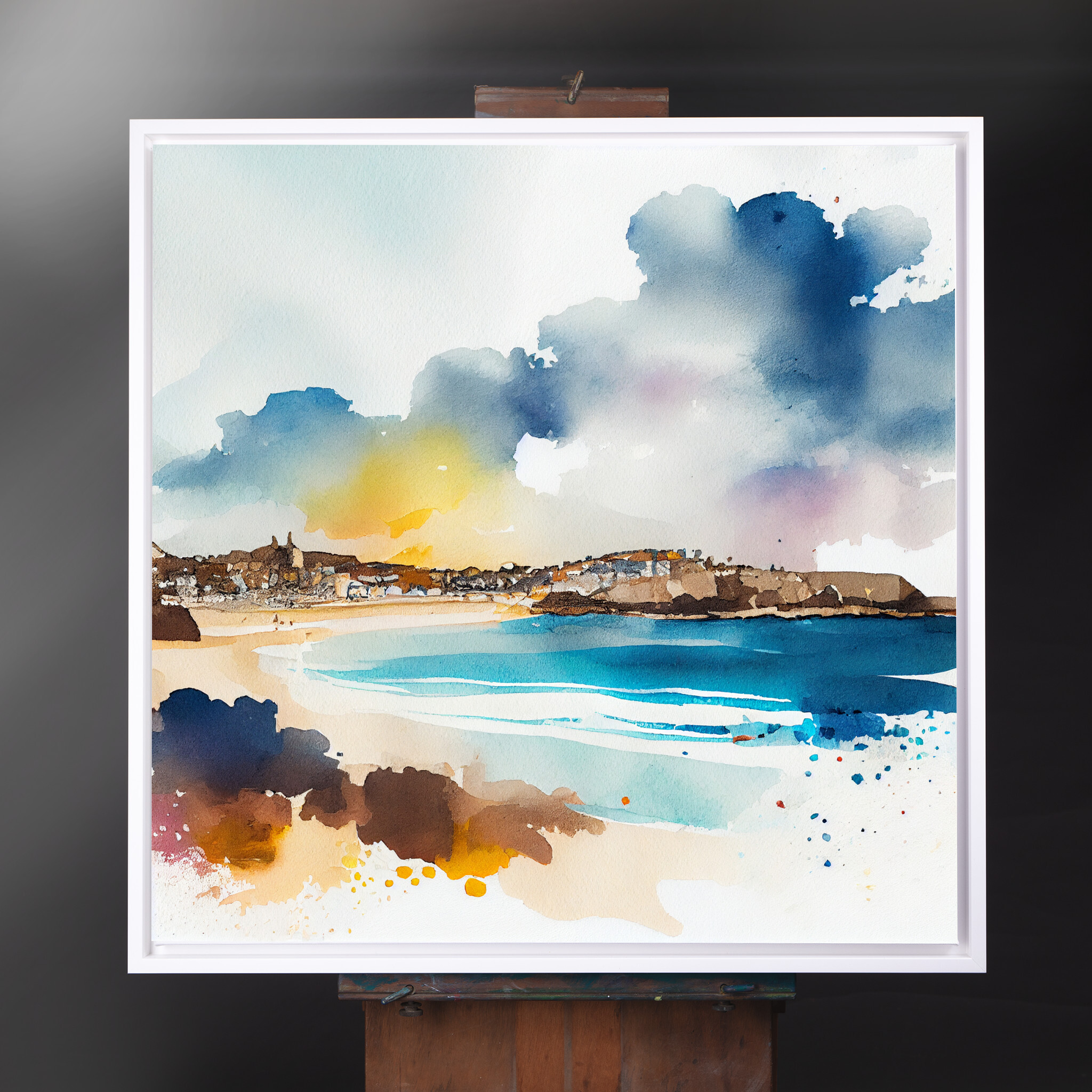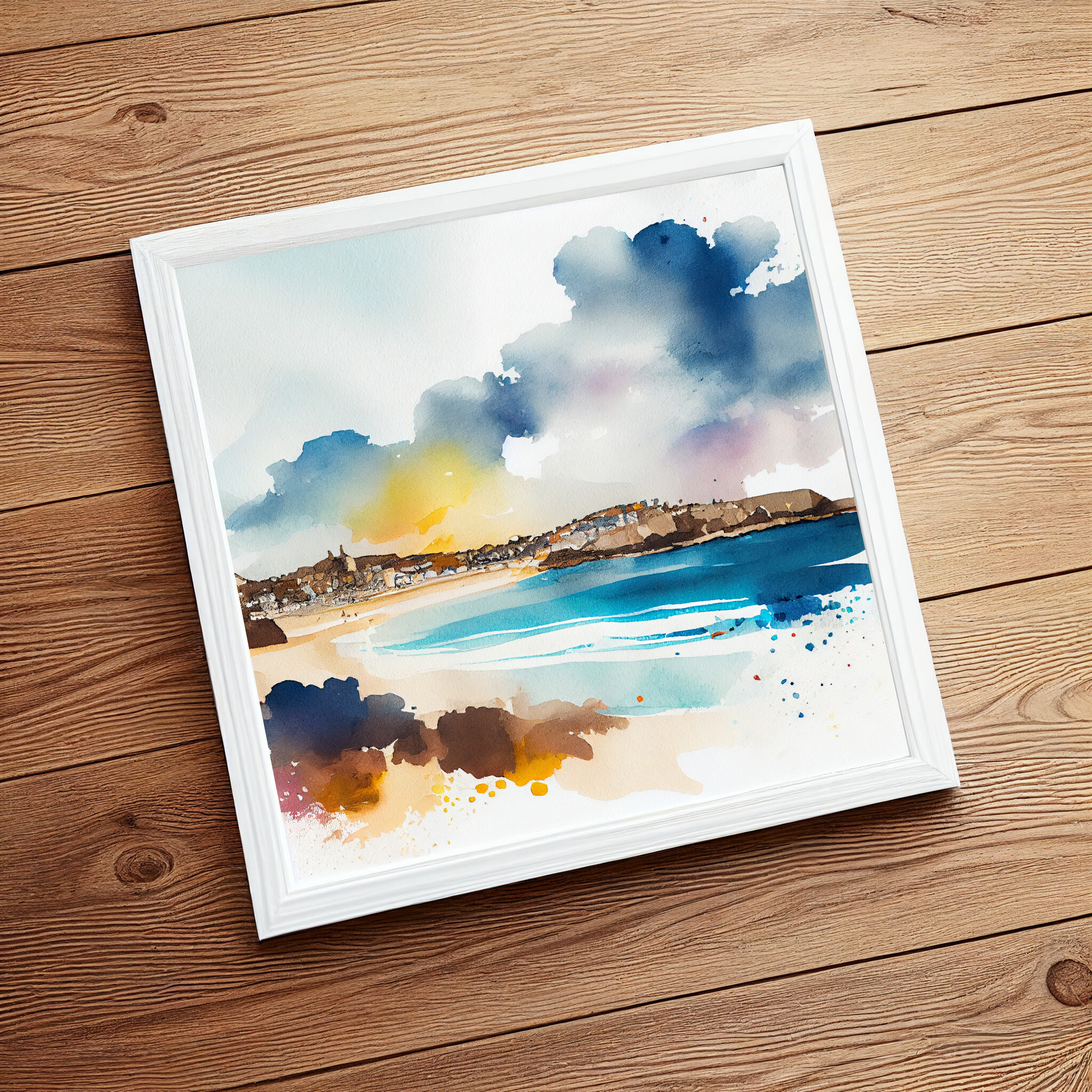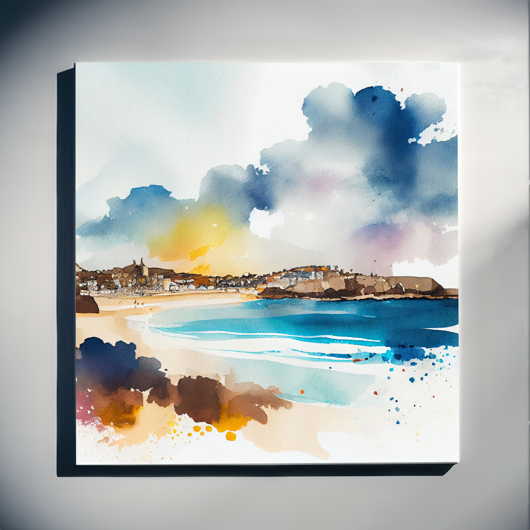 This stunning watercolor artwork captures the essence of St Ives, a picturesque coastal town in Cornwall. The bold blues of the ocean meld beautifully with warm, earthy tones, creating a captivating contrast and an impressionistic style that exudes tranquility. Perfect as living room art or a striking piece of home decor, this beach art will evoke the serene beauty of the Cornish coastline.