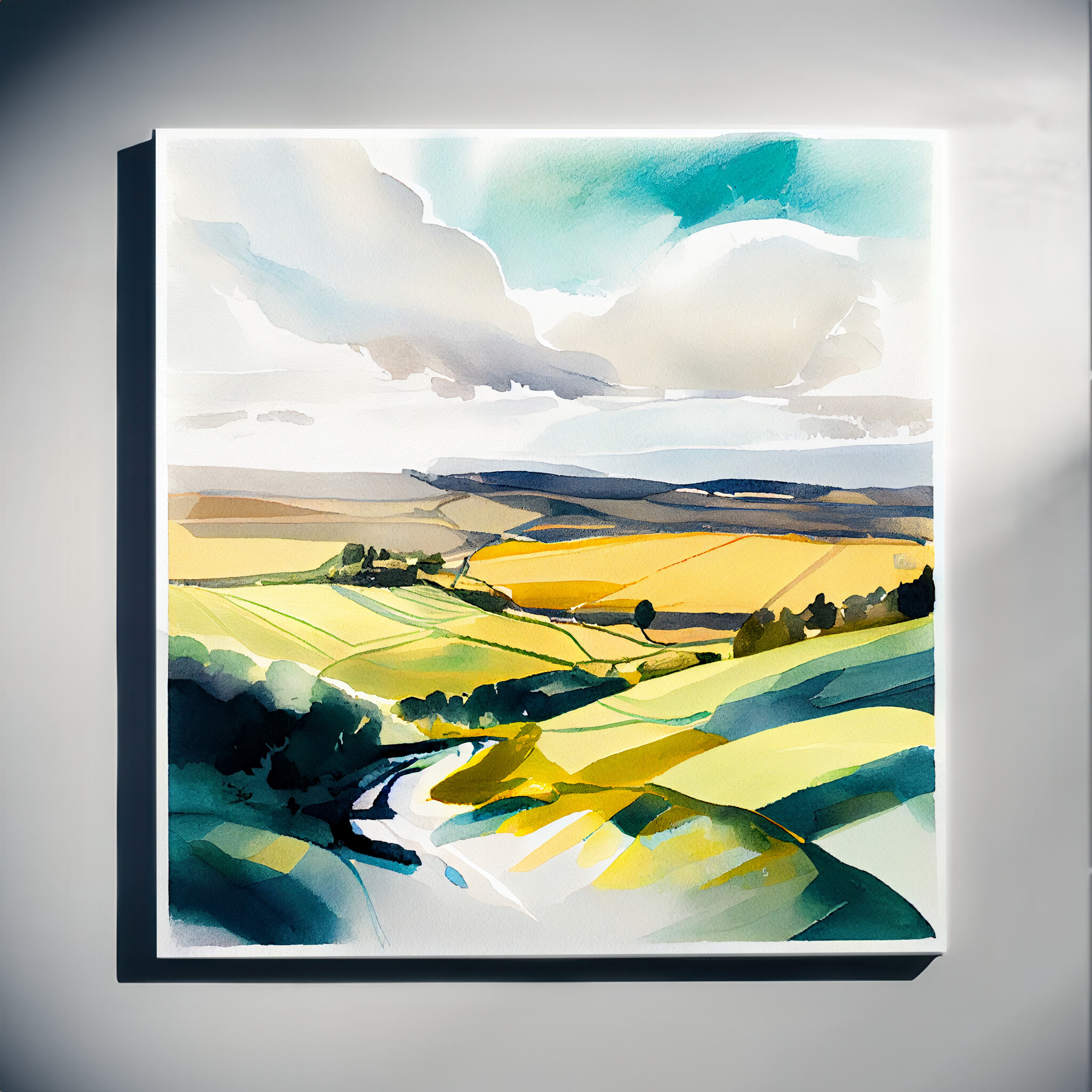 This exquisite watercolor art piece captures the serene beauty of the Surrey Hills with vibrant greens and expansive landscapes. The modern style and fluid brushstrokes vividly portray nature’s tranquility.