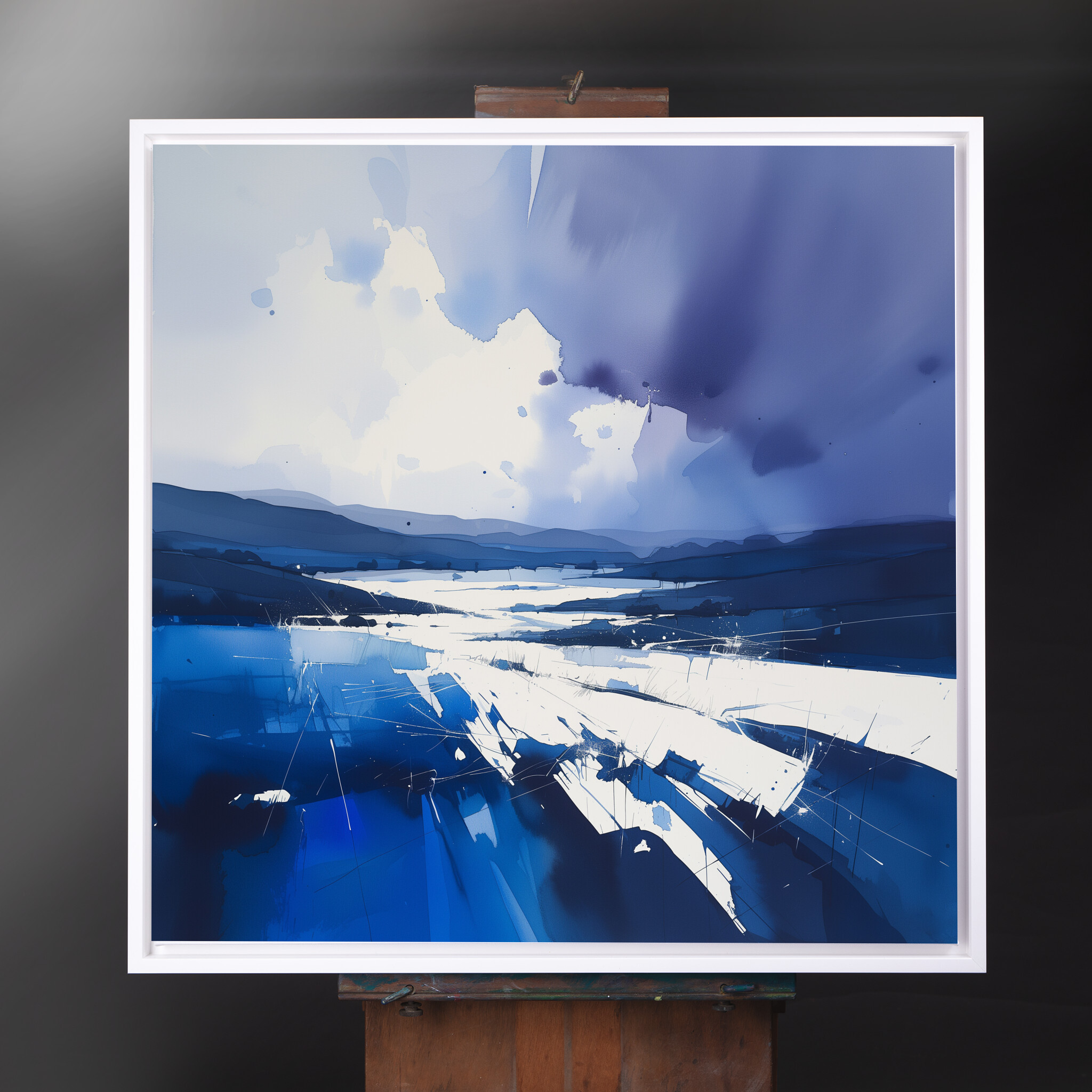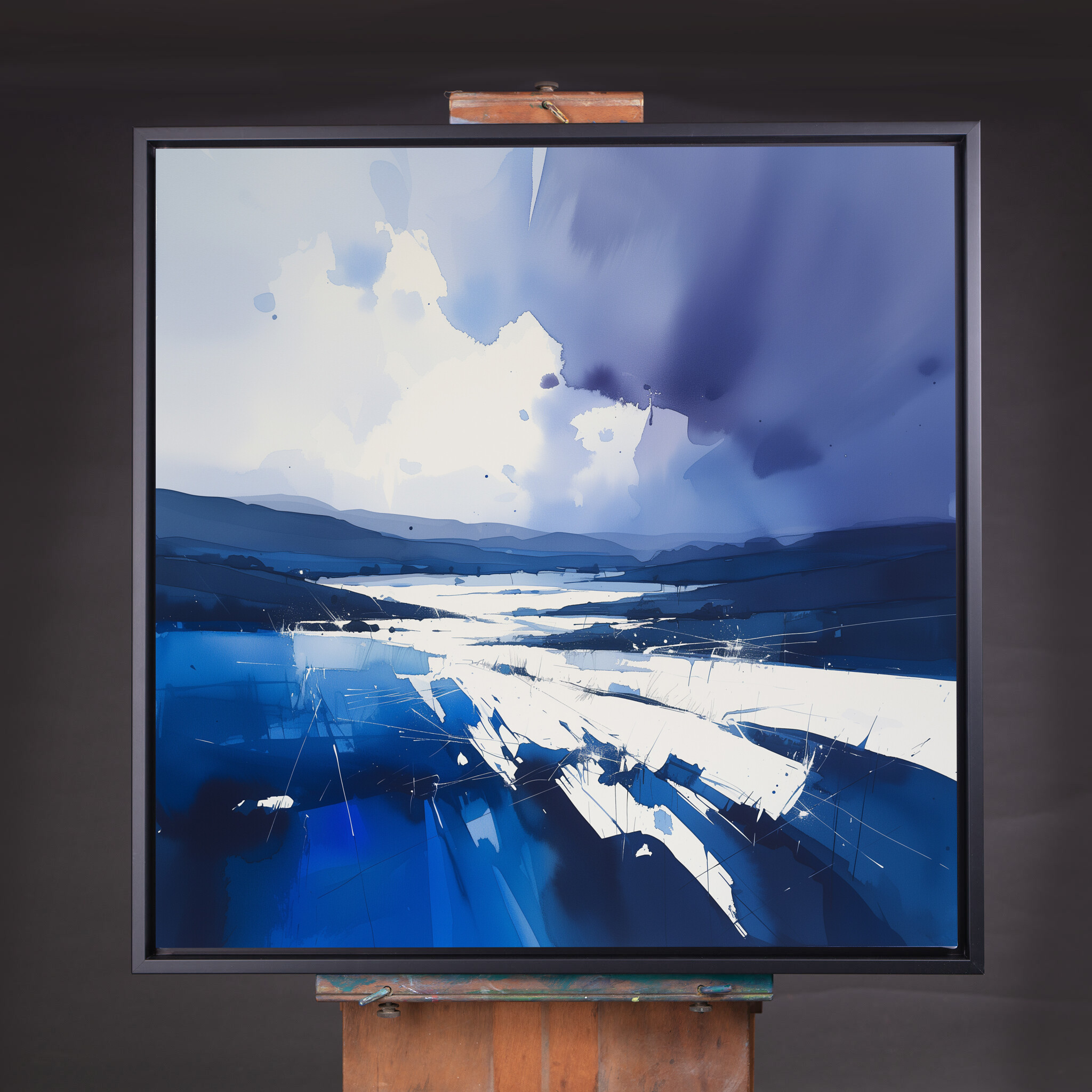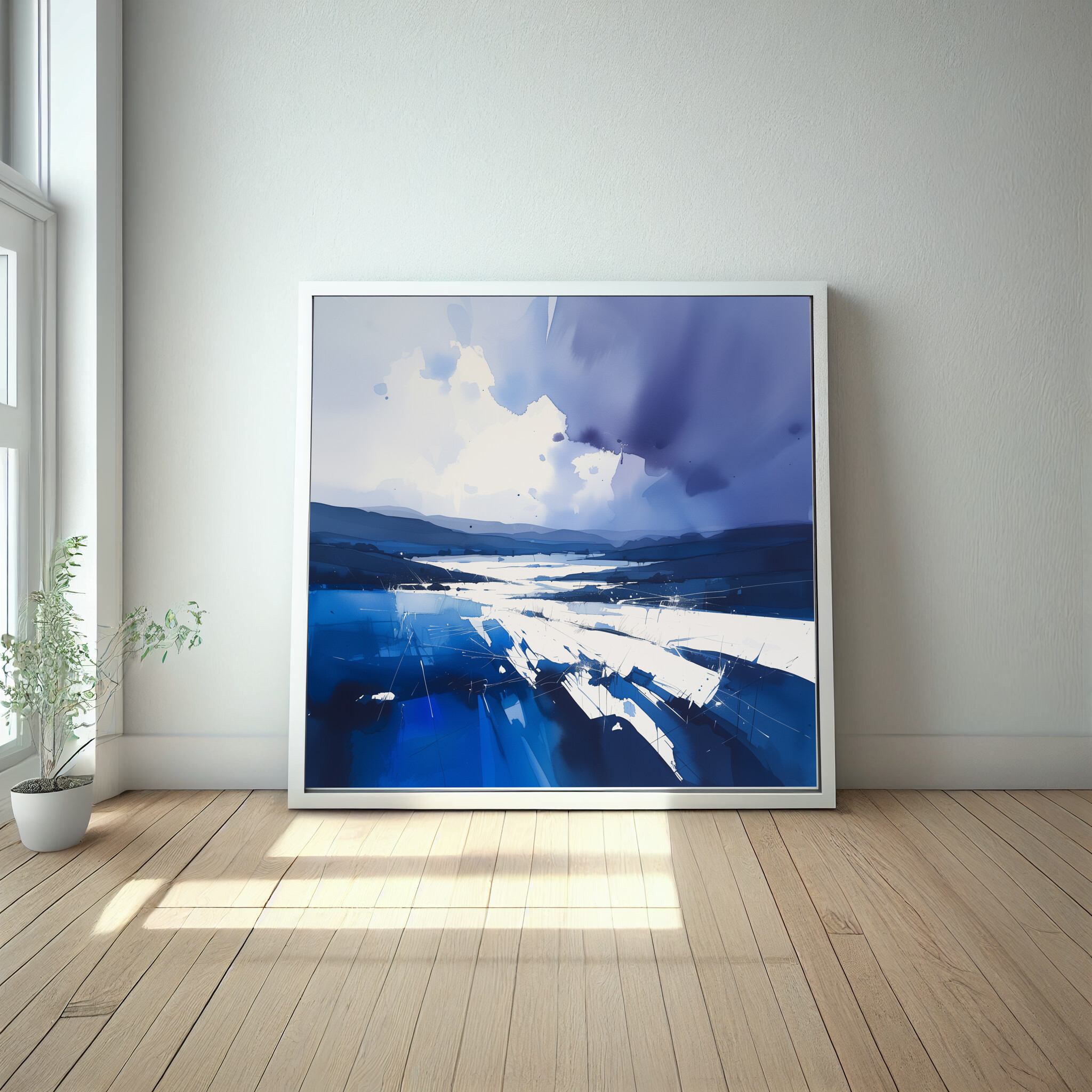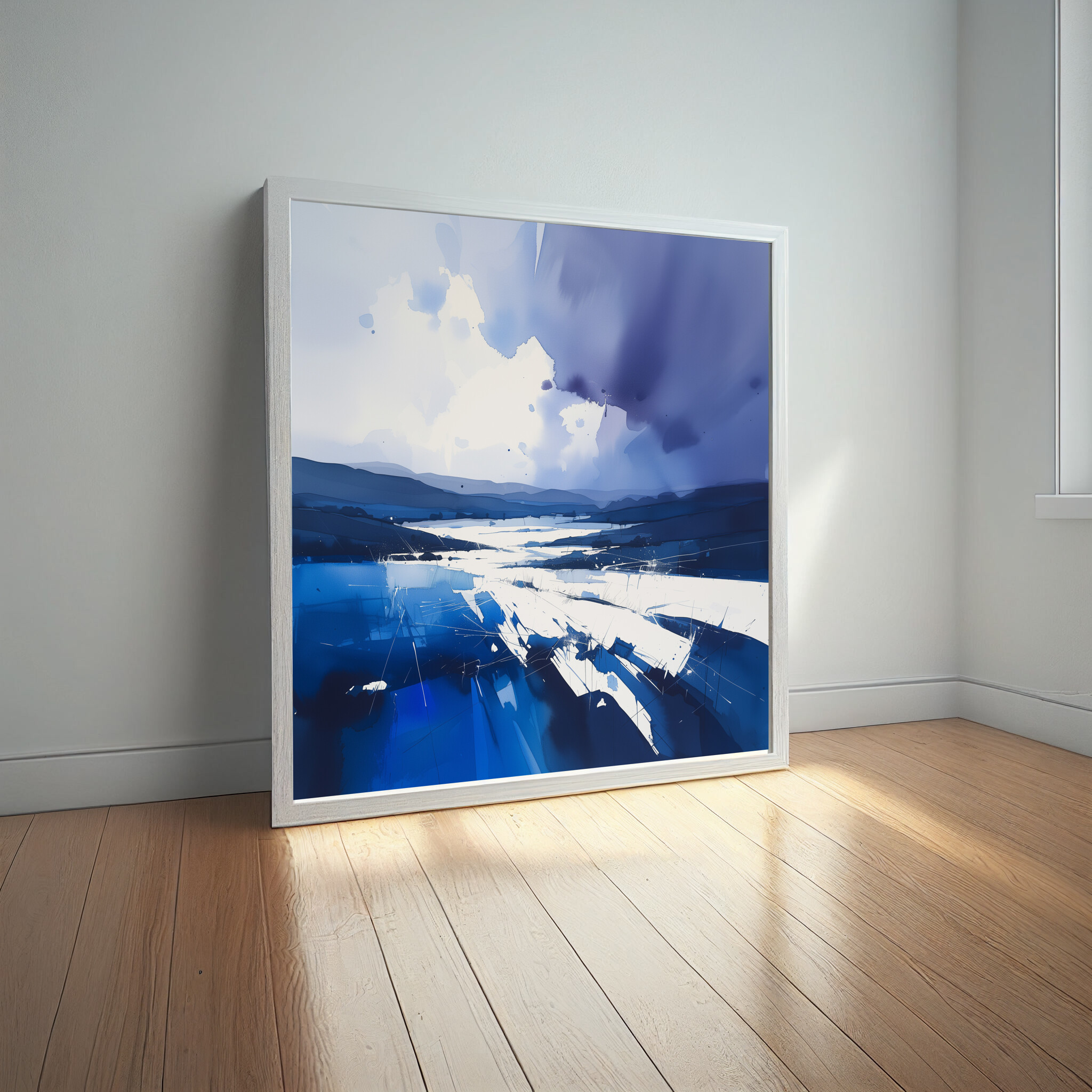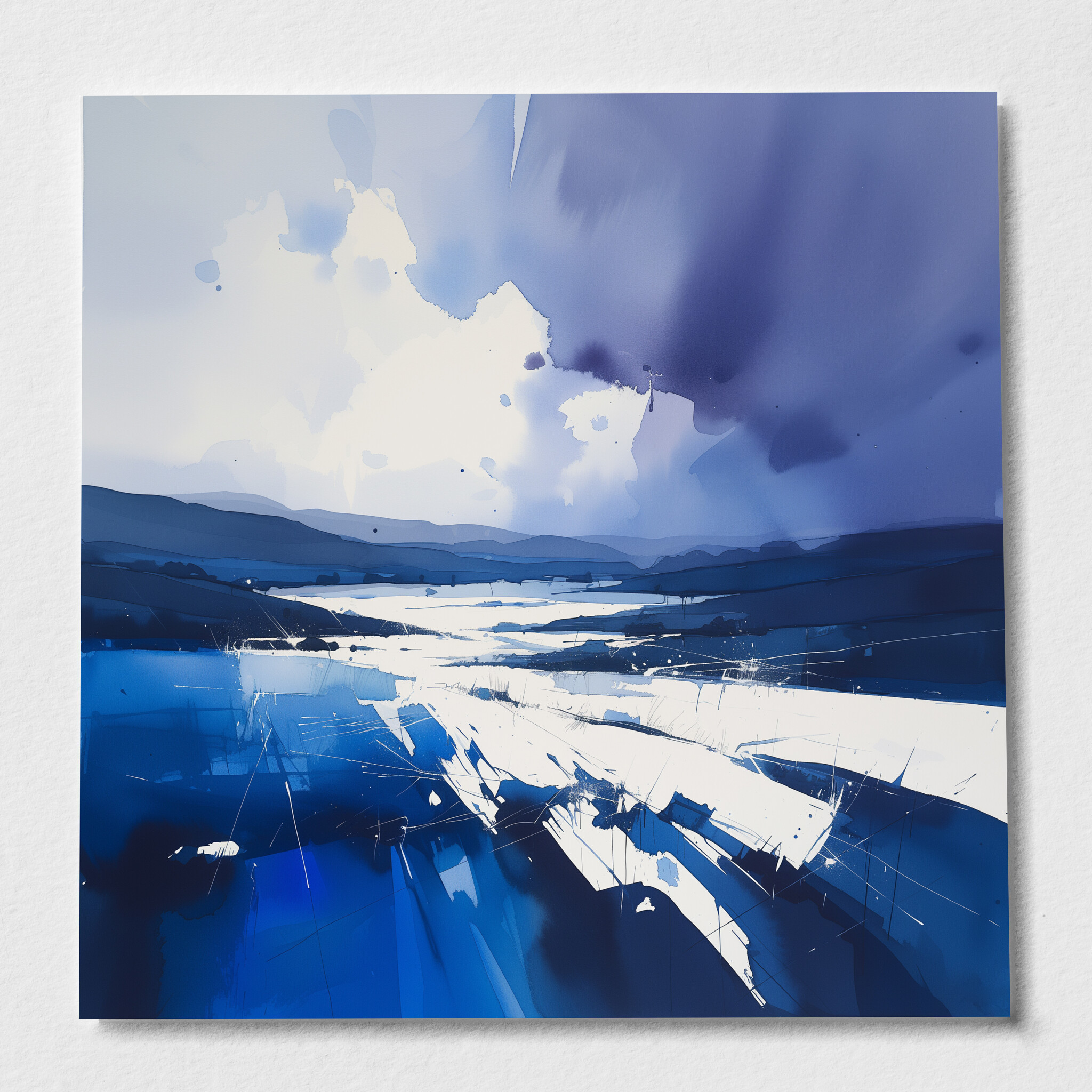 Experience the serene beauty of Sussex through this captivating abstract landscape. Rendered in stunning blue tones, this modern piece evokes a sense of tranquil serenity, reminiscent of the calmness that sweeps over the picturesque plains. The interplay of shadow and light, as depicted in this artwork, makes it a standout piece for any art collection.