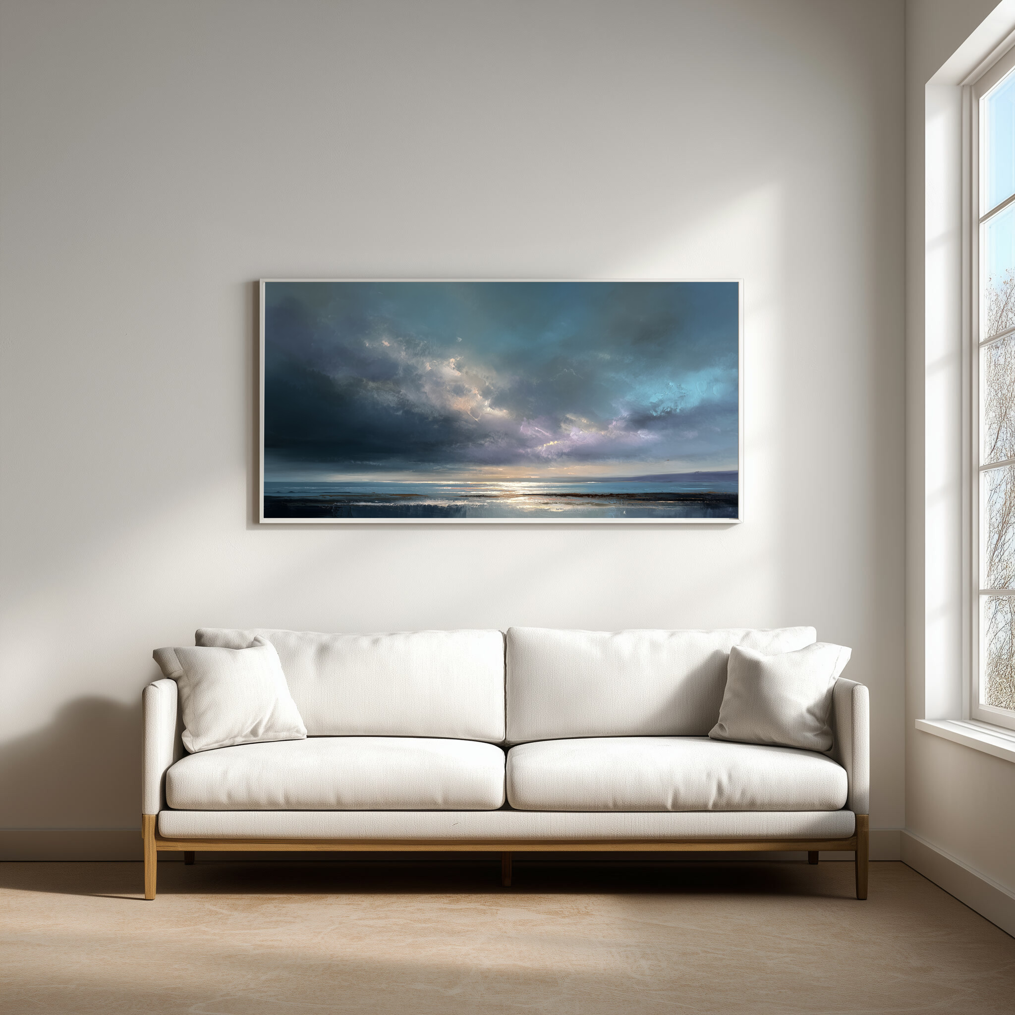 The gentle blend of blues and warm undercurrents creates a relaxing atmosphere, perfect for your living room or bedroom decor. Its soothing palette and abstract style also make it a versatile choice for office art, allowing a touch of nature’s calm in your workspace.