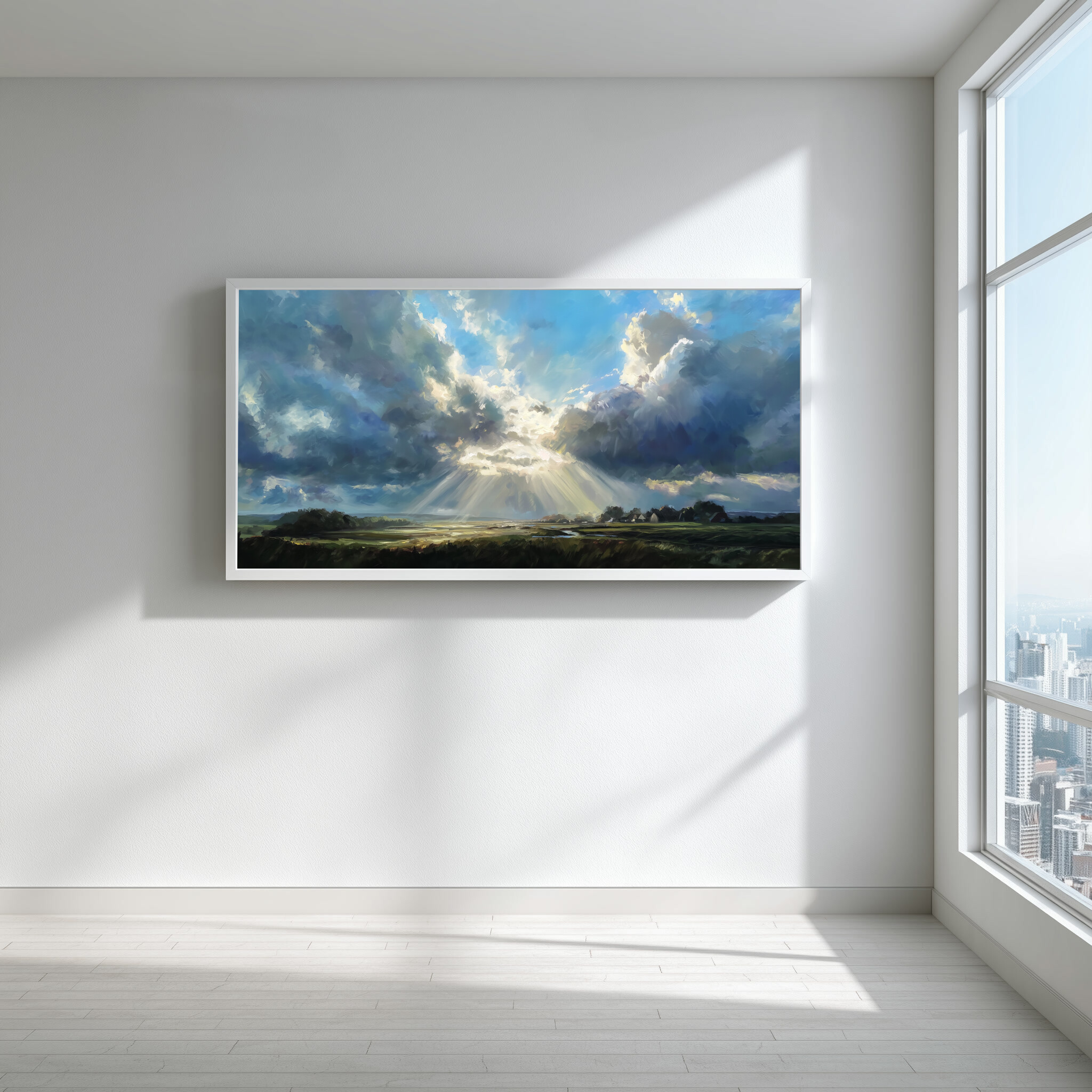 Experience the serene beauty of the Sussex countryside with this captivating impressionist landscape artwork. Dominated by a magnificent blue sky, the scene portrays dramatic clouds and sunbeams illuminating the verdant land below, capturing the essence of pastoral charm.
