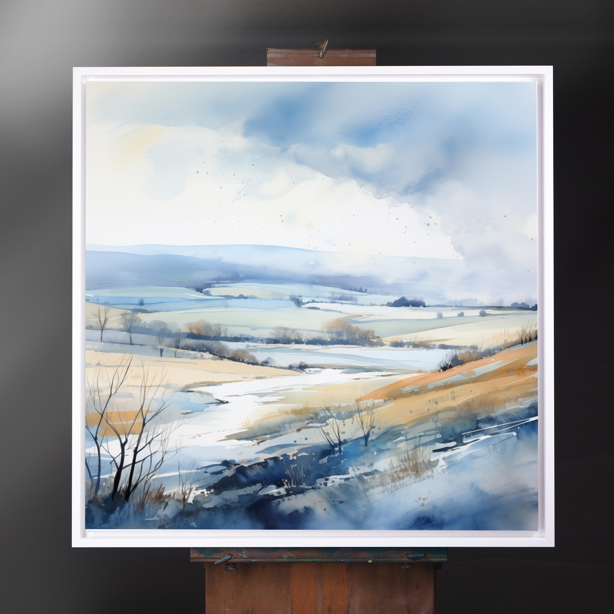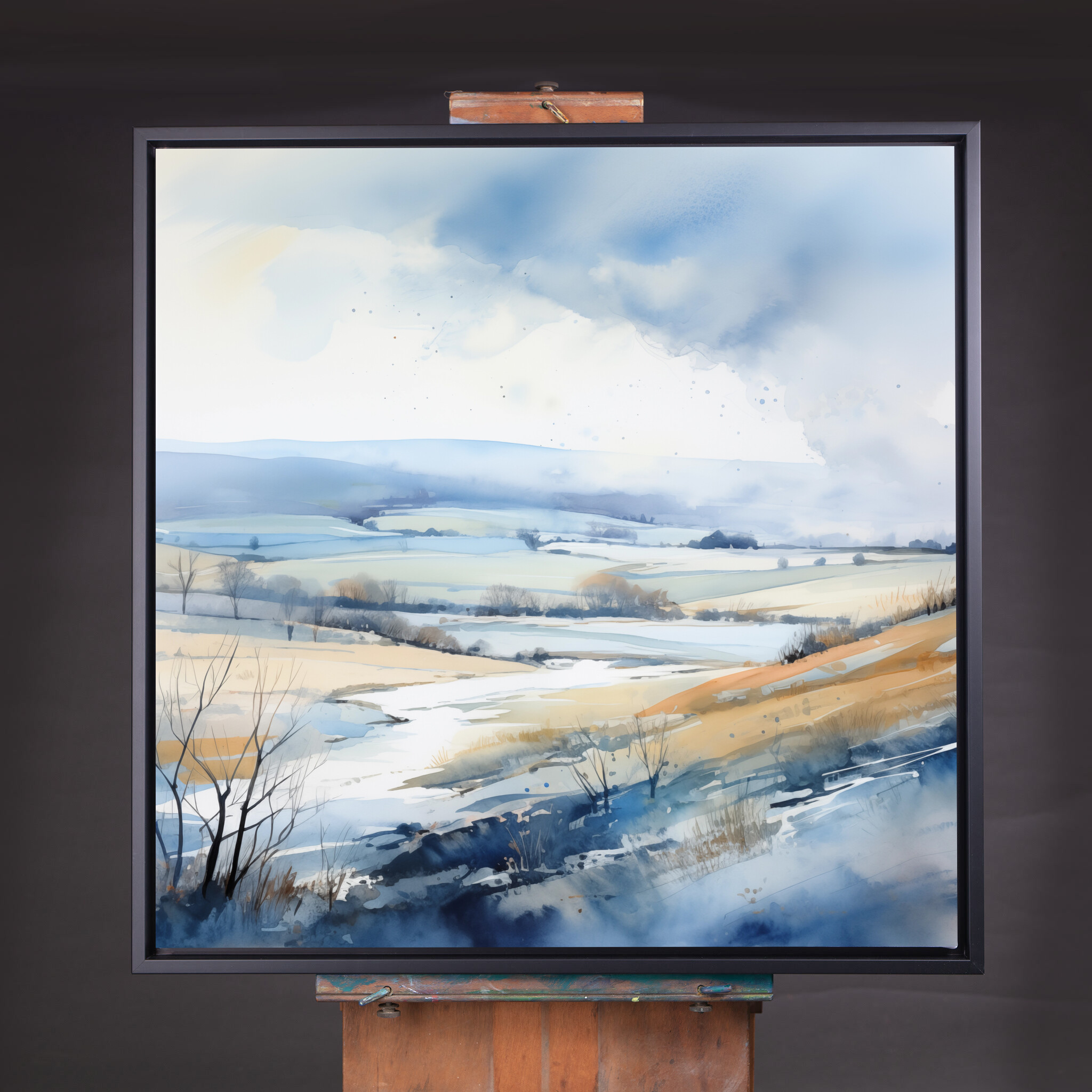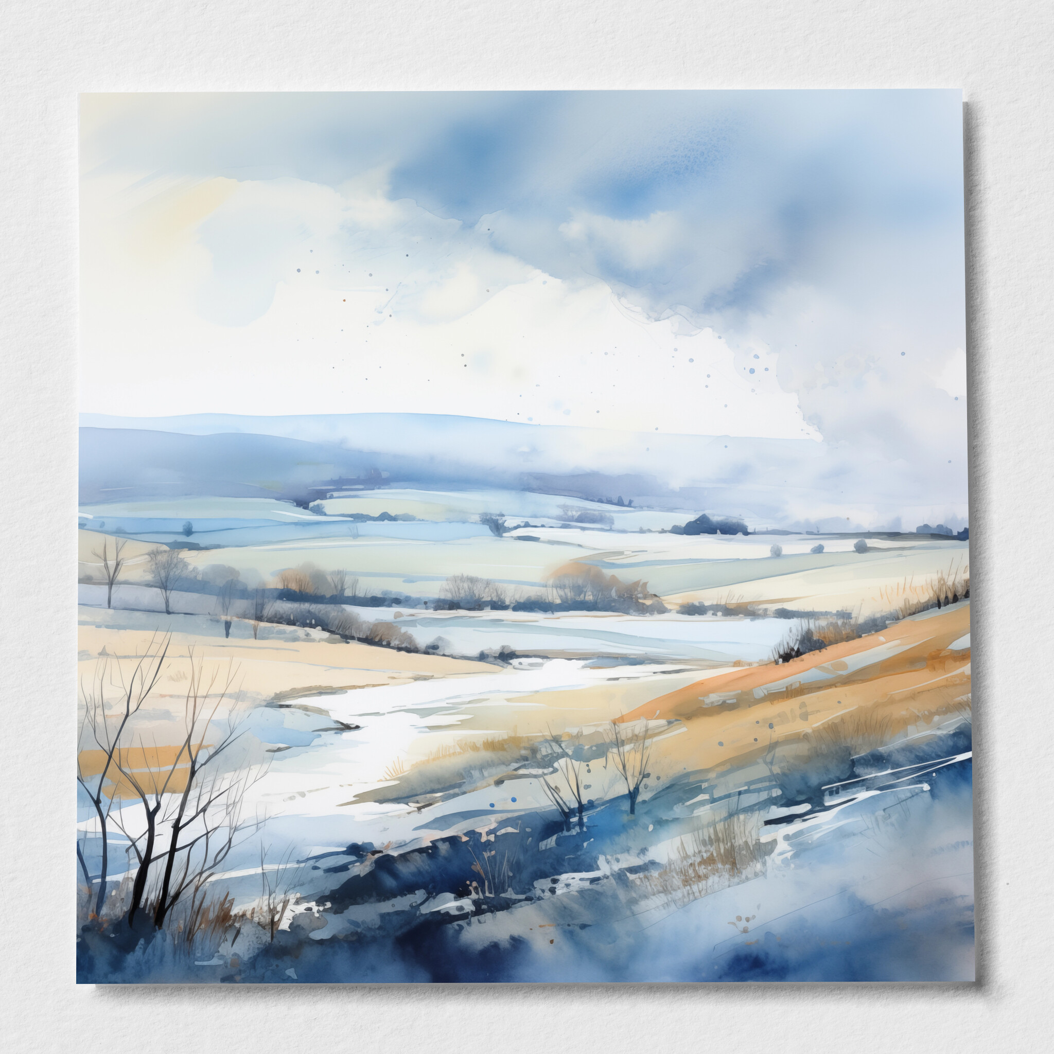 Immerse yourself in the serene beauty of Sussex with this impressionist landscape artwork. The piece beautifully blends calming blue hues with warm earth tones, creating a tranquil depiction of rolling hills and open fields. The sweeping brushstrokes and nuanced colour palette capture the gentle essence of the British countryside.