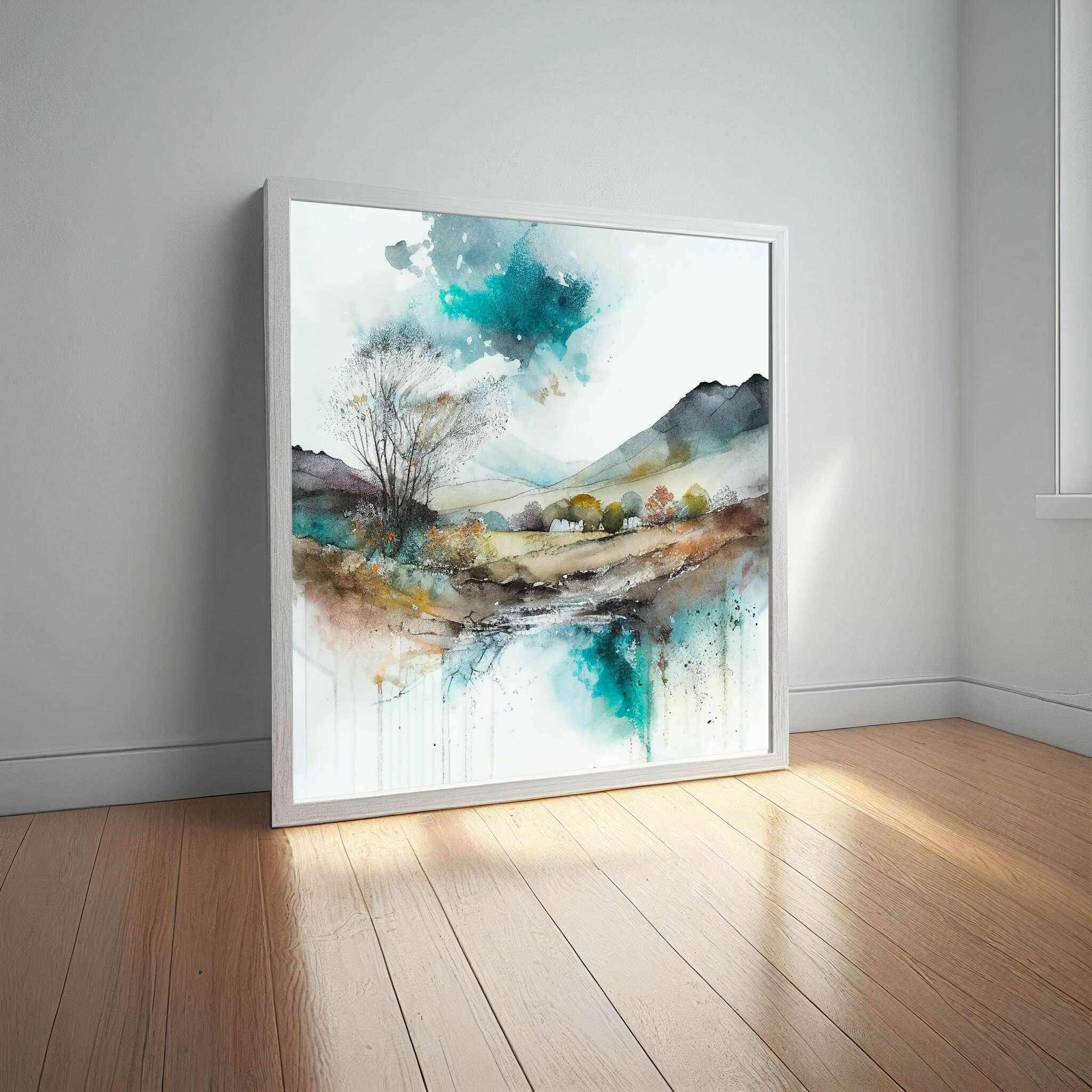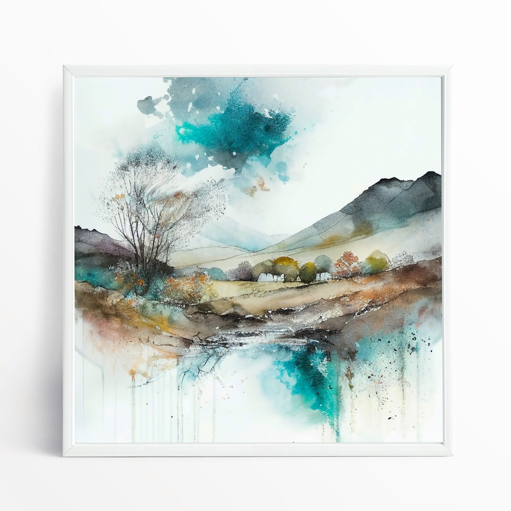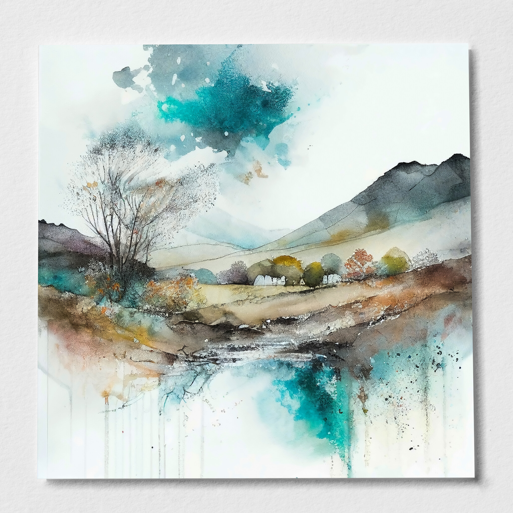 This exquisite watercolour landscape captures the serene beauty of Sussex with a harmonious blend of blues and warm earth tones. The abstract style invites viewers to explore the tranquil scenery, featuring expansive fields and a gentle stream. Perfect for enhancing the ambiance of your living room or office, this artwork exudes tranquillity and sophistication.