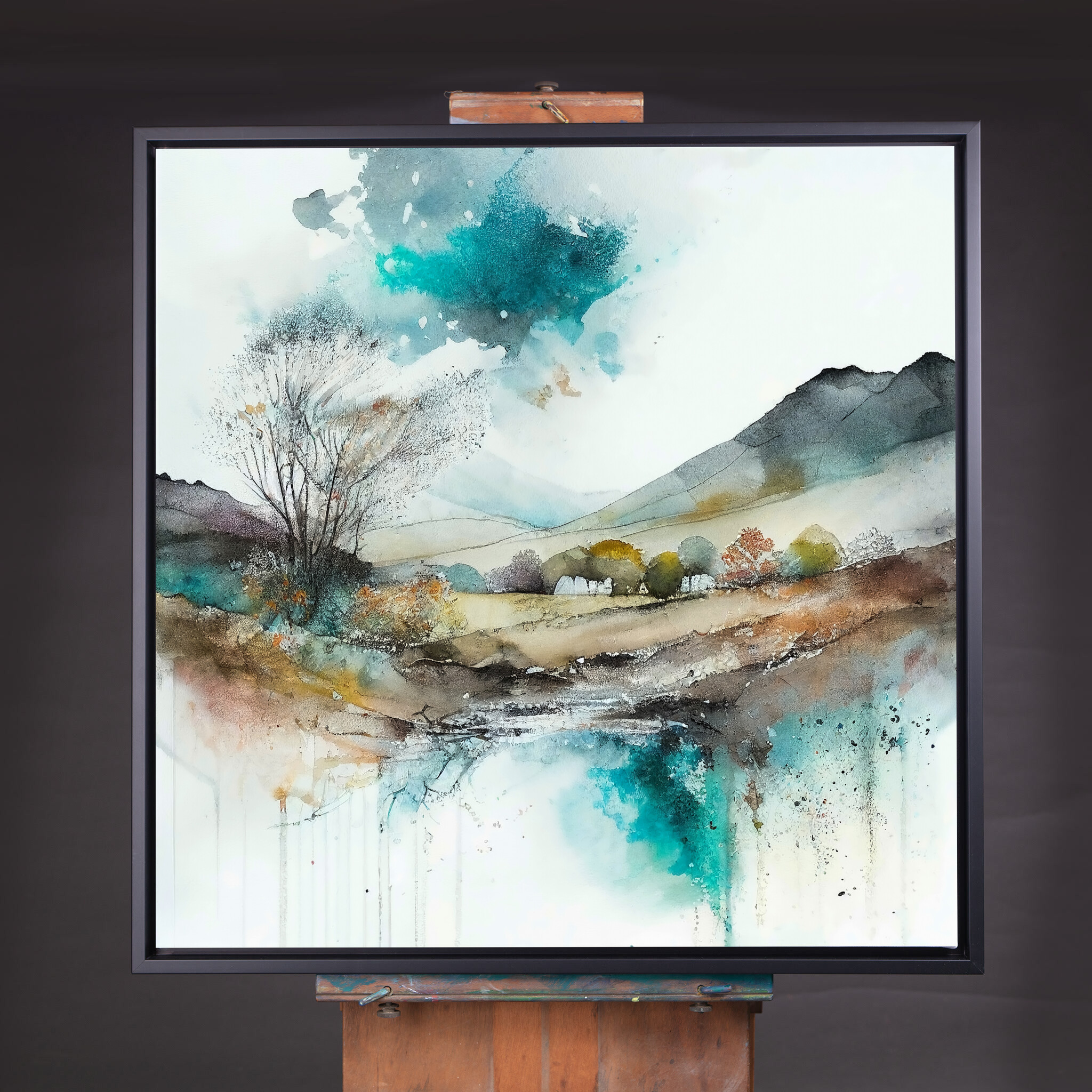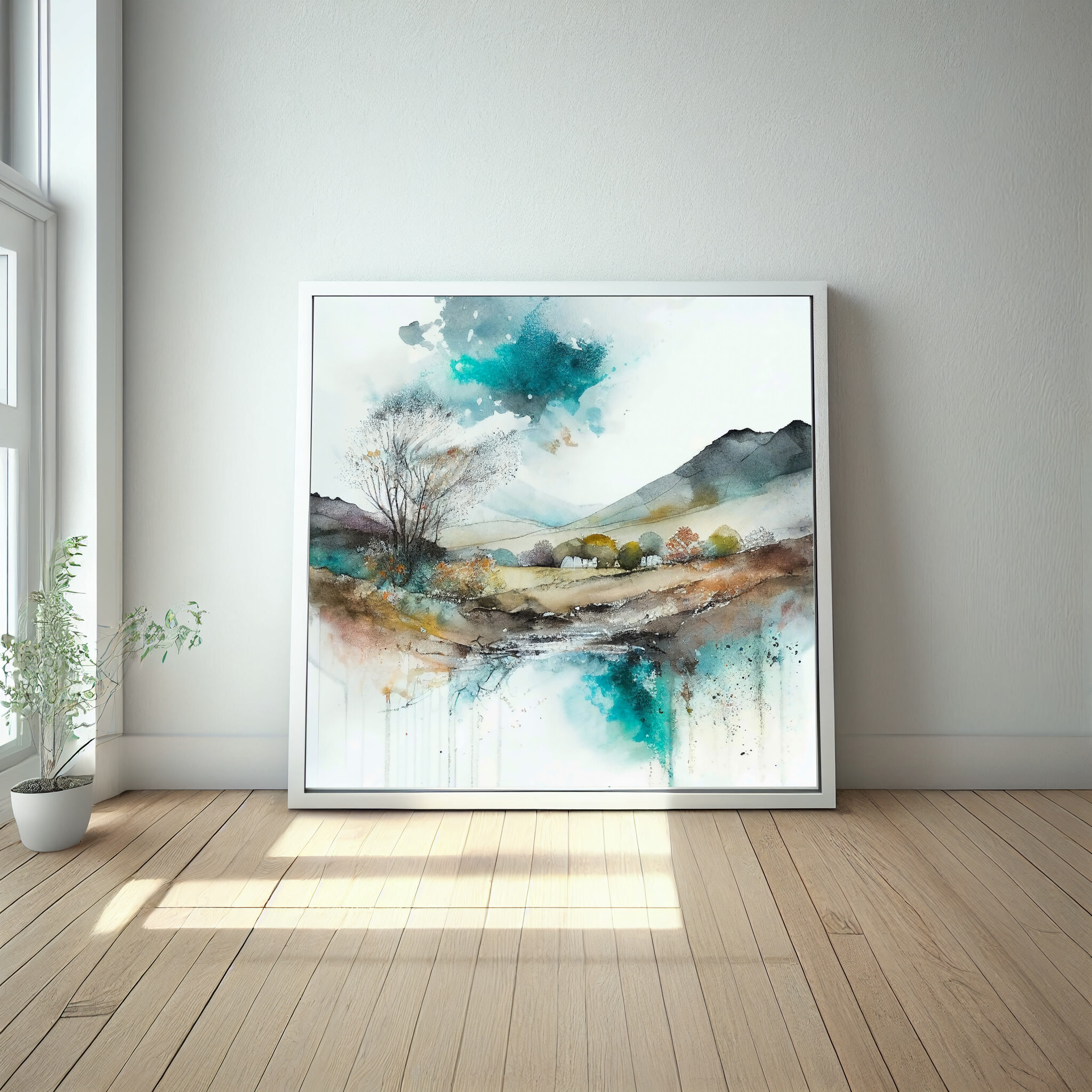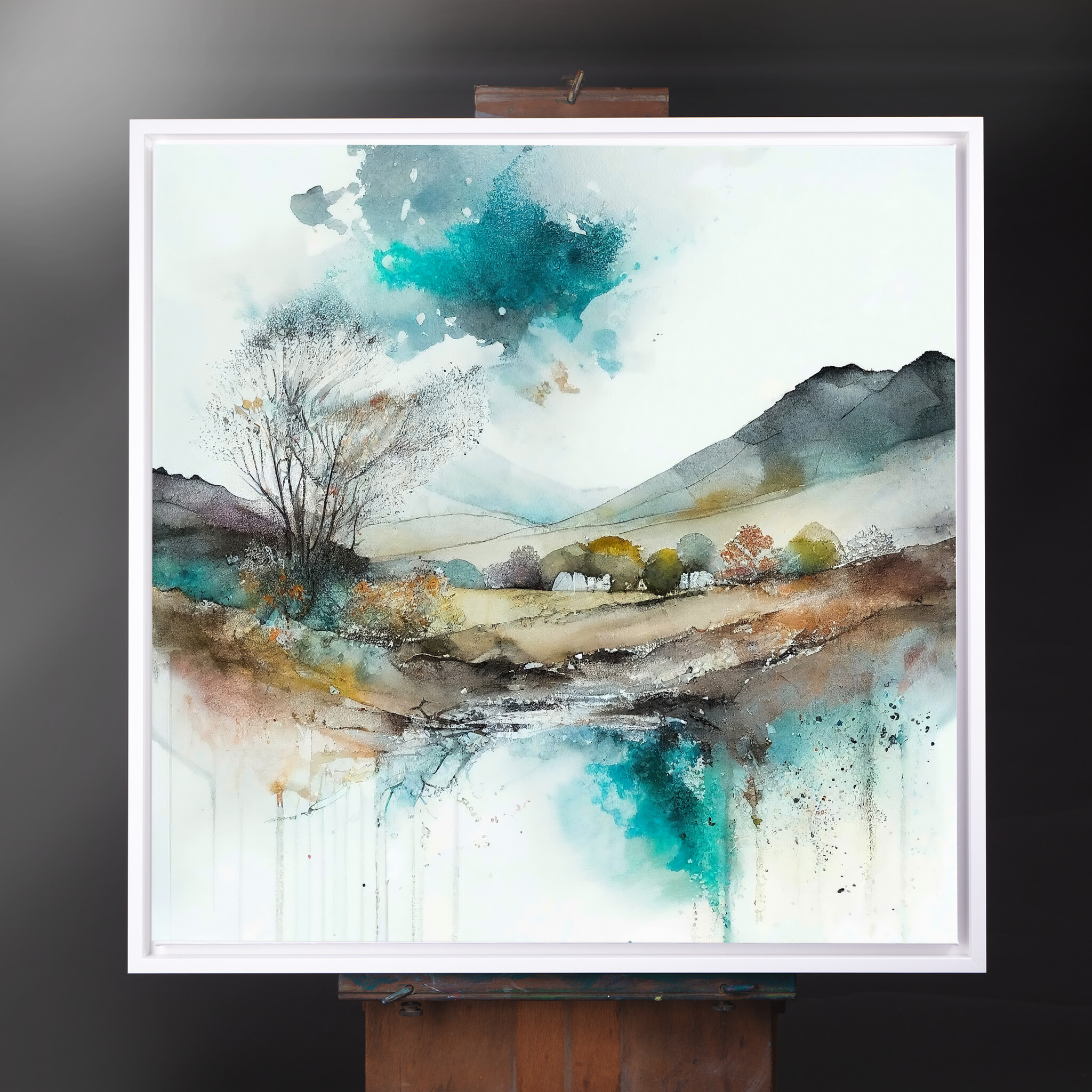 This exquisite watercolour landscape captures the serene beauty of Sussex with a harmonious blend of blues and warm earth tones. The abstract style invites viewers to explore the tranquil scenery, featuring expansive fields and a gentle stream. Perfect for enhancing the ambiance of your living room or office, this artwork exudes tranquillity and sophistication.