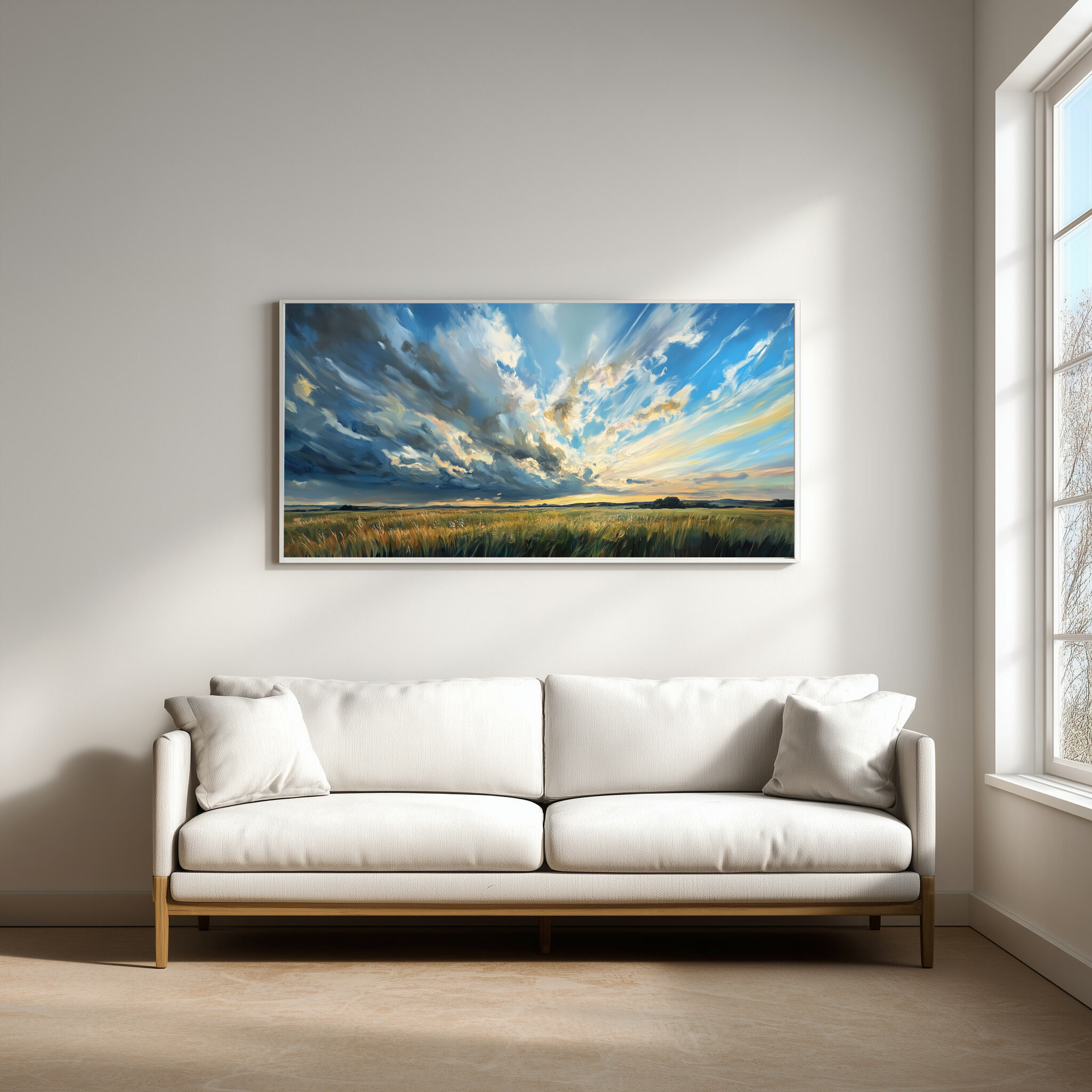 This stunning impressionist artwork captures the essence of a Sussex wheat field beneath an expansive and dynamic blue sky. With warm tones and subtle yellow accents, the painting conveys a sense of serenity and natural beauty. Perfectly suited for those who appreciate landscapes and the charm of countryside scenes.