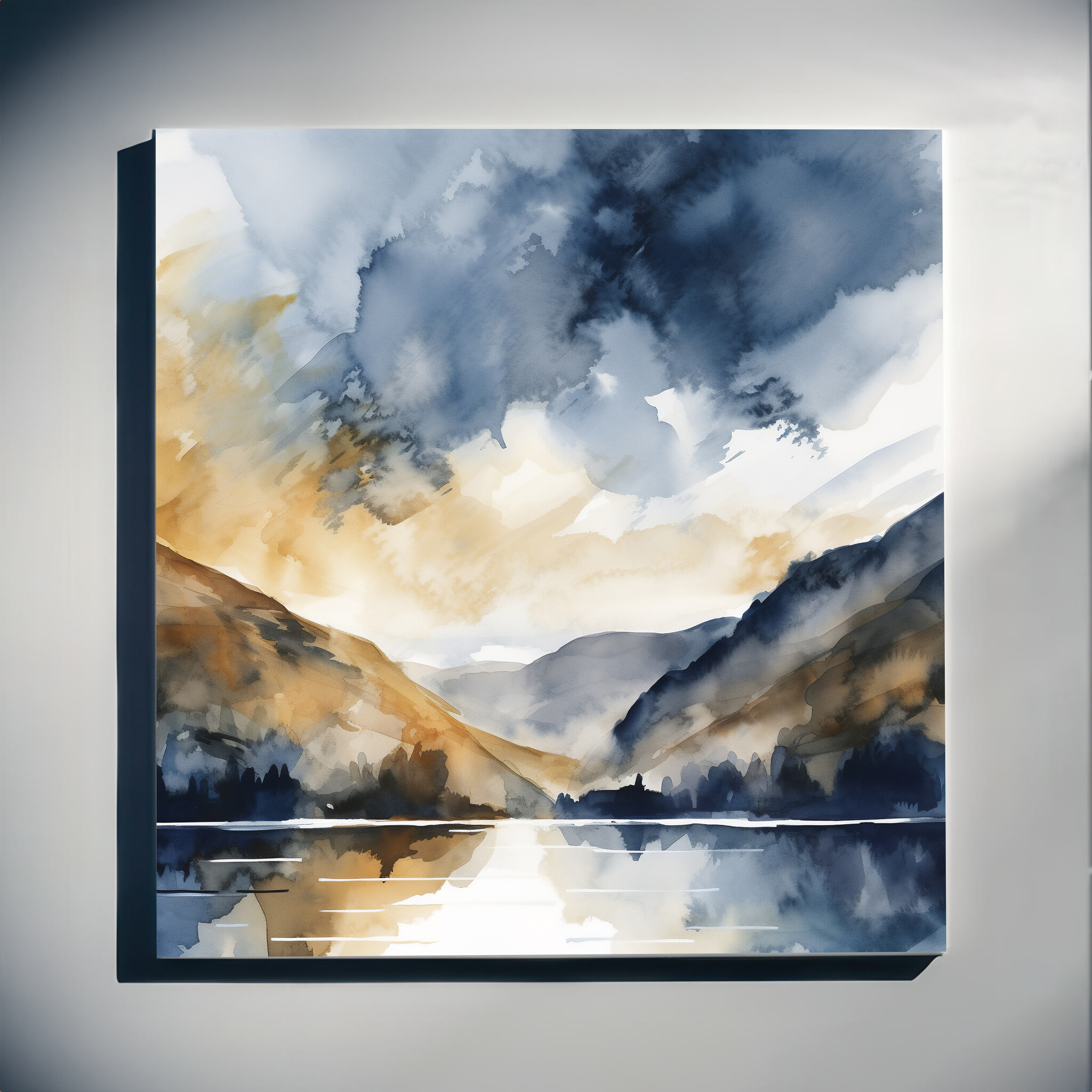 This stunning watercolor artwork captures the serene beauty of Thirlmere, with abstract brushstrokes that blend calming blue tones and warm golden hues. The painting evokes a tranquil mood, beautifully balancing the natural landscape with an impressionist style.