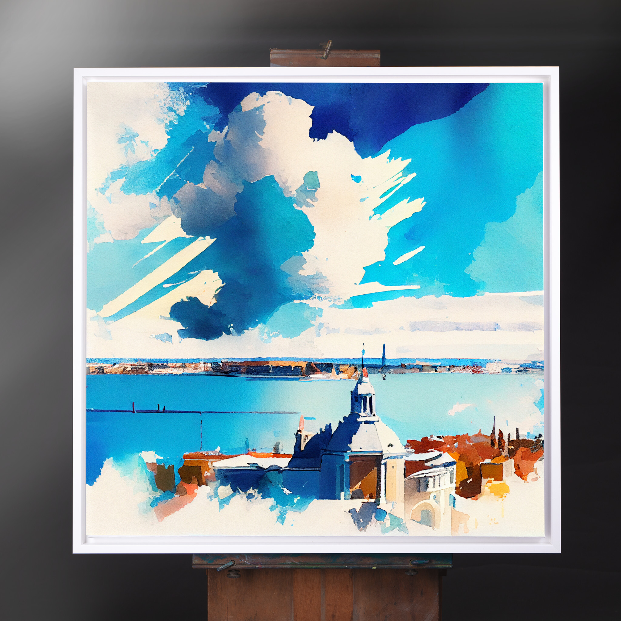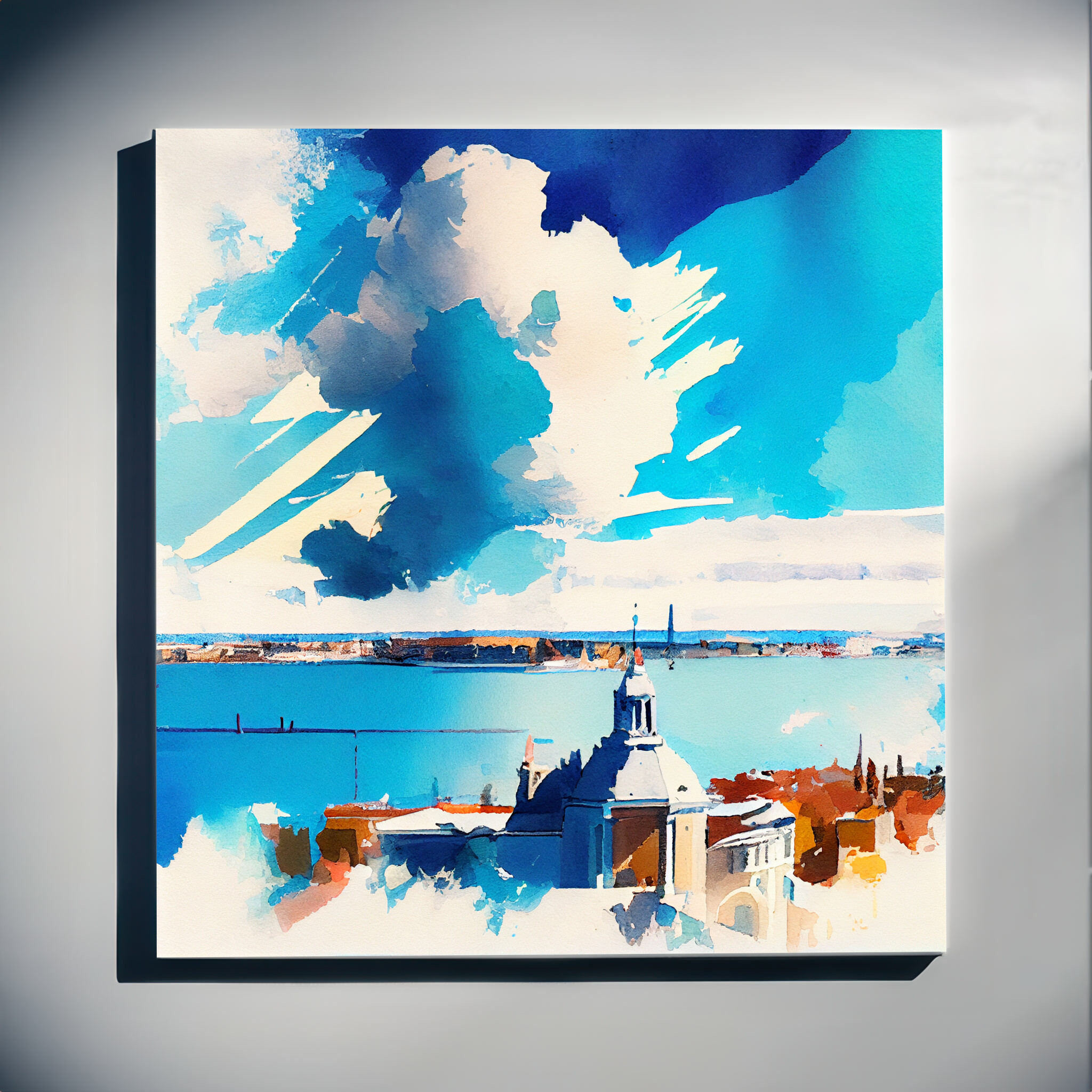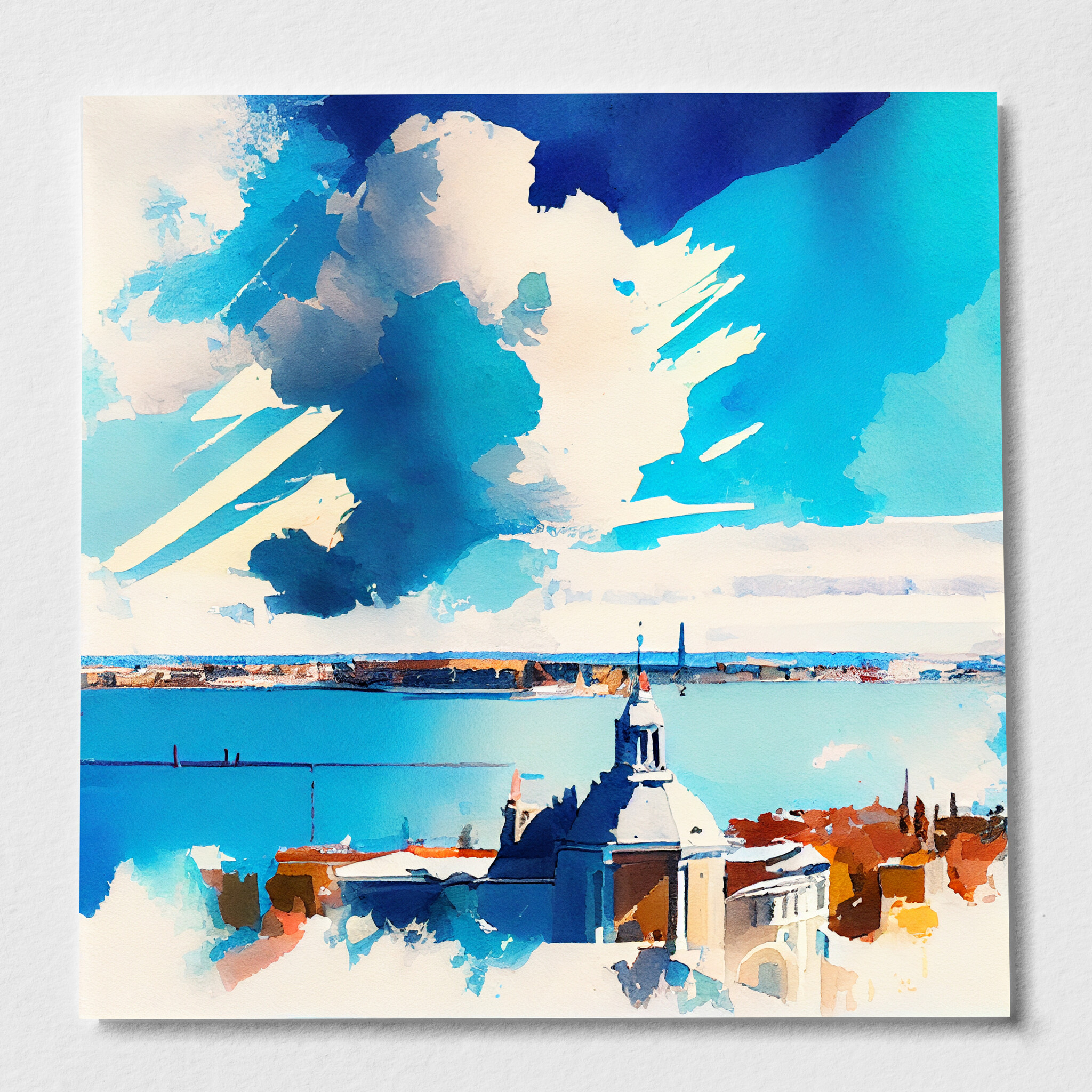 This stunning watercolor captures the romantic skyline of Venice in impressionist style. Dominated by blue art, the painting reflects the tranquil and captivating nature of this historic city. The sweeping clouds and serene waters evoke a sense of peace and elegance. Perfectly suited for living room art, bedroom decor, or even as office art, this versatile piece enhances any space with its serene qualities.