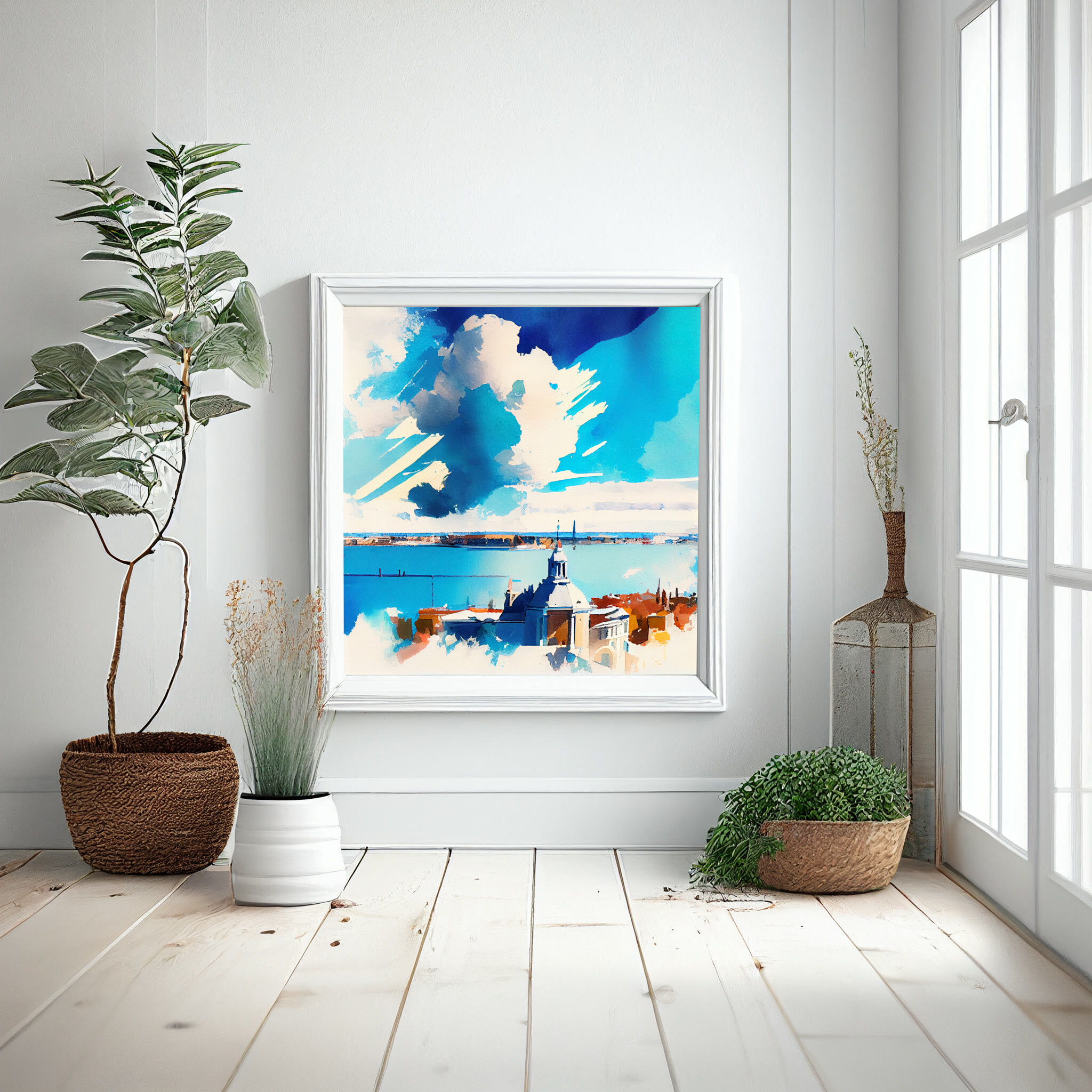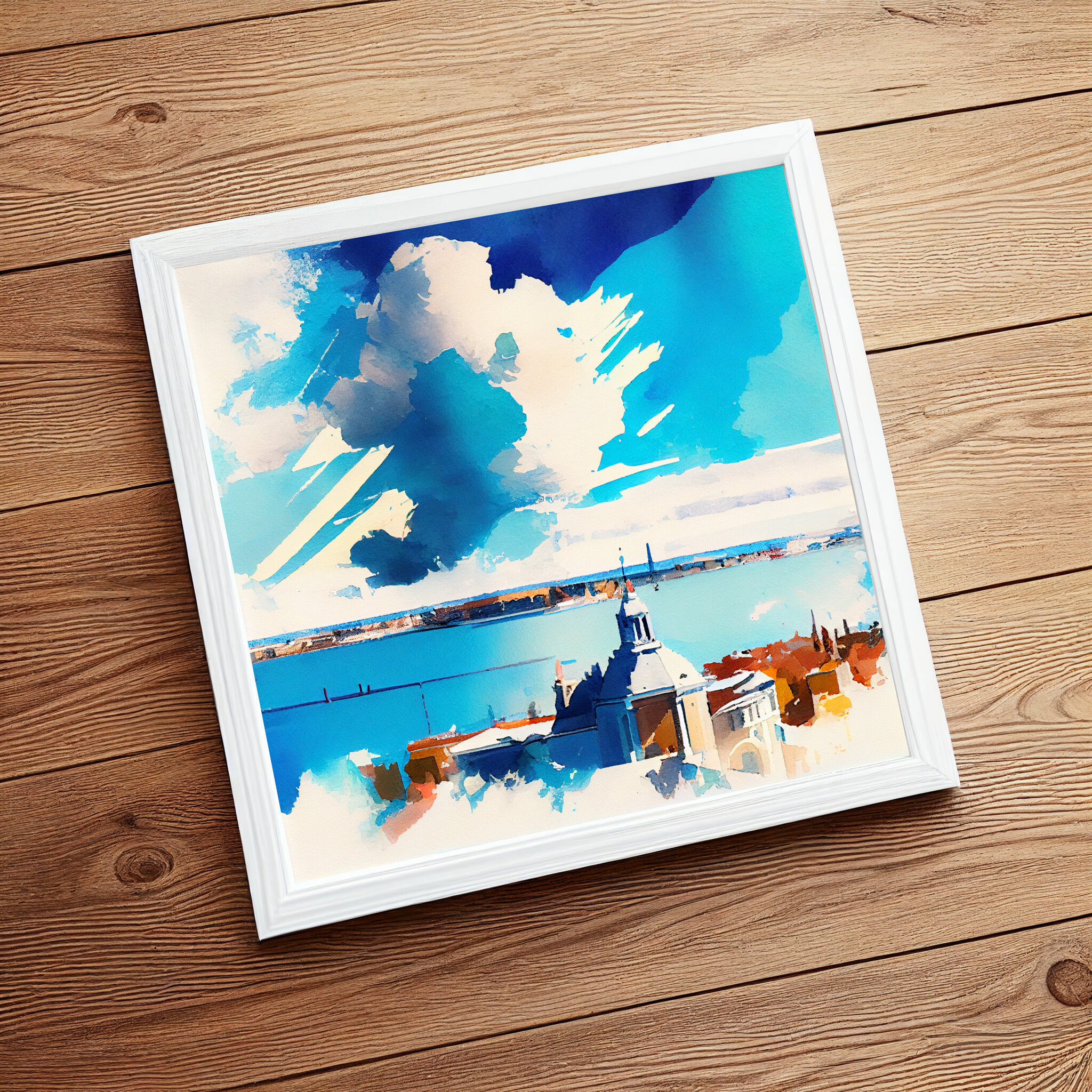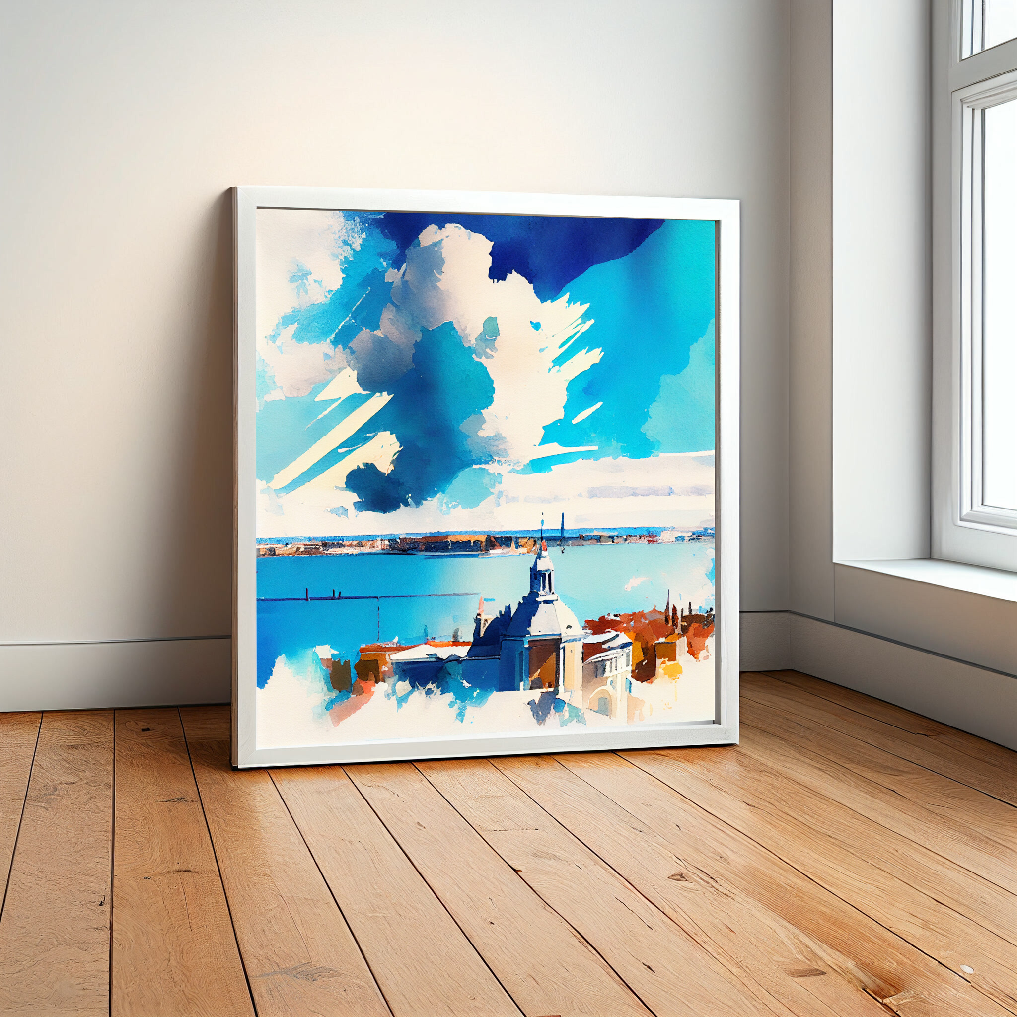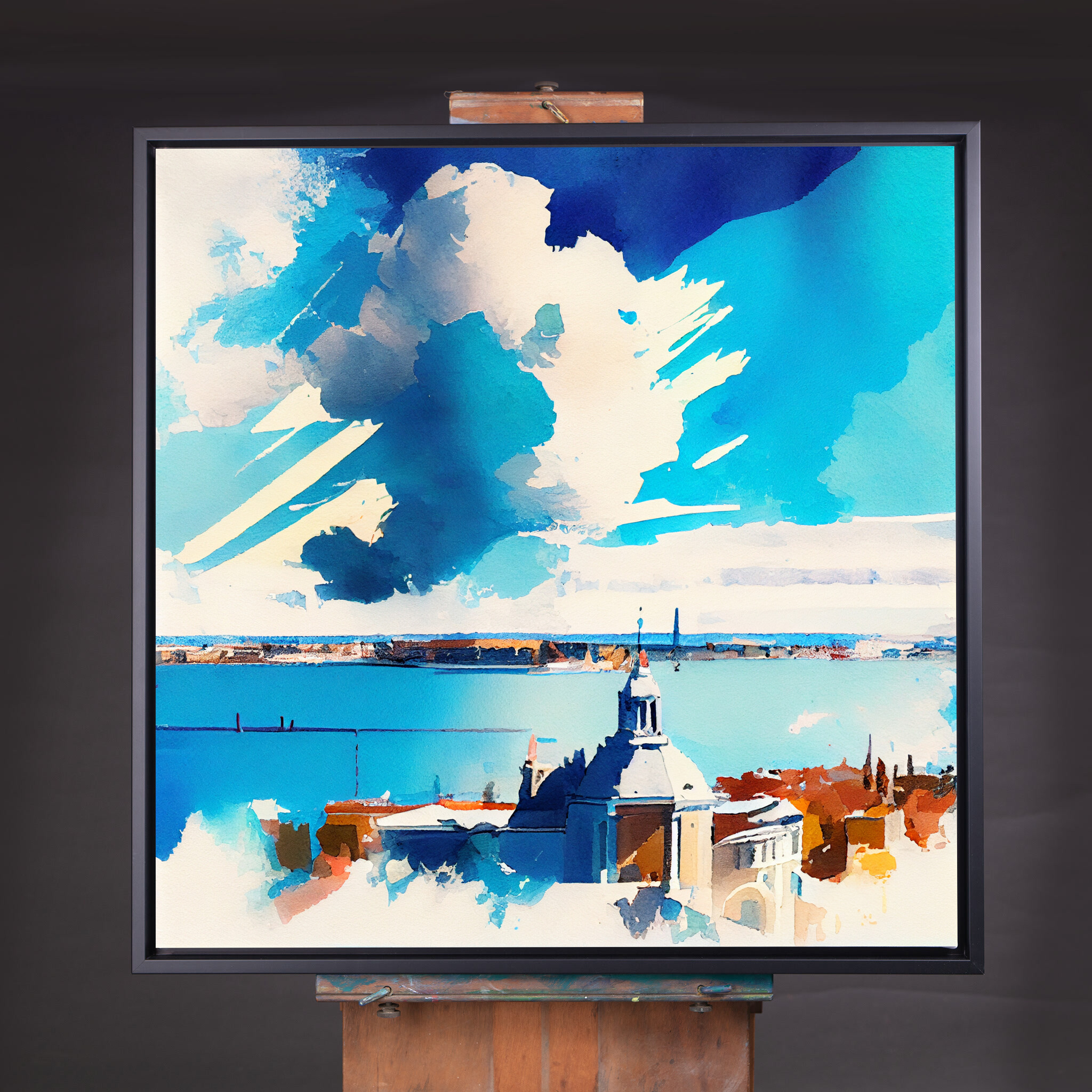 This stunning watercolor captures the romantic skyline of Venice in impressionist style. Dominated by blue art, the painting reflects the tranquil and captivating nature of this historic city. The sweeping clouds and serene waters evoke a sense of peace and elegance. Perfectly suited for living room art, bedroom decor, or even as office art, this versatile piece enhances any space with its serene qualities.