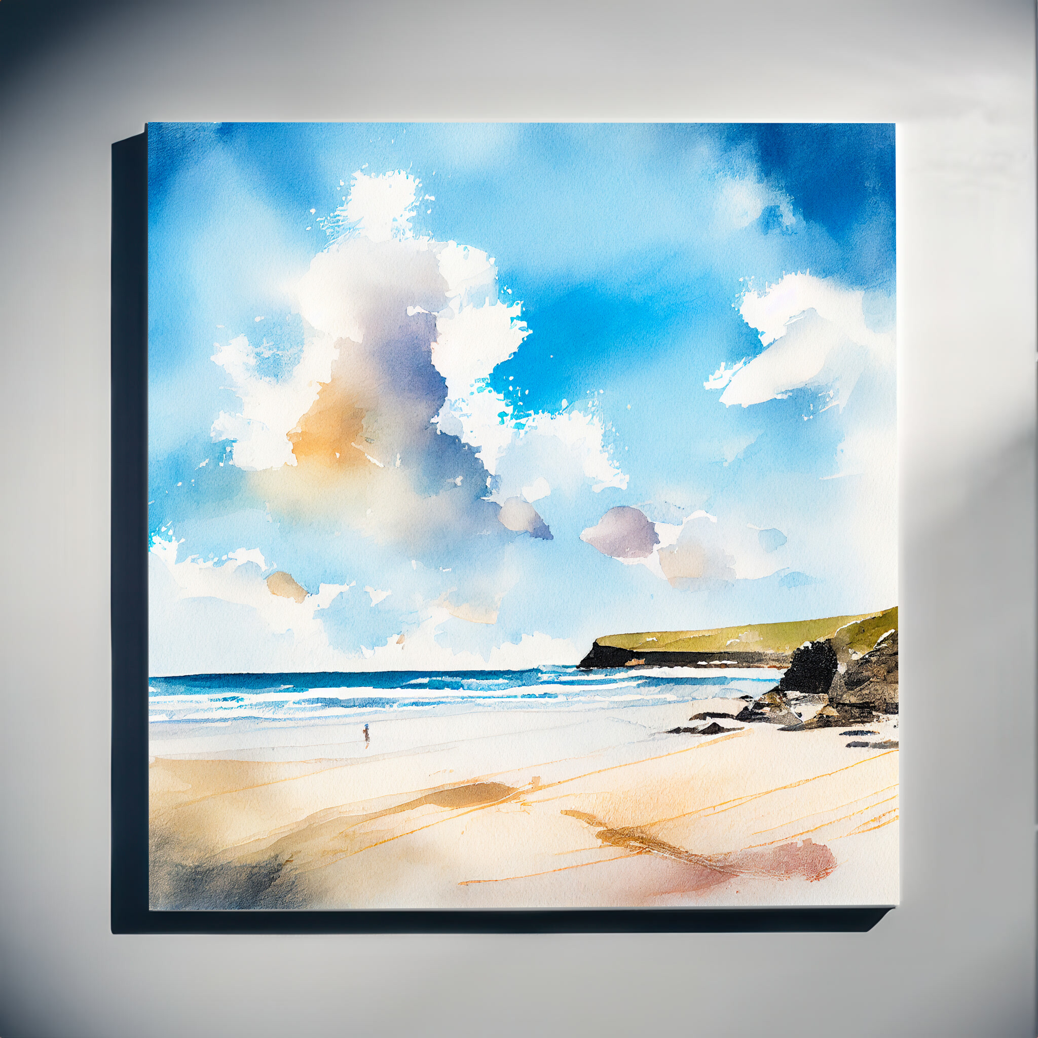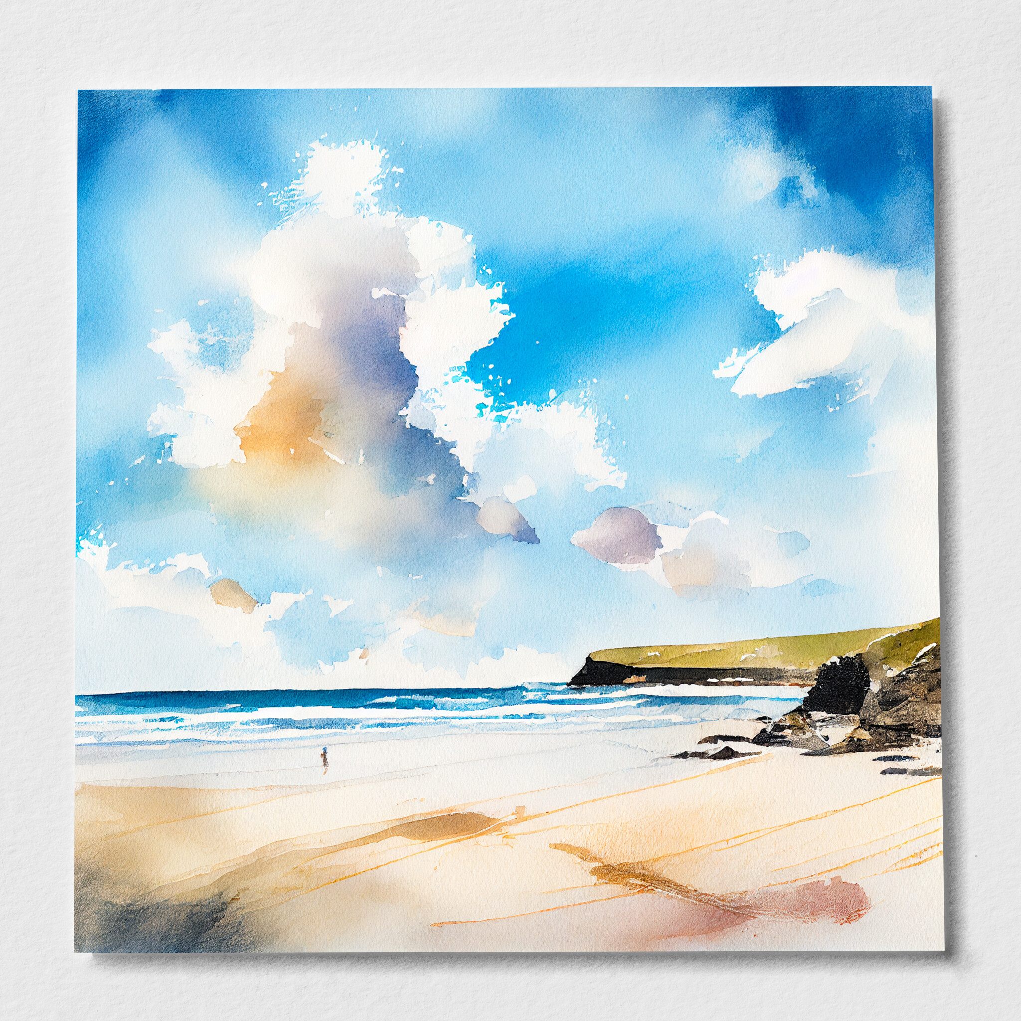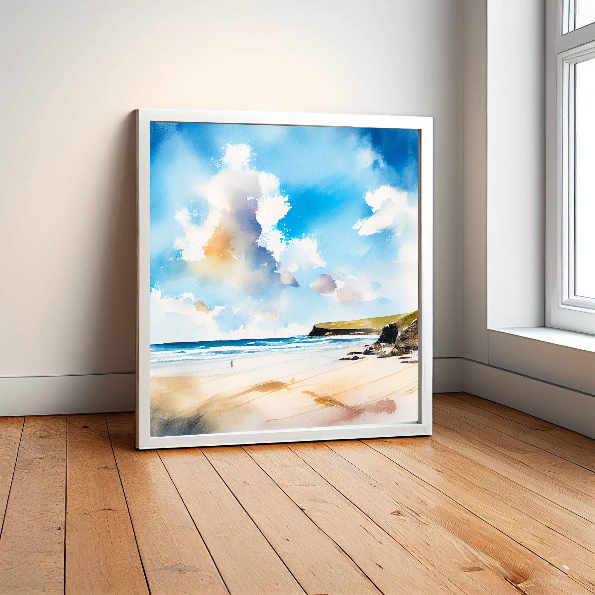 This stunning watercolor captures the tranquil beauty of Watergate Bay in Cornwall, with a focus on the rich blue tones of the sky and ocean. The inviting beach scene is depicted in a modern, abstract style, bringing the coastal serenity right into your home decor. Perfect for your living room or office to evoke a sense of calm and relaxation.