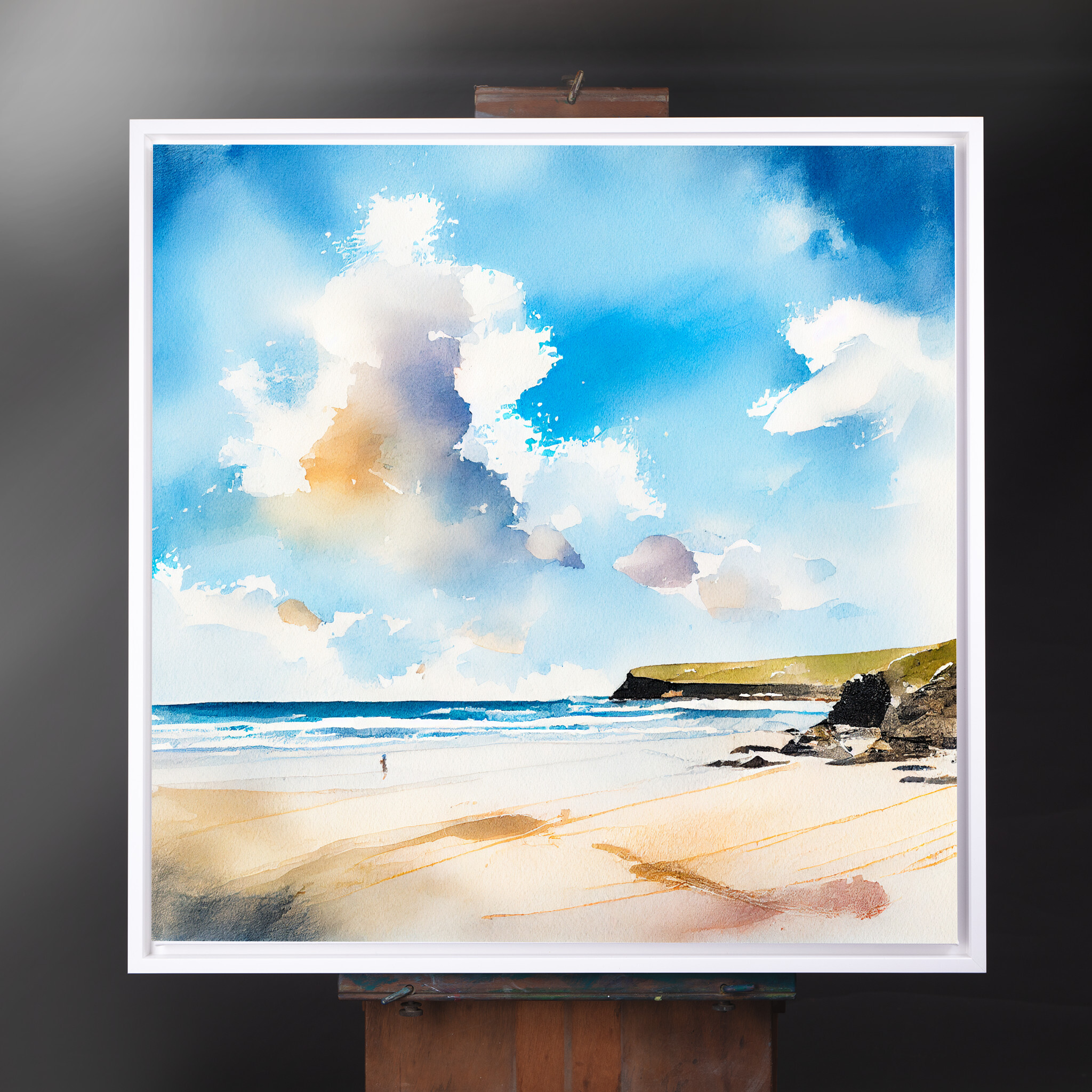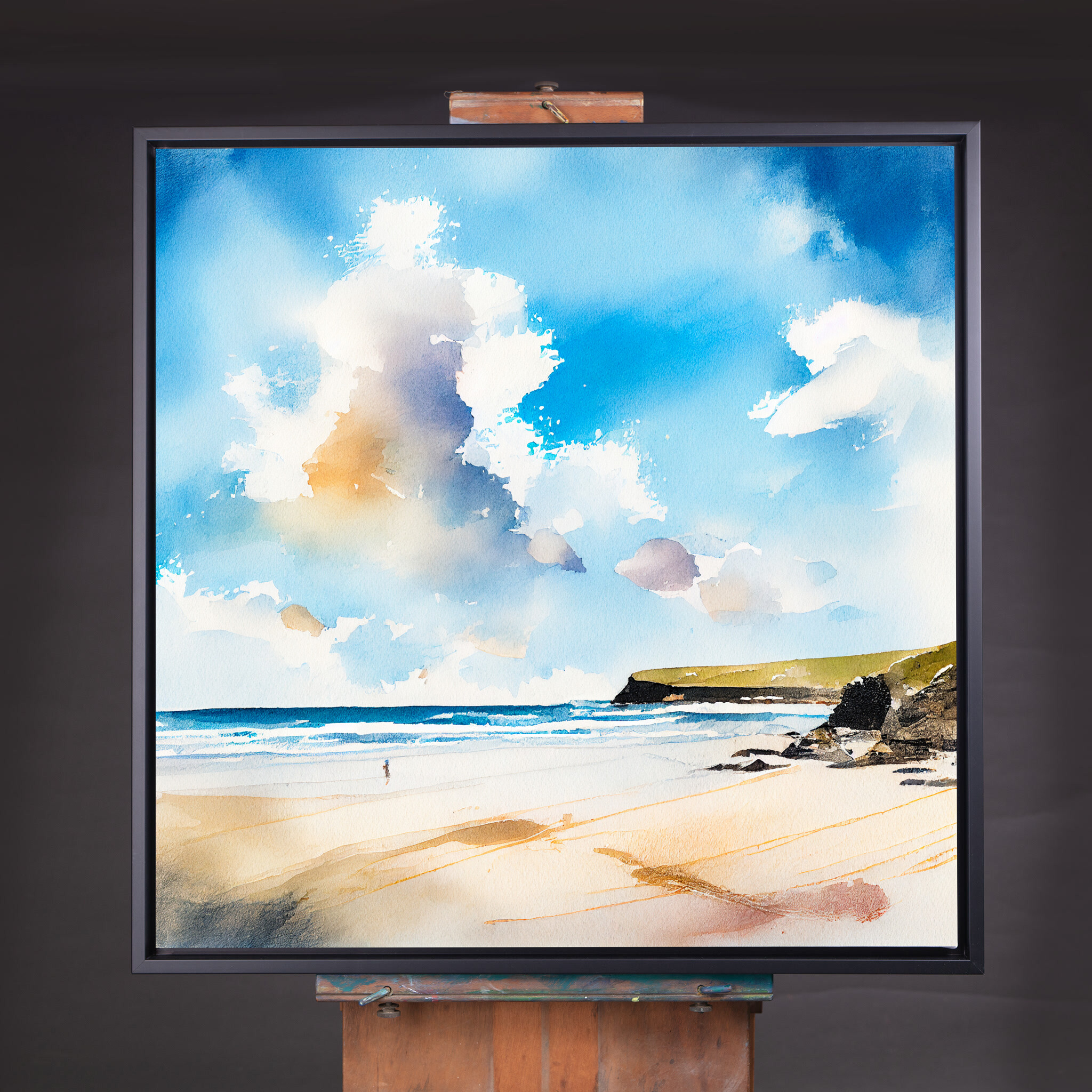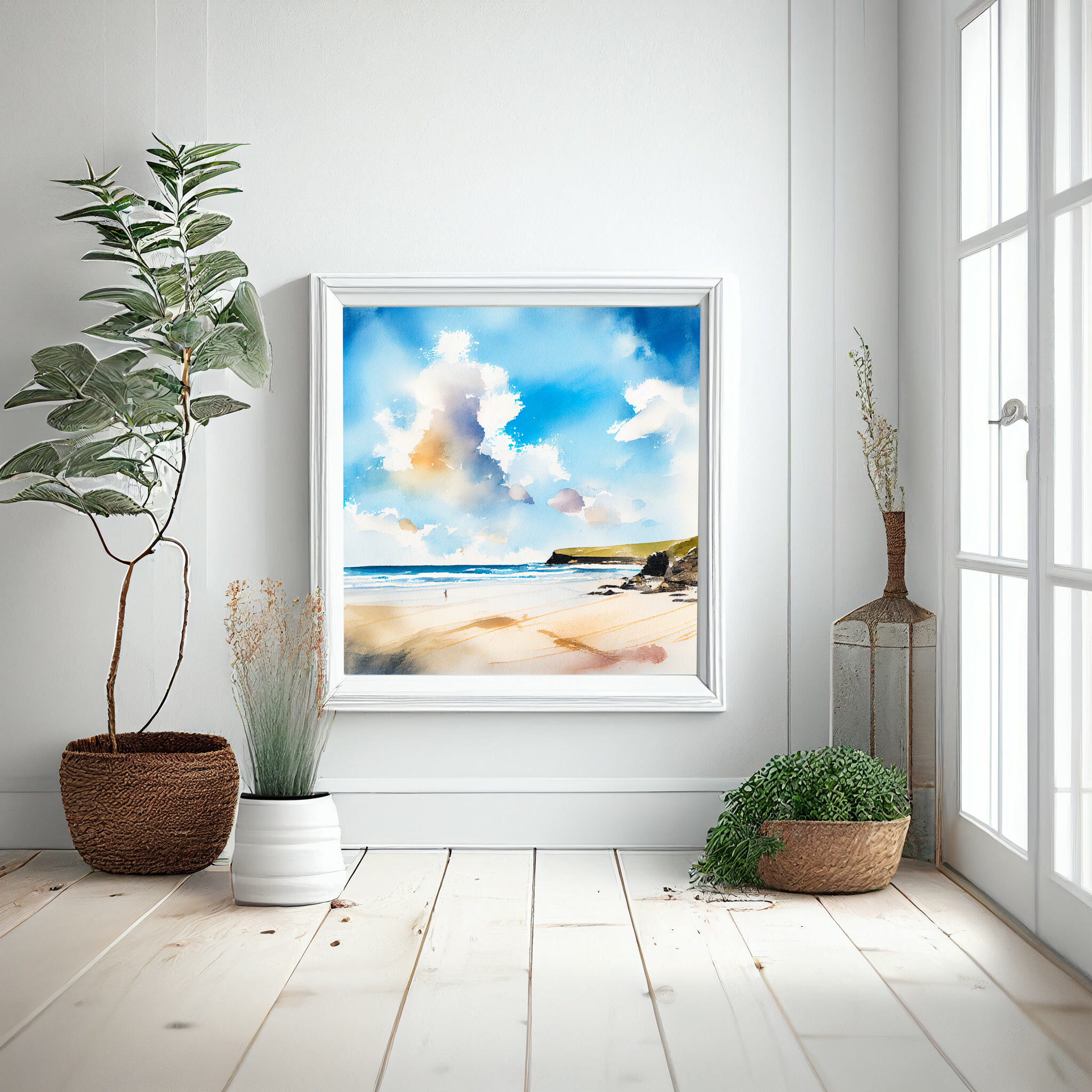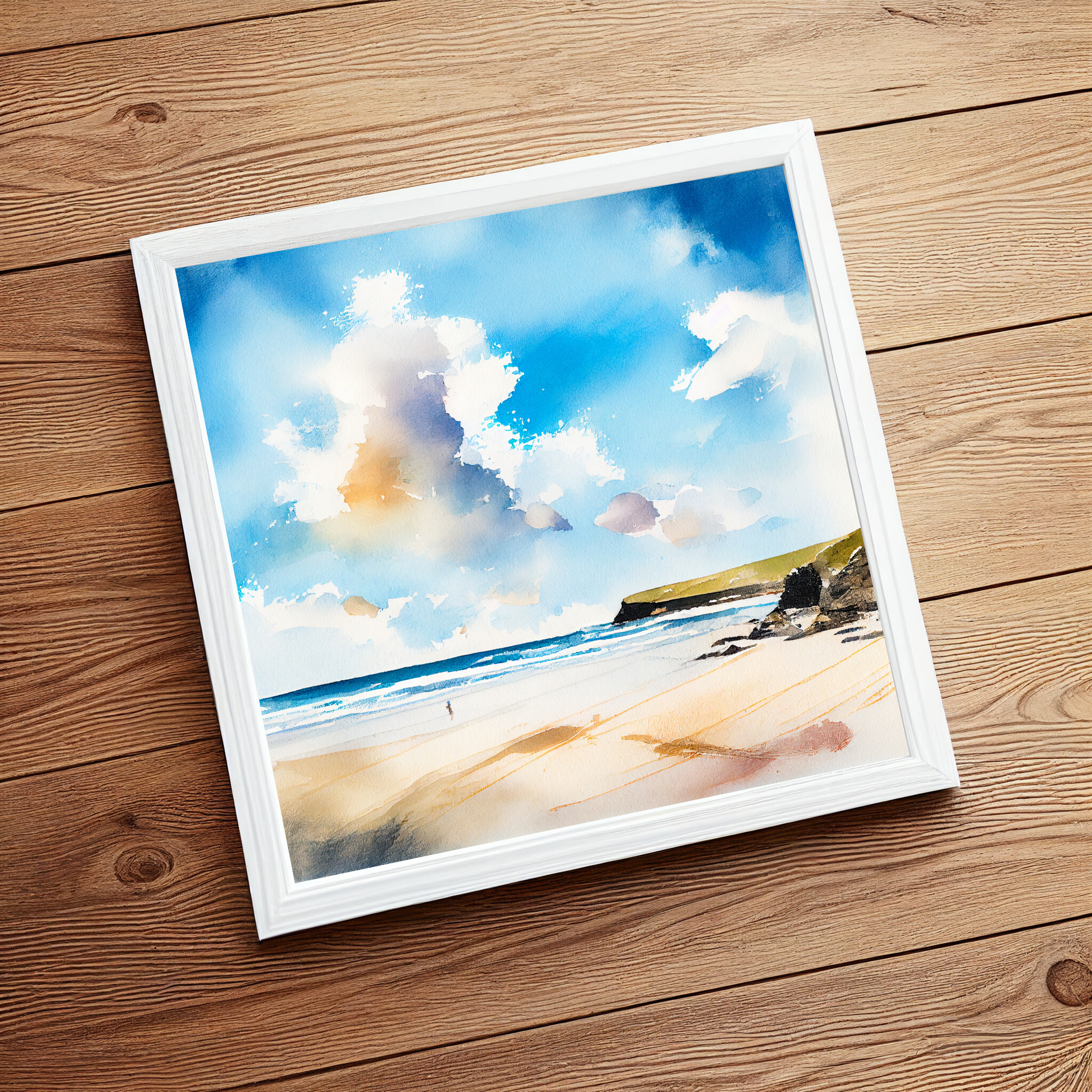 This stunning watercolor captures the tranquil beauty of Watergate Bay in Cornwall, with a focus on the rich blue tones of the sky and ocean. The inviting beach scene is depicted in a modern, abstract style, bringing the coastal serenity right into your home decor. Perfect for your living room or office to evoke a sense of calm and relaxation.