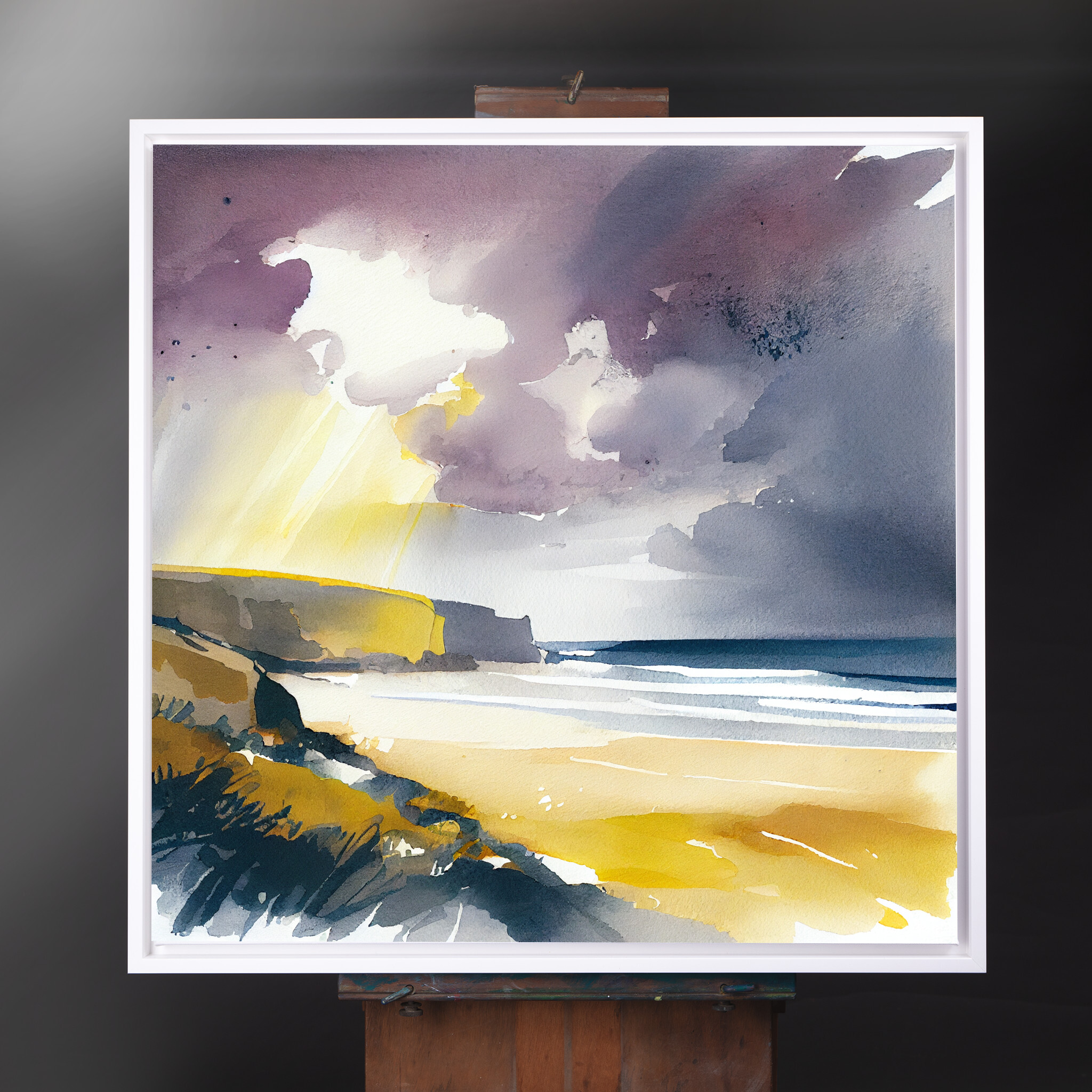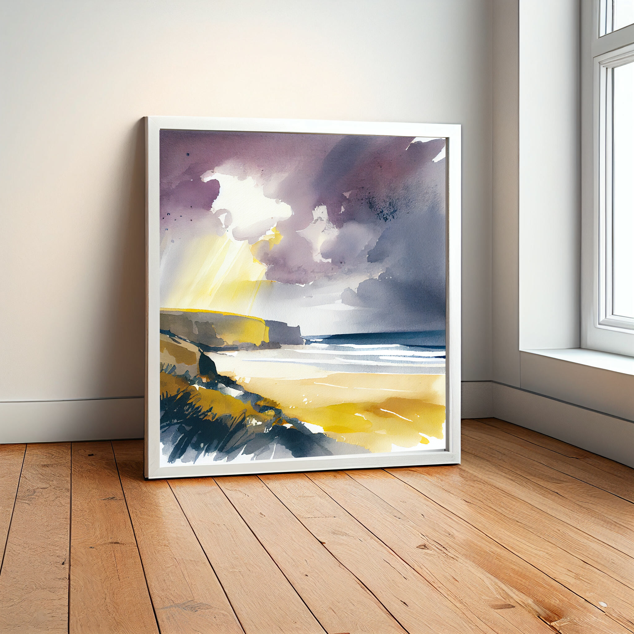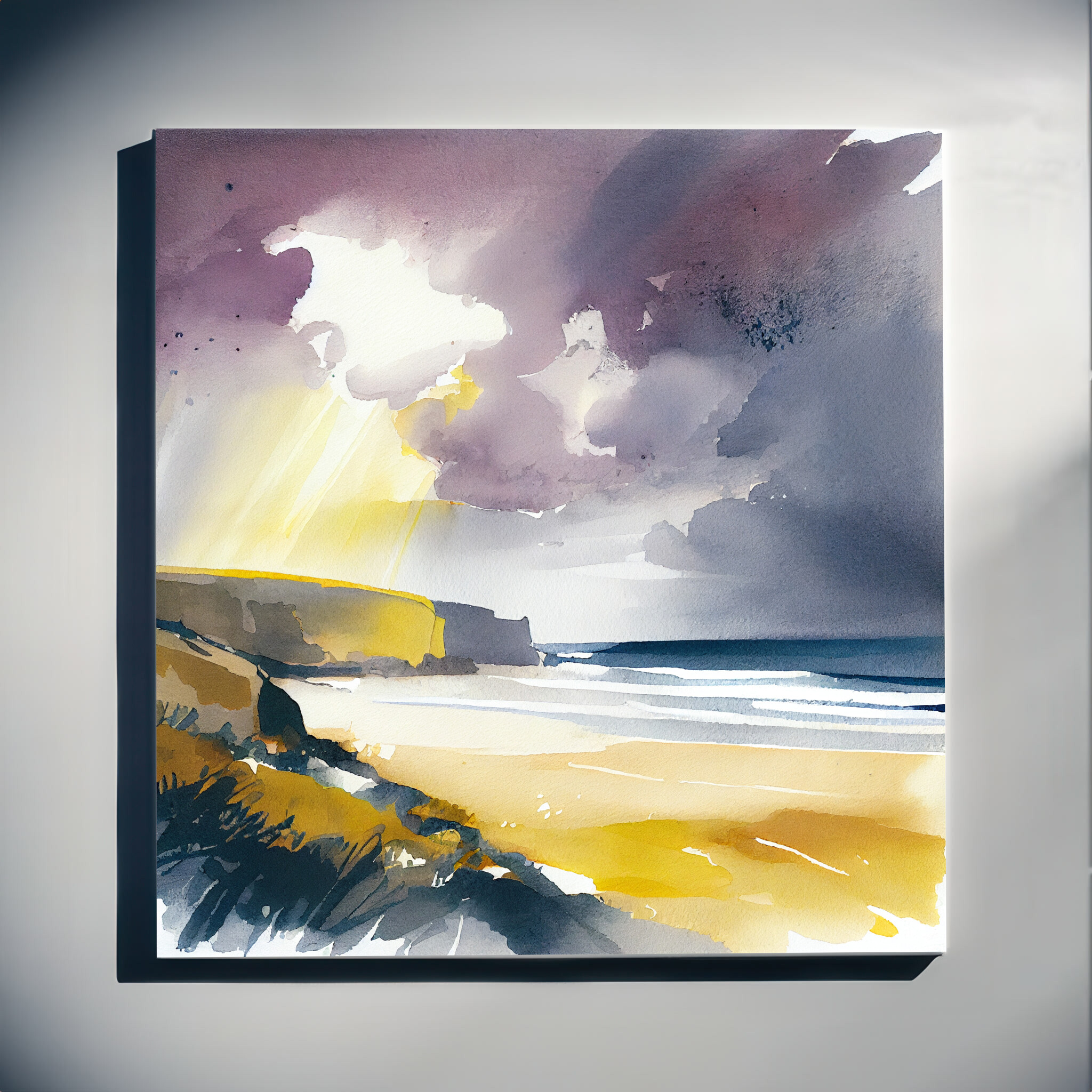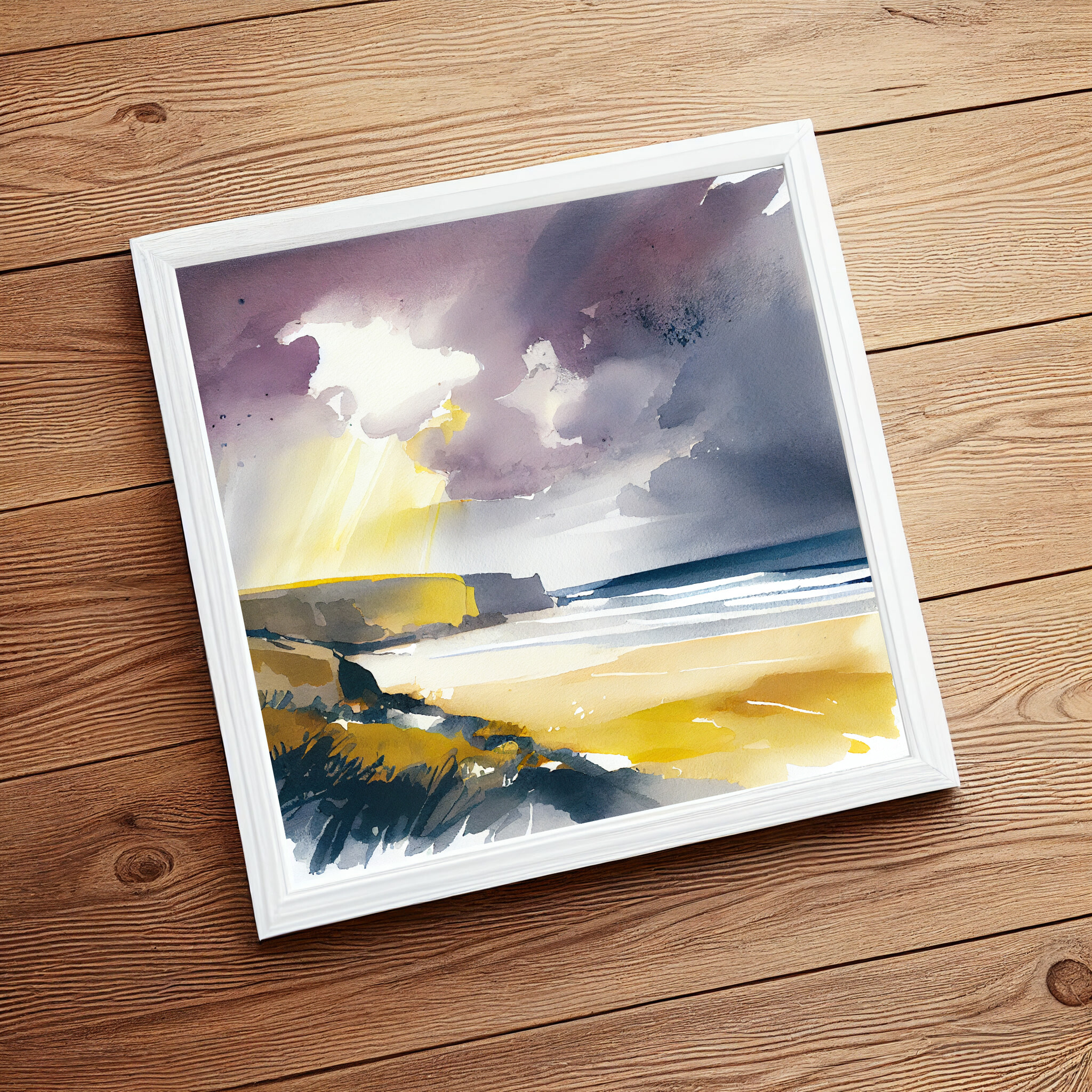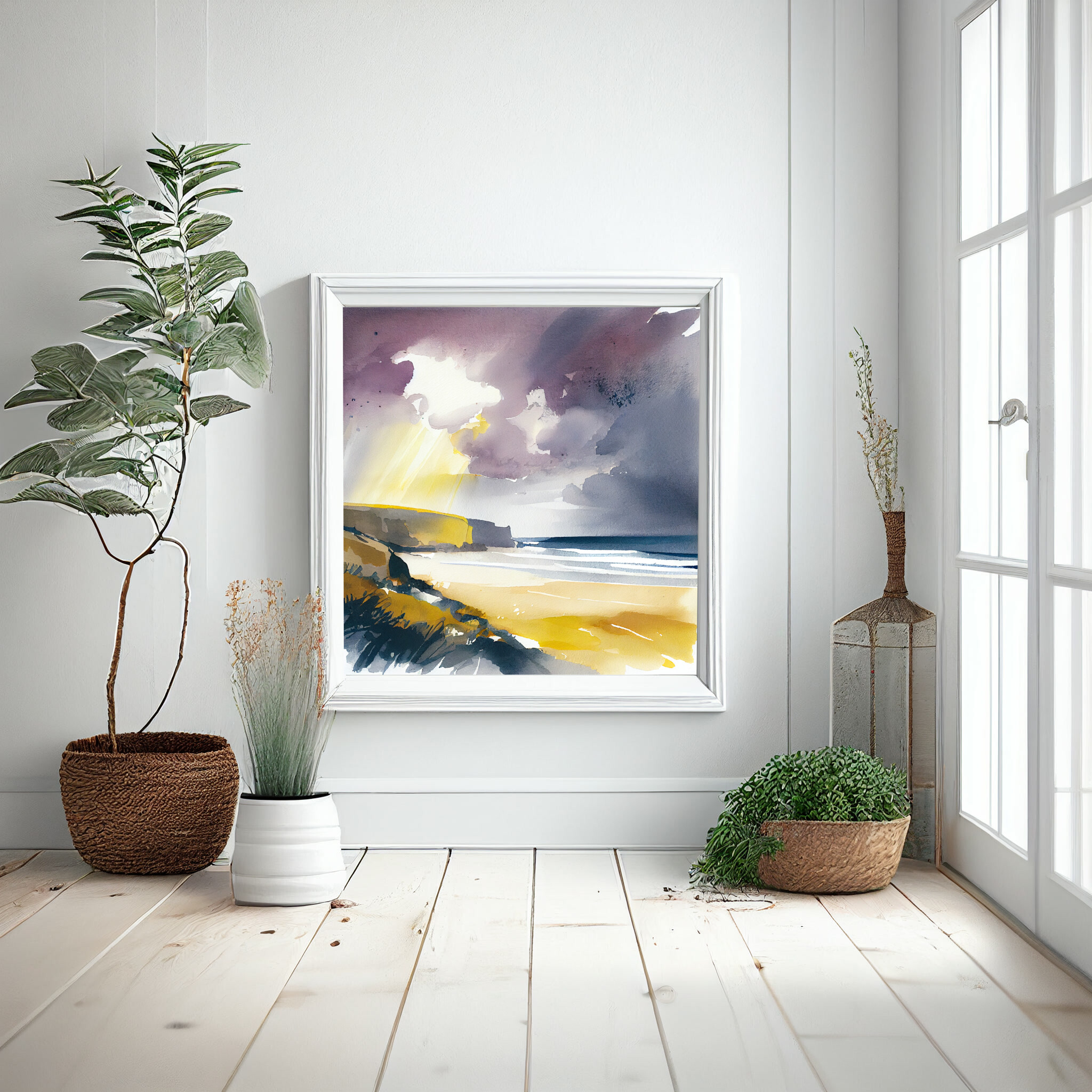 This elegant watercolor artwork beautifully captures the essence of Watergate Bay in Cornwall. The scene depicts a mesmerizing landscape with cool blue tones of the ocean set against warm earth tones of the surrounding cliffs and beaches, creating a stunning coastal vista. This serene composition evokes a sense of peace and tranquility, perfect for transforming your living room or office into a coastal haven. The artwork’s graceful flow and soothing colors make it an ideal piece for anyone who appreciates fine home decor or peaceful landscapes. Ideal as a housewarming or art lover gift, this piece becomes a cherished addition to any collection. Offered in a variety of formats including prints, framed art, and gallery-wrapped canvas, consider it as the perfect finishing touch for those seeking serenity in a coastal landscape setting.