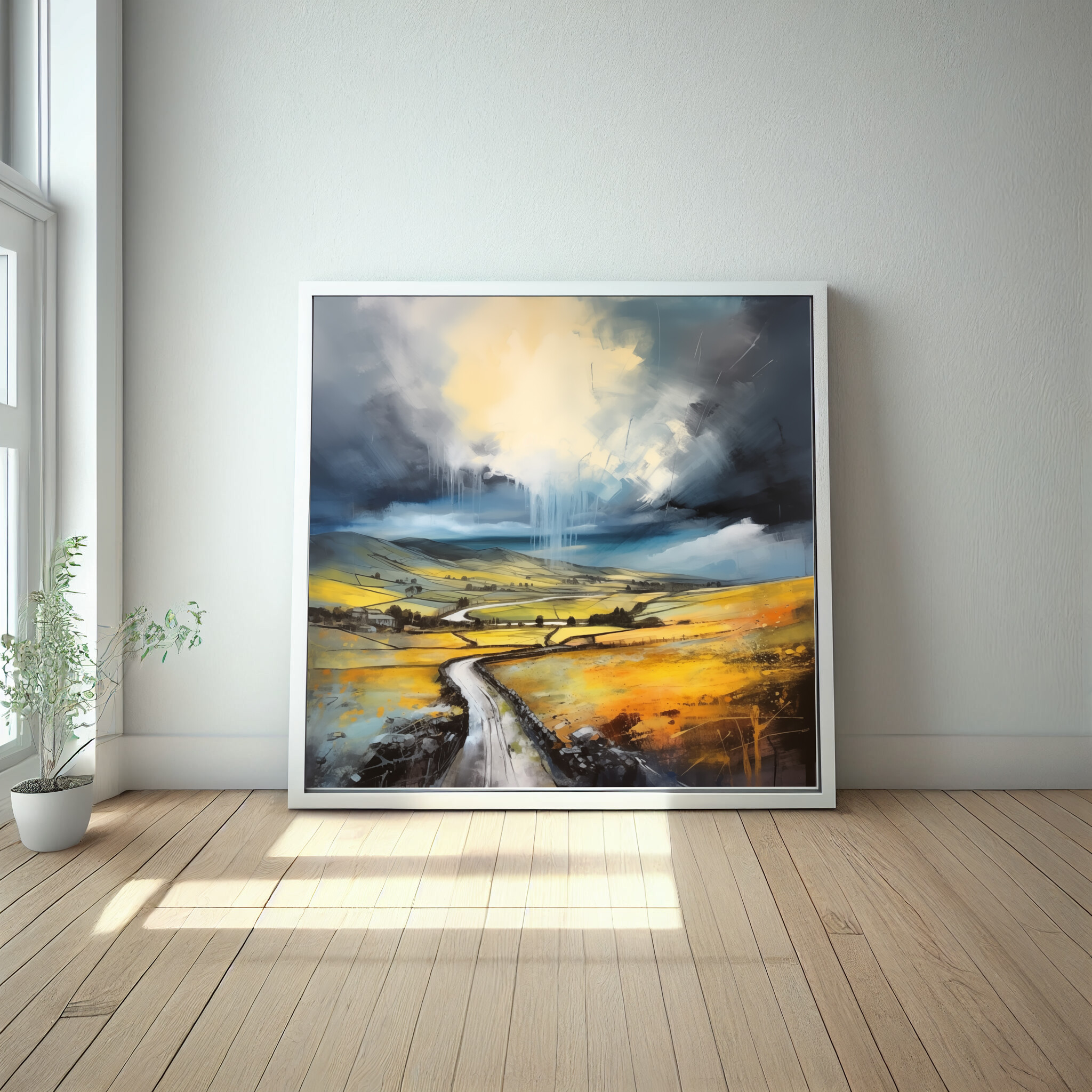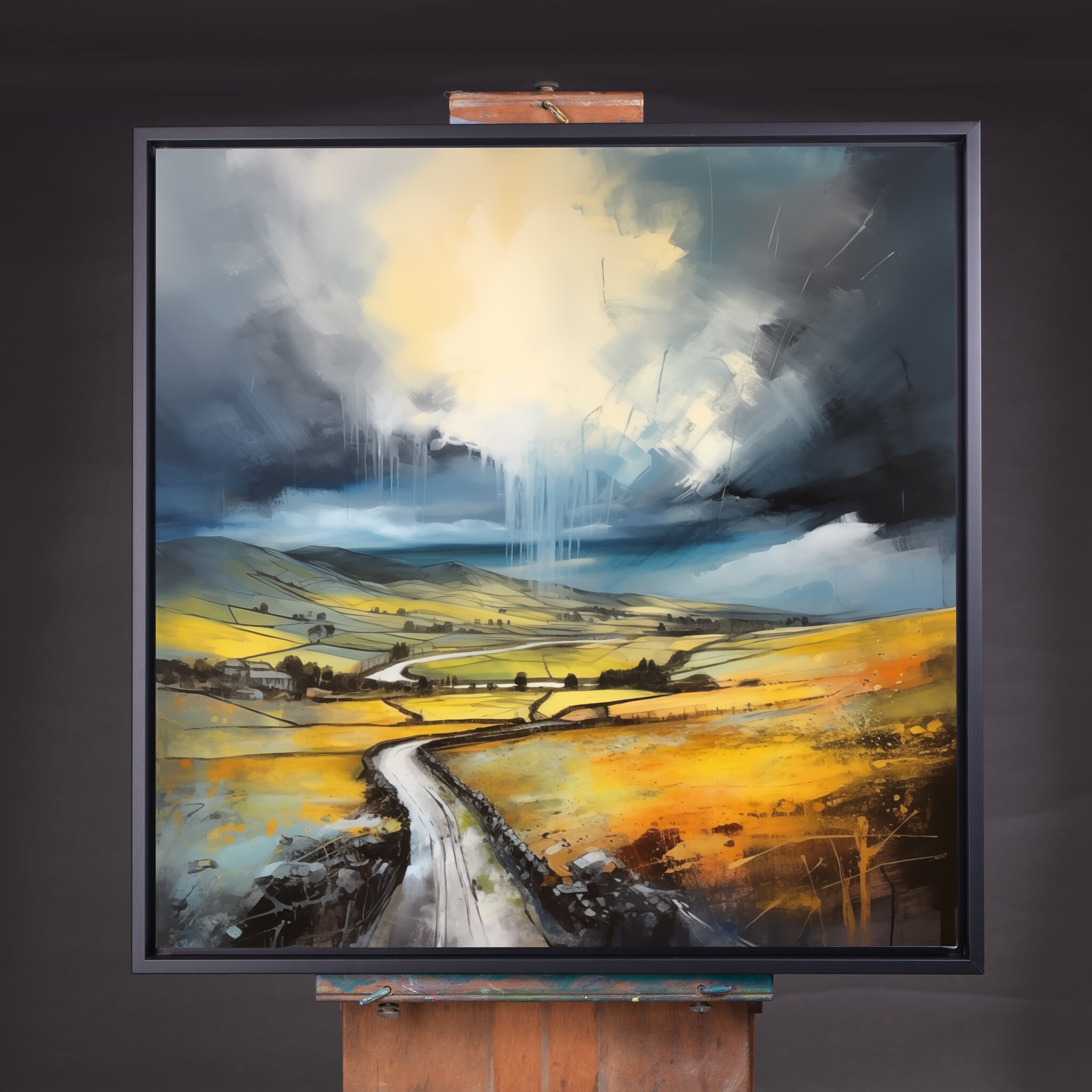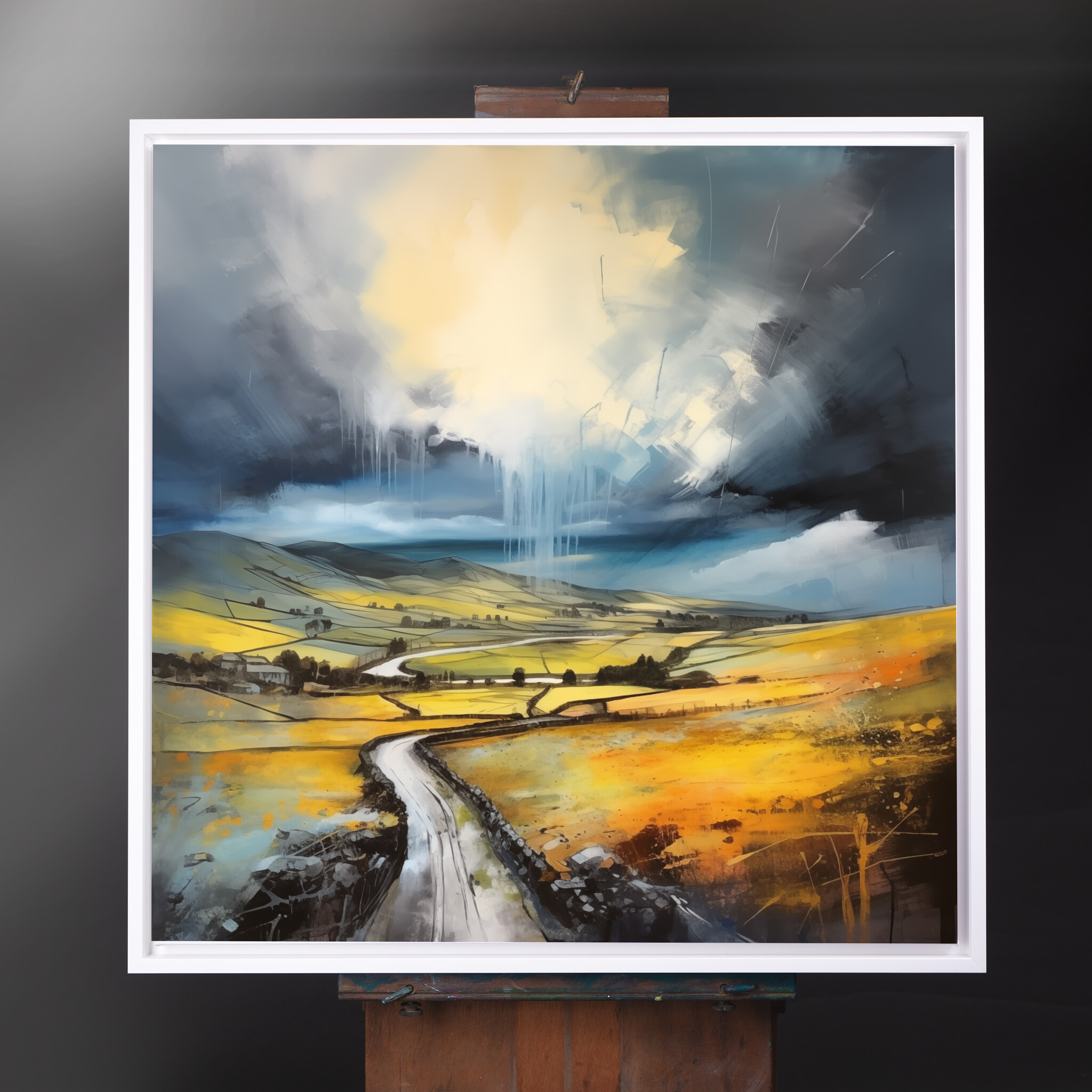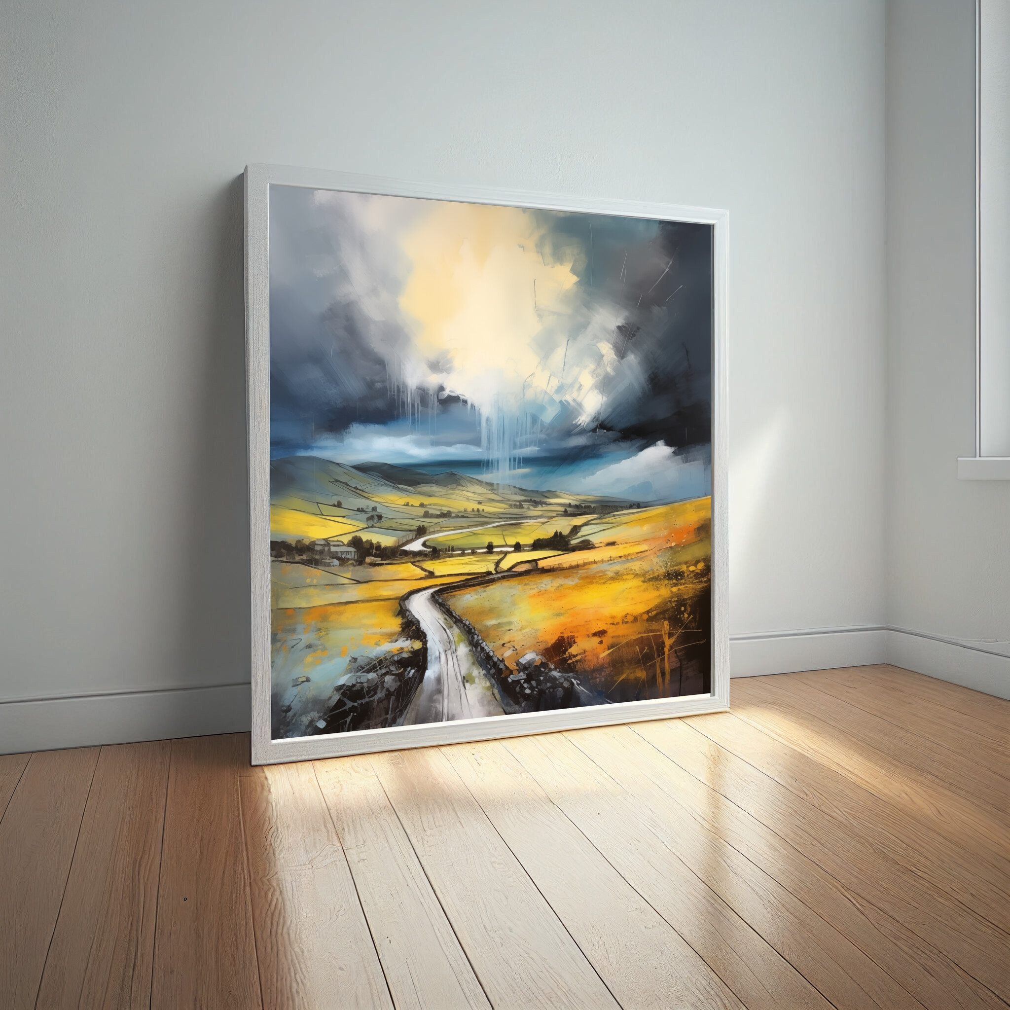 Experience the captivating beauty of the Yorkshire Dales in this abstract landscape. The artwork showcases vibrant yellow tones that sweep across the canvas, underpinned by dramatic, cloudy skies, creating a dynamic and engaging piece. The style encapsulates the essence of abstract art, inviting viewers to explore its rich textures and details.