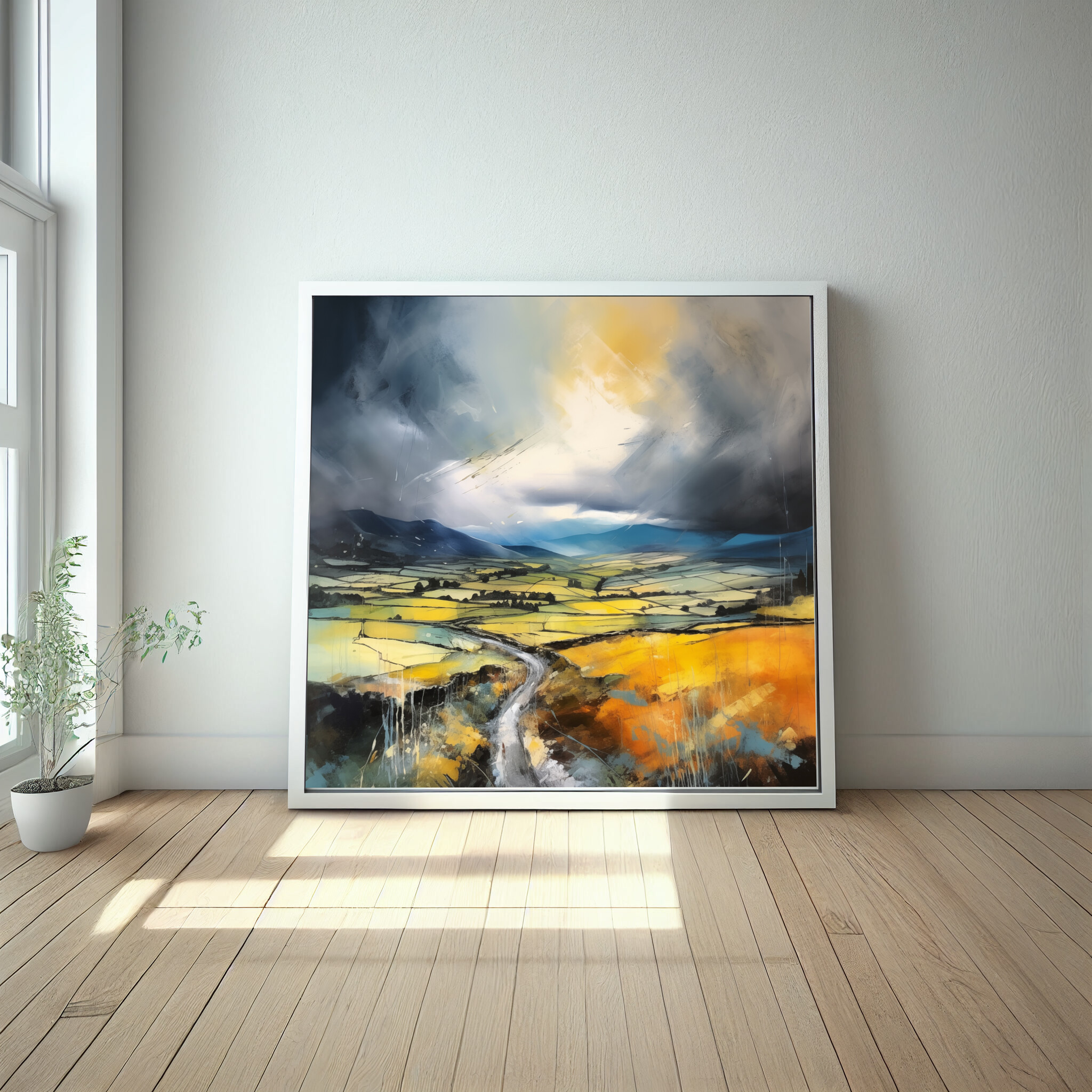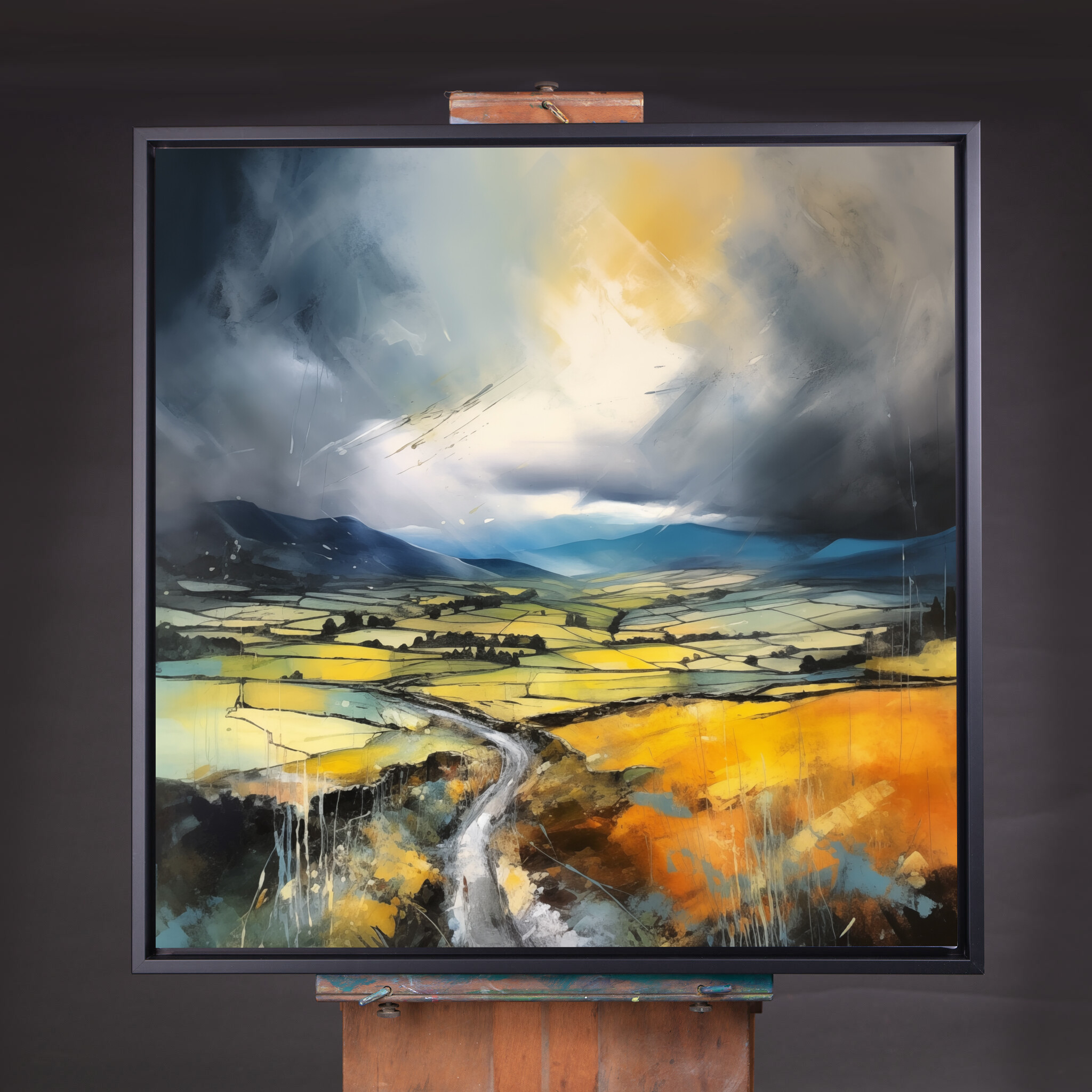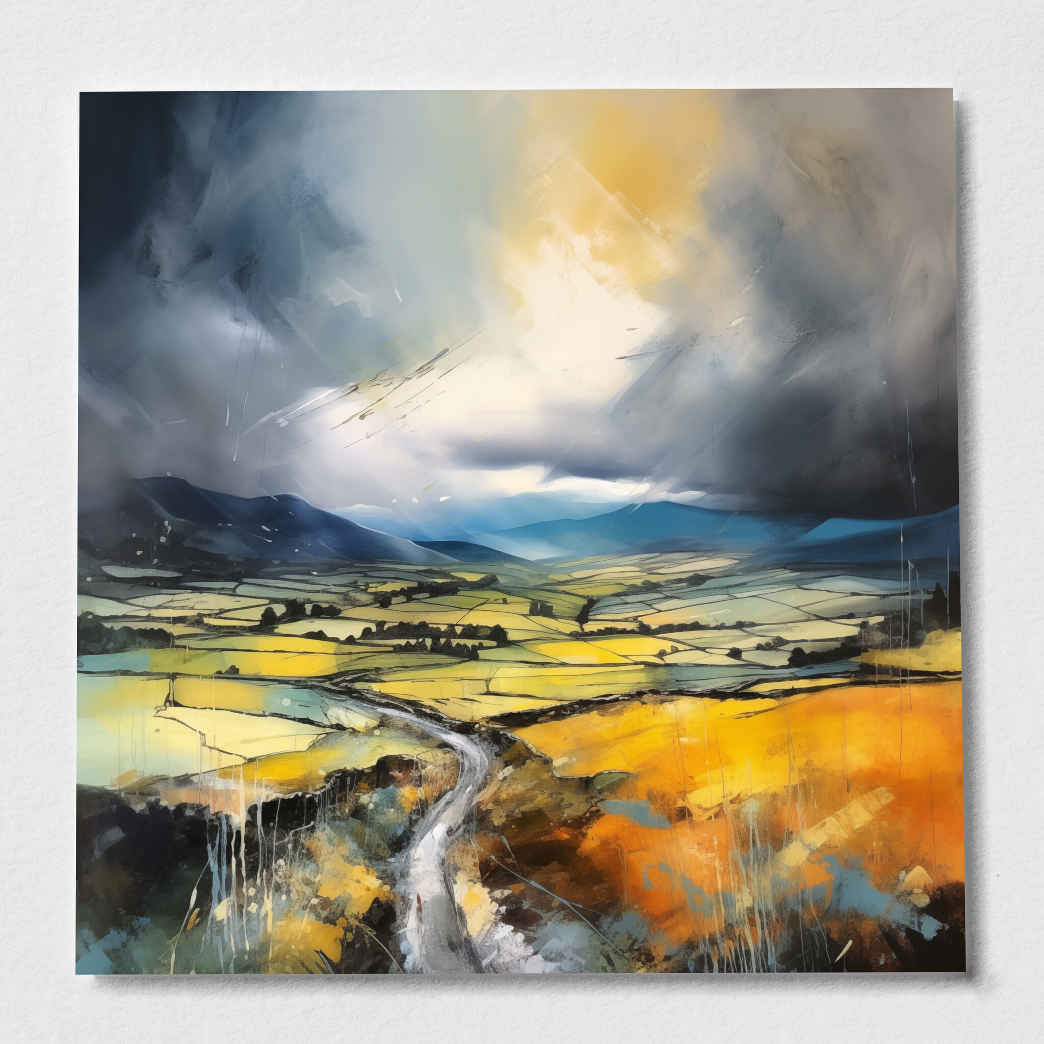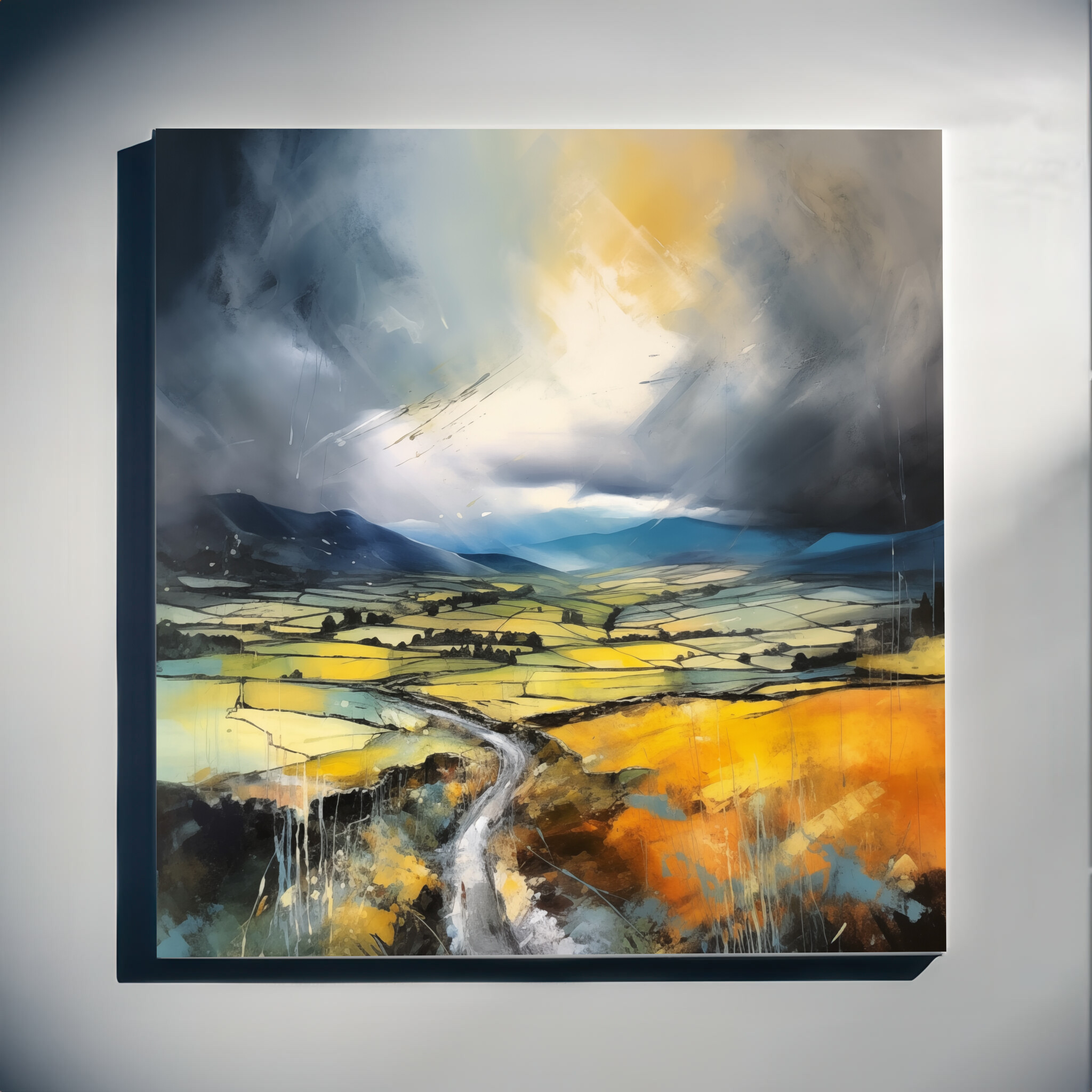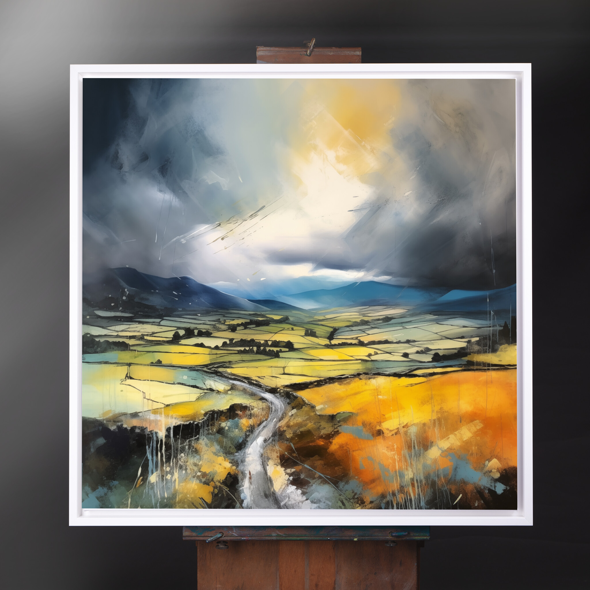 This stunning impressionist painting captures the dynamic beauty of the Yorkshire Dales, depicted in captivating grey tones and vibrant earth tones. The artwork showcases sweeping fields under a dramatic sky, conveying a sense of depth and movement.